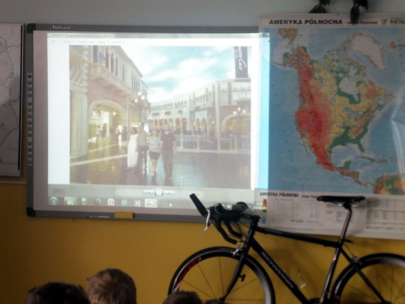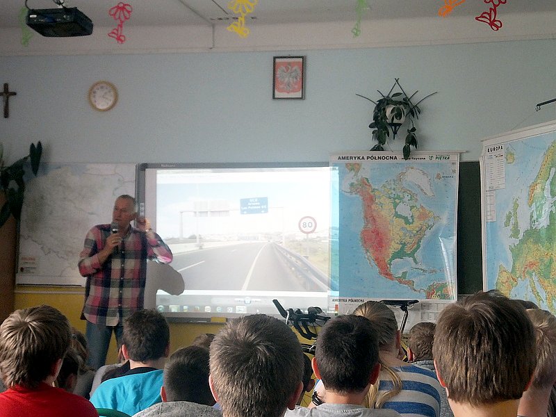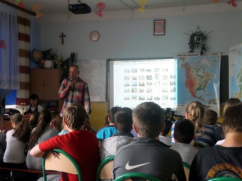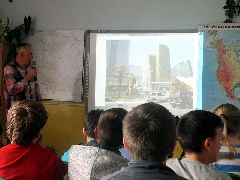 Dla uczniów wyjątkowo wartościowe było to, że słuchając barwnych opowieści o dalekich podróżach, mogli jednocześnie oglądać liczne slajdy, na których zostały uwiecznione wyjątkowe miejsca, barwni mieszkańcy USA. Pan Jan często przypominał sobie zabawne sytuacje, których był świadkiem, więc i śmiechu było co niemiara. Po godzinnej prezentacji przyszedł czas na zadawanie pytań. Było ich bardzo dużo. Na wszystkie nasz podróżnik odpowiadał z chęcią.