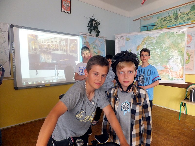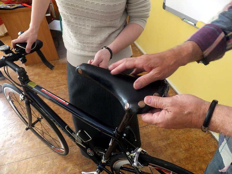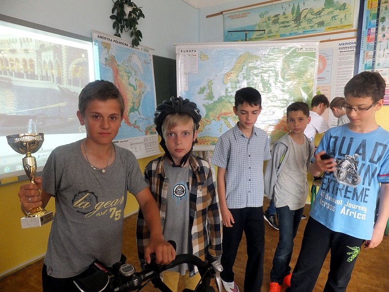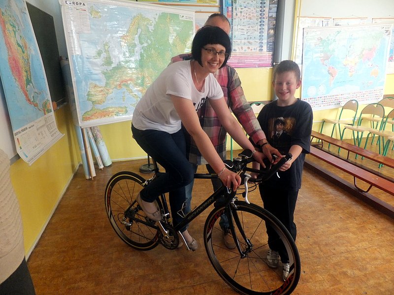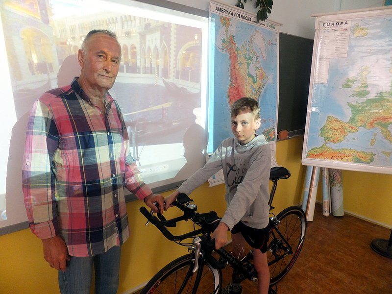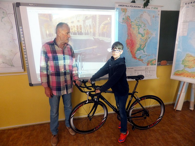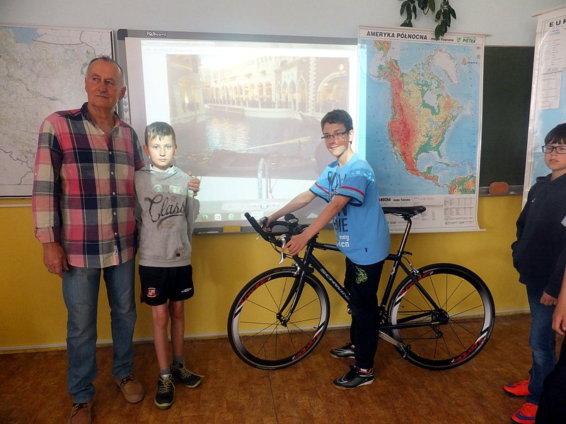 Na zakończenie Pan Jan pokazał nam liczne trofea, medale, sygnet dla ŻELAZNEGO CZŁOWIEKA - nagrody w zawodach za pokonanie w ciągu 21 godzin dystansu 200 km biegiem i rowerem. W trakcie przerw dużym zainteresowaniem cieszył się również rower, który jest specjalnie skonstruowany do pokonywania długich tras. Niektórzy mogli poczuć przedsmak przygody, siadając na nim i pokonując króciutki dystans.
