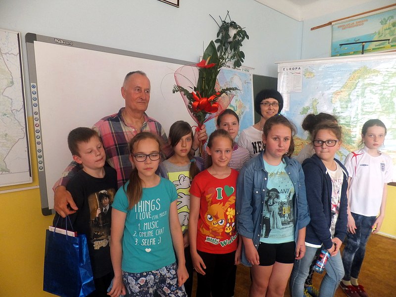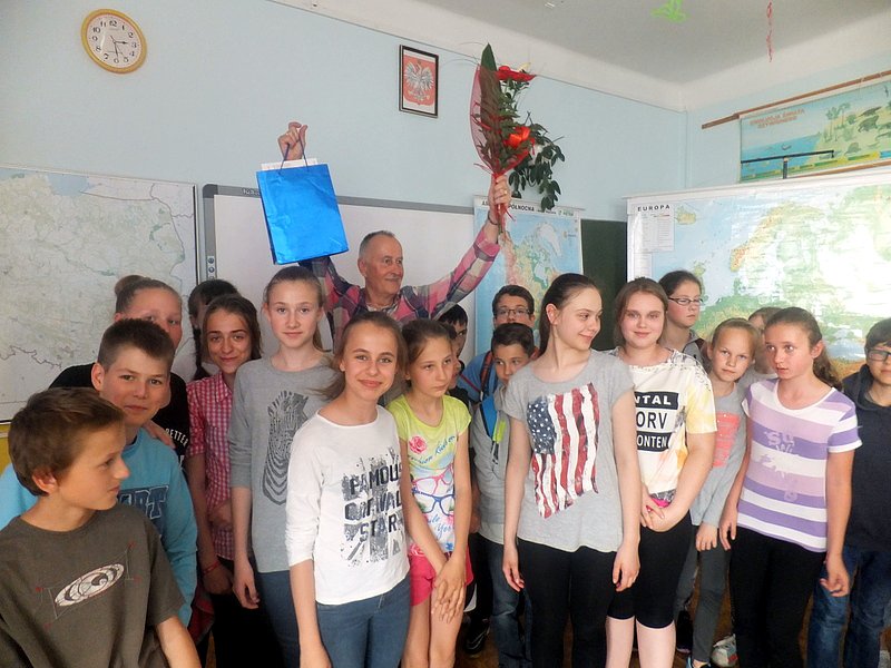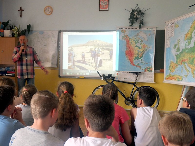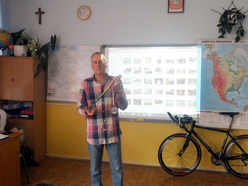 Dnia 26 maja w naszej szkole odbyło się spotkanie ze sławnym hrubieszowianinem – panem Janem Zderkiewiczem. ŻELAZNY CZŁOWIEK, sportowiec, maratończyk, podróżnik i rekreacyjny kolarz snuł swoją opowieść w sali 102, w której zgromadzili się uczniowie z klas piątych, szóstych i z IVa. Były nauczyciel zaczął od opowieści o czasach dzieciństwa, by po chwili stwierdzić, że tak naprawdę pasja sportowo- rekreacyjno - turystyczna zaczęła dawać znak o sobie dopiero w 2001 r. Pierwsze wyprawy na rowerze Pan Jan odbył po Hrubieszowszczyźnie.