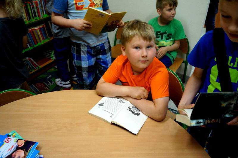 Po filmie „Sekret Eleonory” każdy uczeń chętnie przeniósł się do czytelni, by, jak za sprawą czarodziejskiej różdżki, dodać siły, blasku i koloru bohaterom, czytając kilka wersów wybranej książki. Przy okazji udało się obejrzeć wystawę pocztówek ze zbioru pana Jana Kalisza – kolekcjonera, emerytowanego nauczyciela, harcerza i hrubieszowskiego reginalistę, autora licznych książek. Tytułowe hasło wystawy „Dzieci – najpiękniejsze kwiaty” naturalnie wiązało się z wydarzeniem zespołu klasowego z poprzedniego dnia – obchodami Dnia Dziecka. Z tej okazji każdy maluch przyjął piękne dedykacje, zamieszczone na pierwszej stronie podarowanej książki.