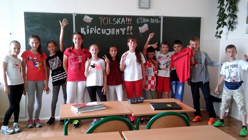 We wtorek 21 czerwca cała Polska trzymała kciuki za naszych zawodników na EURO, którzy mieli zagrać mecz piłki nożnej z Ukrainą. W tak ważnej chwili nie mogło zabraknąć „12 zawodnika” również w naszej szkole. W tym dniu klasa IV „a”, jak przystało na „sportówkę”, przyszła do szkoły ubrana w barwy narodowe, pokazując jedność z piłkarzami i wszystkimi kibicami. Wszyscy zamierzaliśmy obejrzeć wieczorny mecz. Ku naszej radości Polacy wygrali. Wierzymy, że jako kibice dołożyliśmy małą cegiełkę do tego sukcesu.