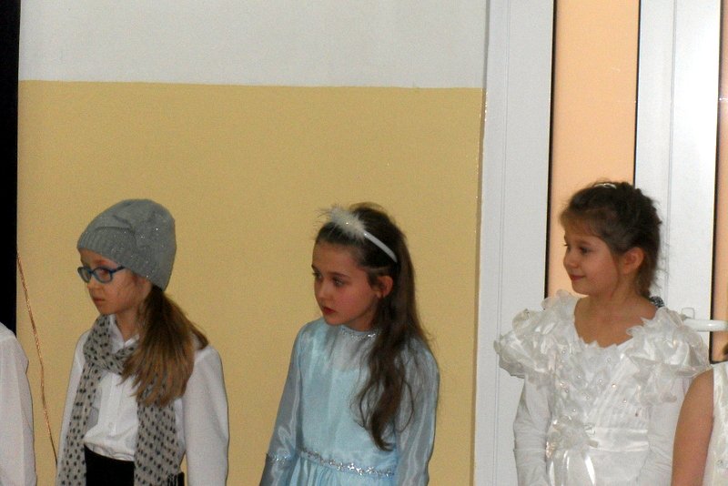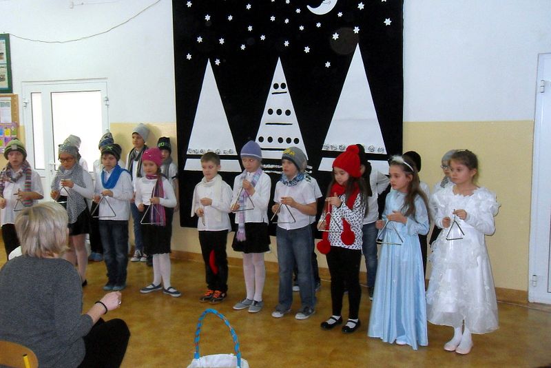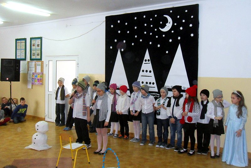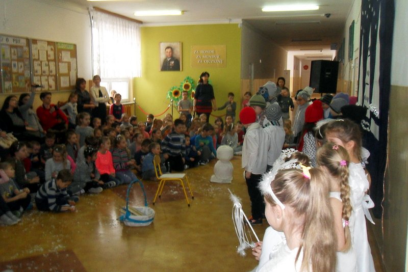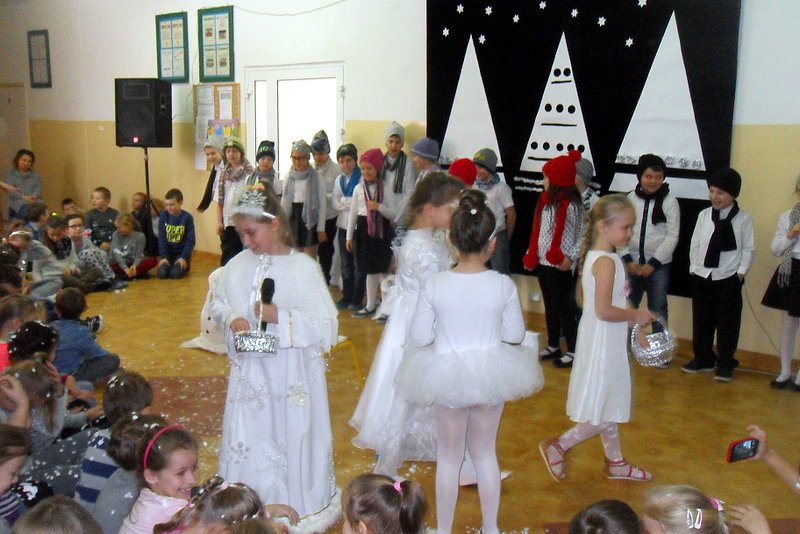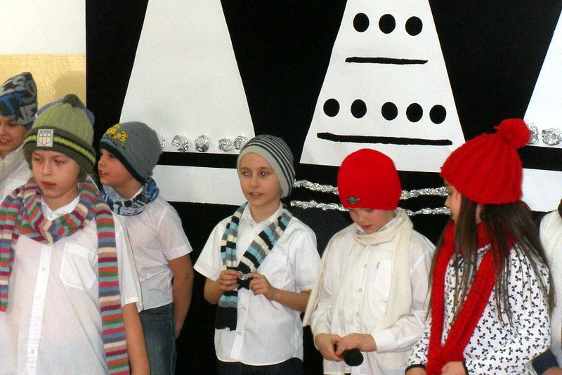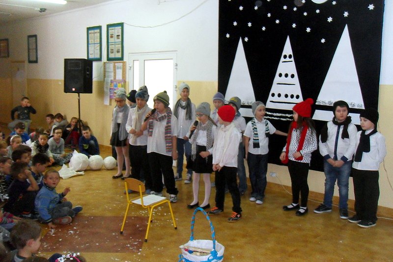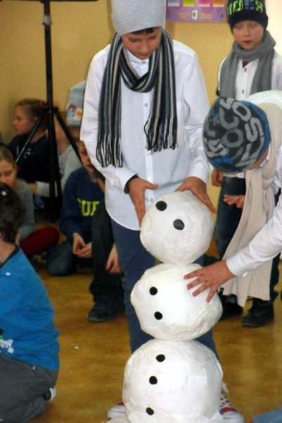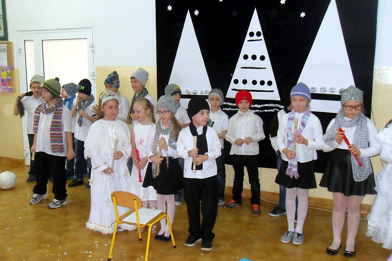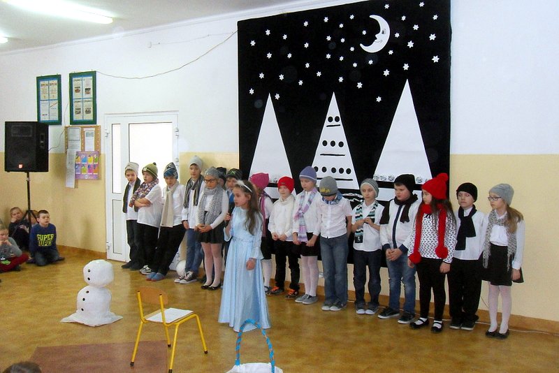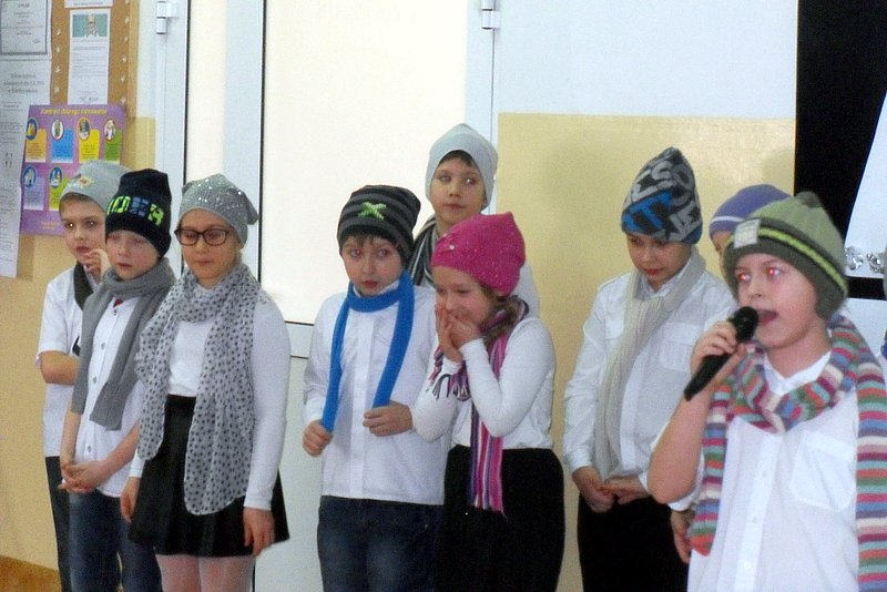 Podczas występu mali aktorzy w wierszykach i piosenkach, przedstawili wiele istotnych wskazówek dotyczących bezpiecznej zabawy w czasie zimy. Dzieci zagrały też na fletach dobrze znaną wszystkim melodię do piosenki pt. „Dzwonki sań”. Publiczność nagrodziła artystów gromkimi brawami. Na koniec wszyscy uczniowie zarówno na scenie jak i też przed nią zaśpiewali wspólnie piosenkę „Śniegowy bałwanek”.