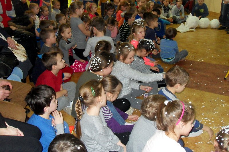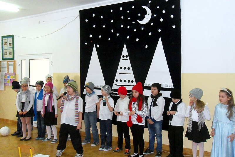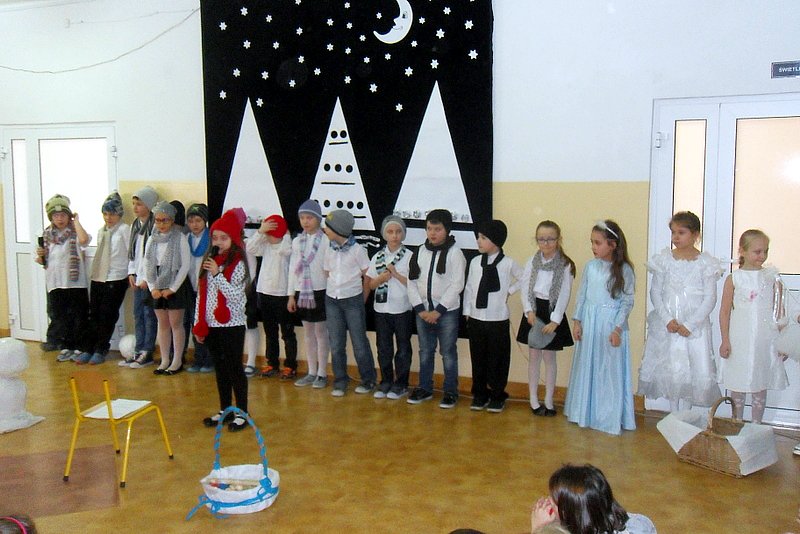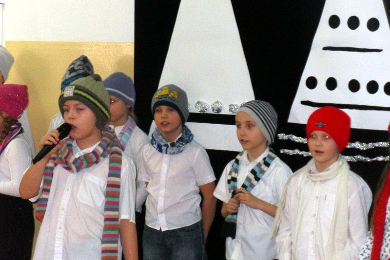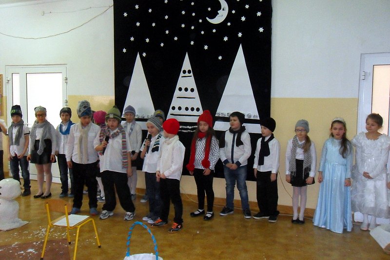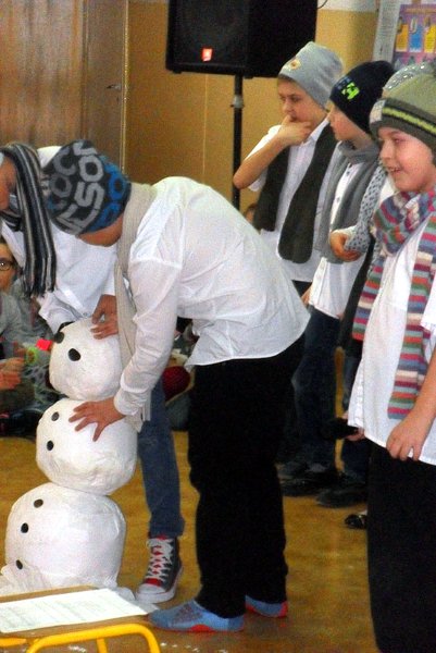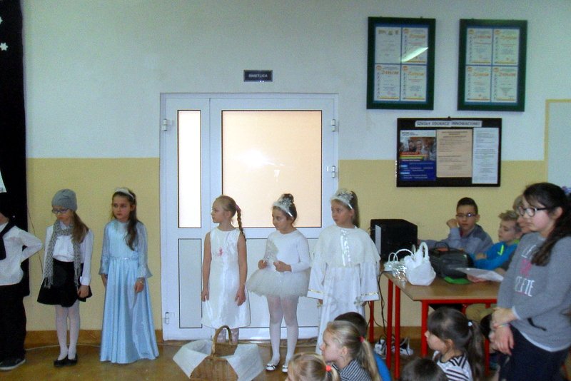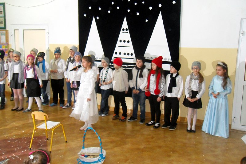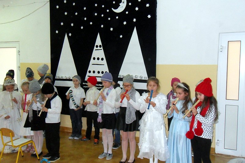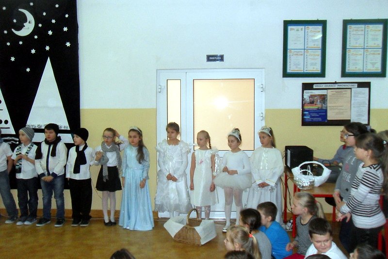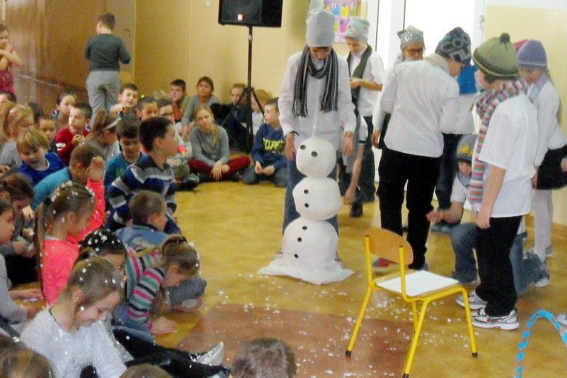 Podczas występu mali aktorzy w wierszykach i piosenkach, przedstawili wiele istotnych wskazówek dotyczących bezpiecznej zabawy w czasie zimy. Dzieci zagrały też na fletach dobrze znaną wszystkim melodię do piosenki pt. „Dzwonki sań”. Publiczność nagrodziła artystów gromkimi brawami. Na koniec wszyscy uczniowie zarówno na scenie jak i też przed nią zaśpiewali wspólnie piosenkę „Śniegowy bałwanek”.