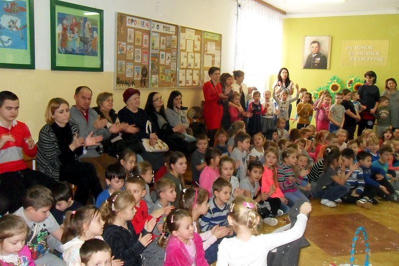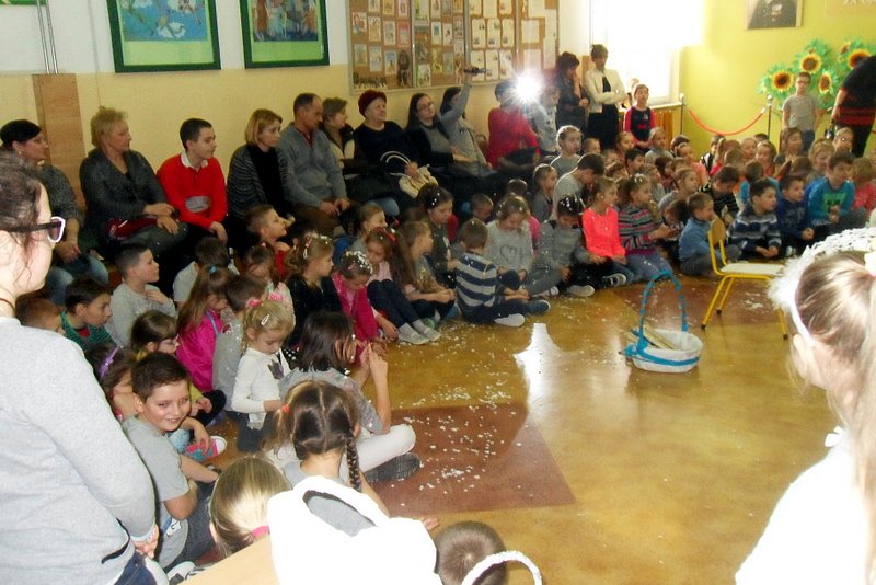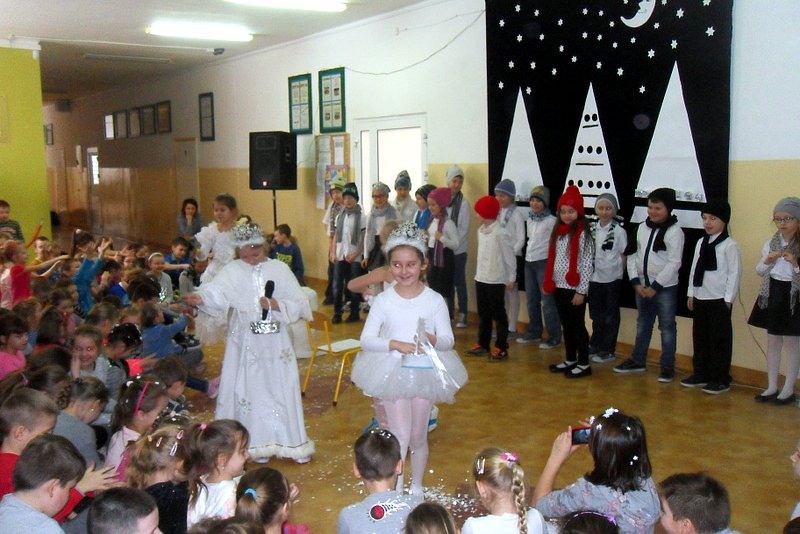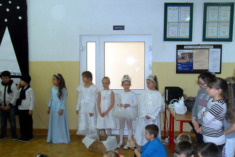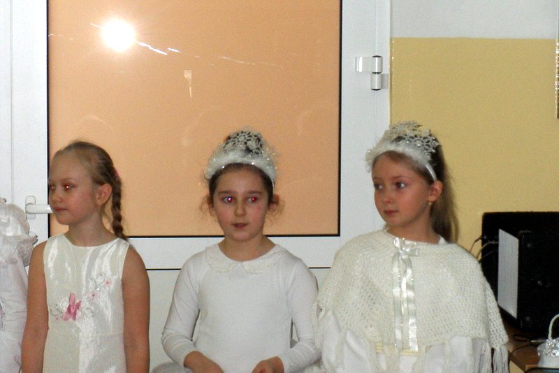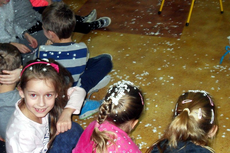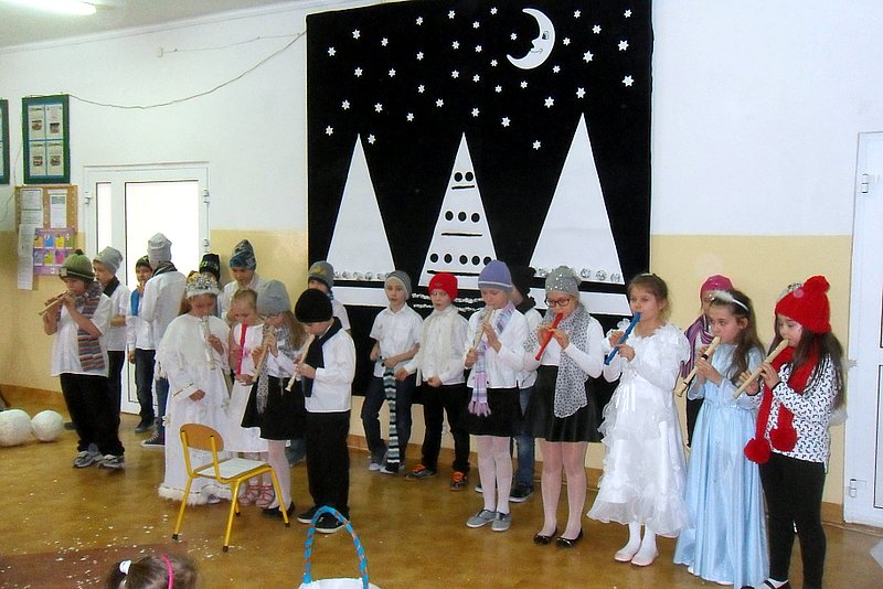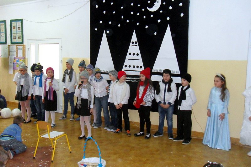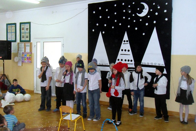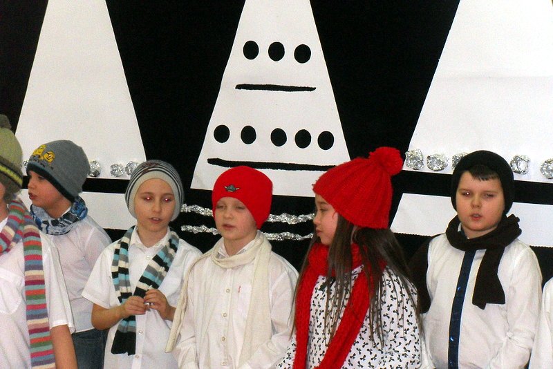 Podczas występu mali aktorzy w wierszykach i piosenkach, przedstawili wiele istotnych wskazówek dotyczących bezpiecznej zabawy w czasie zimy. Dzieci zagrały też na fletach dobrze znaną wszystkim melodię do piosenki pt. „Dzwonki sań”. Publiczność nagrodziła artystów gromkimi brawami. Na koniec wszyscy uczniowie zarówno na scenie jak i też przed nią zaśpiewali wspólnie piosenkę „Śniegowy bałwanek”.
