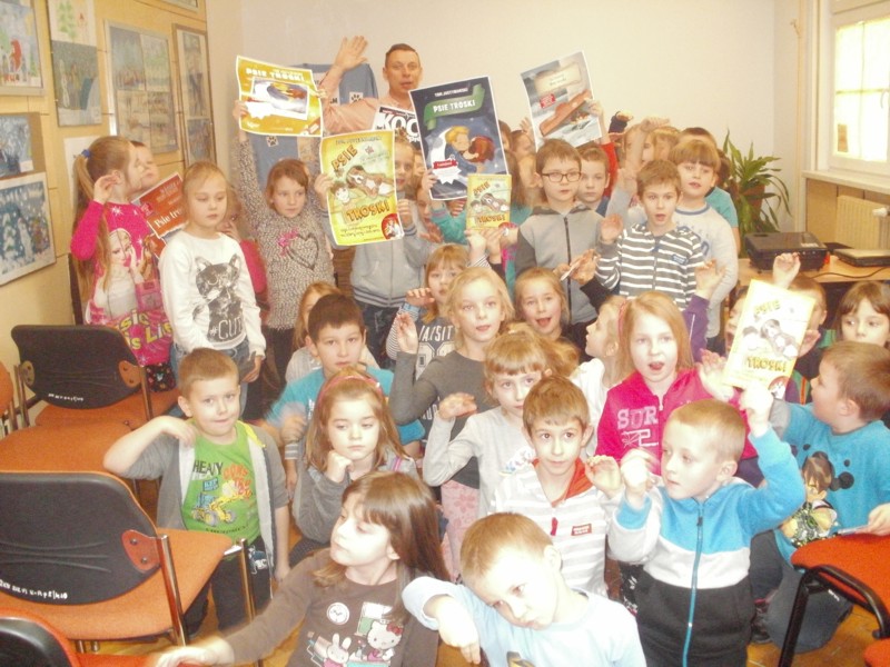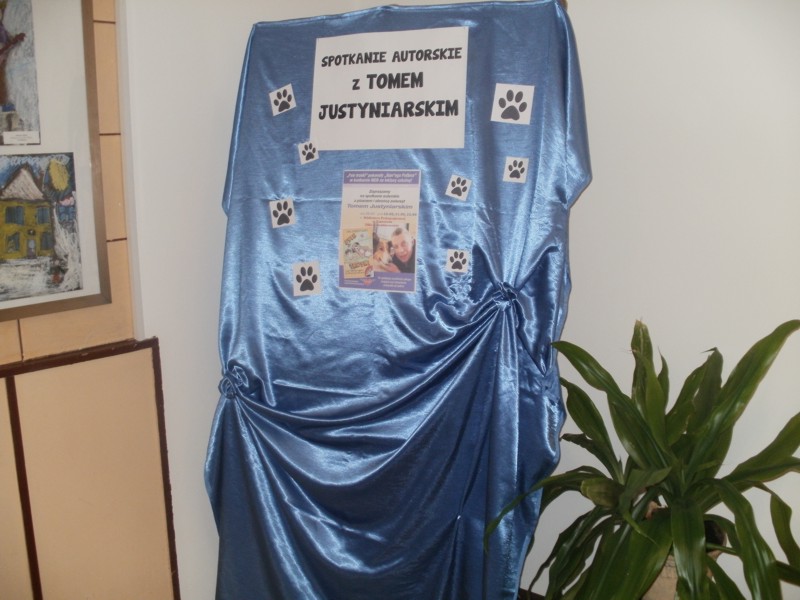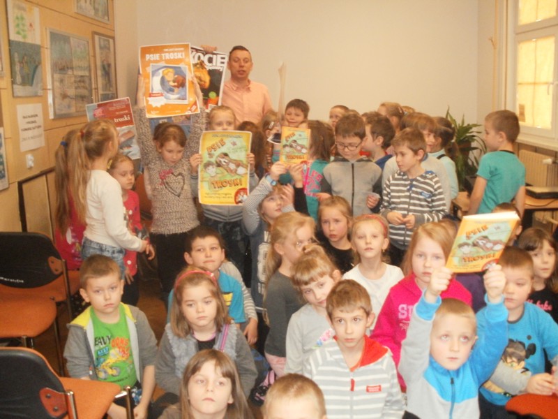 Dnia 26 stycznia uczniowie klas I a, I b, I d wybrali się do Biblioteki Pedagogicznej na spotkanie z pisarzem Tomem Justyniarskim. Pisarz opowiedział dzieciom o swojej książce "Psie troski", mówiącej o przyjaźni chłopca i psa ze schroniska. Tom Justyniarski jest nie tylko pisarzem, ale również rzecznikiem Obrony Zwierząt RP.