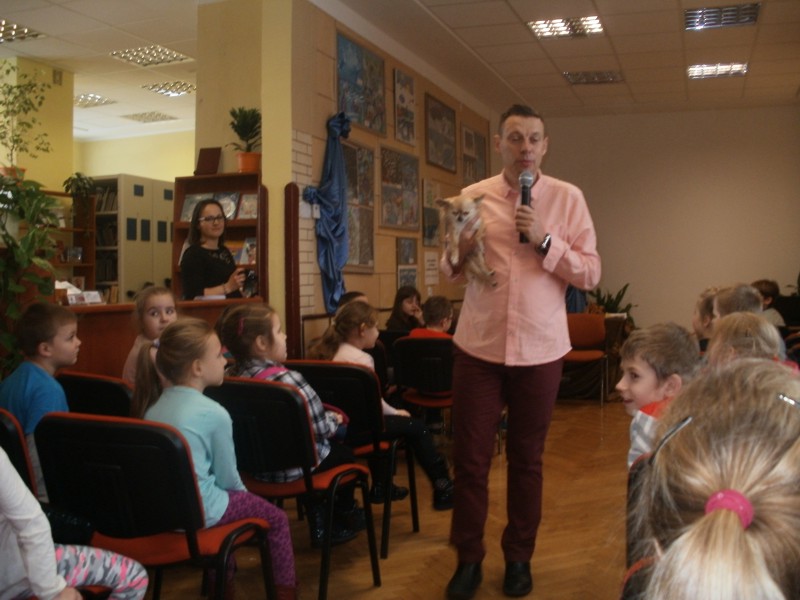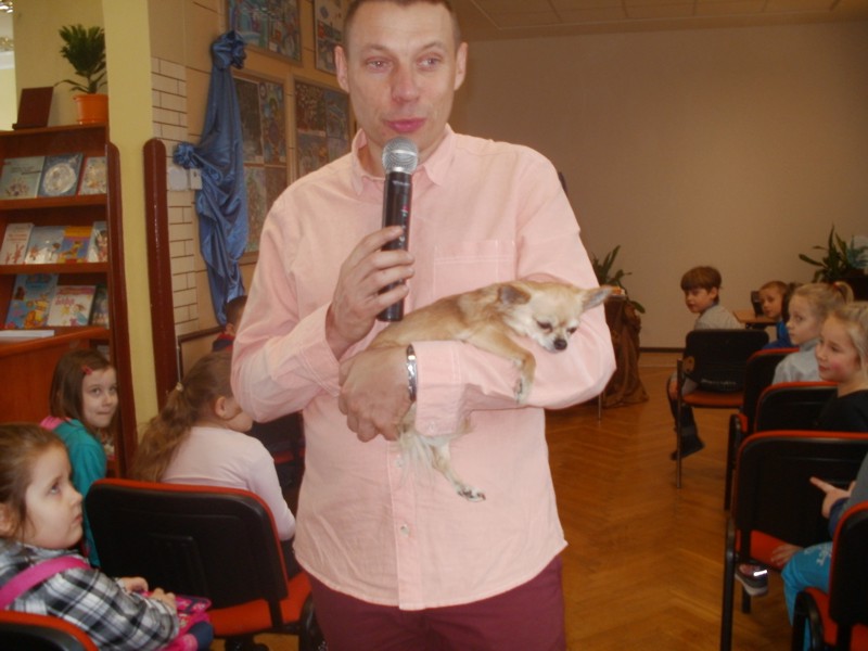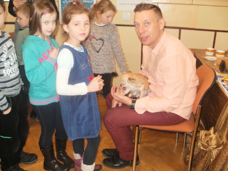 Na spotkanie z dziećmi przyjechał ze swoim pieskiem, który mu zawsze towarzyszy. Spotkanie z pisarzem było nie tylko lekcją przyrody ale przede wszystkim lekcją uczącą miłości do zwierząt, kochaniu ich i dbania o nie, jak o członków rodziny. Po spotkaniu dzieci miały możliwość zakupu książeczki wraz z autografem. Była to wspaniała lekcja, która na długo pozostanie w naszej pamięci.