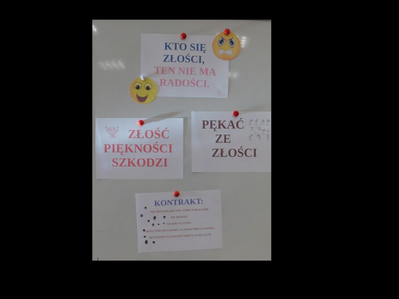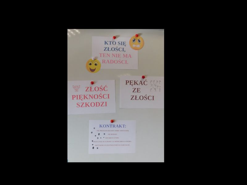 Dzieci podpisywały kontrakt palcem - pieczątką umoczonym w tuszu. Ćwiczeniem, które bardzo się dzieciom podobało było rysowanie przez Panie konturu postaci chłopca i dziewczynki na których każde dziecko zaznaczało kółkiem gdzie może mieszkać złość. Podawały propozycje jak można wypędzić złość. Pozbywały się jej gniotąc gazetę, którą wrzucały do pojemnika z napisem "papier".