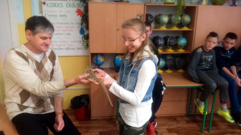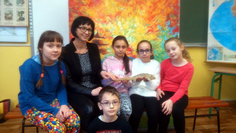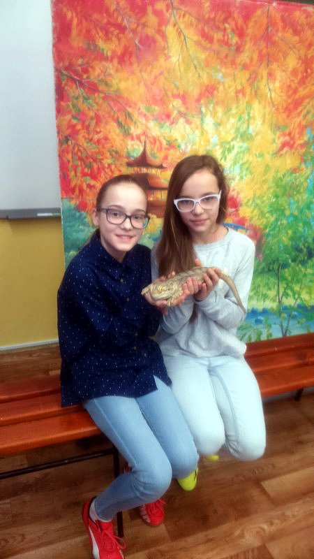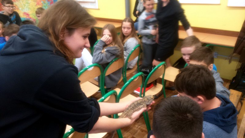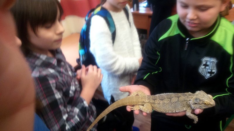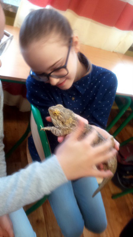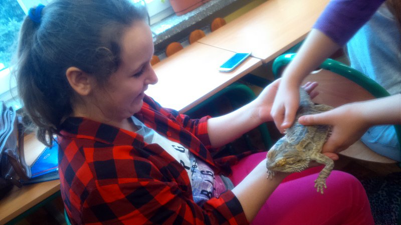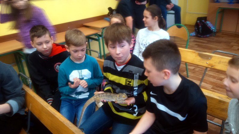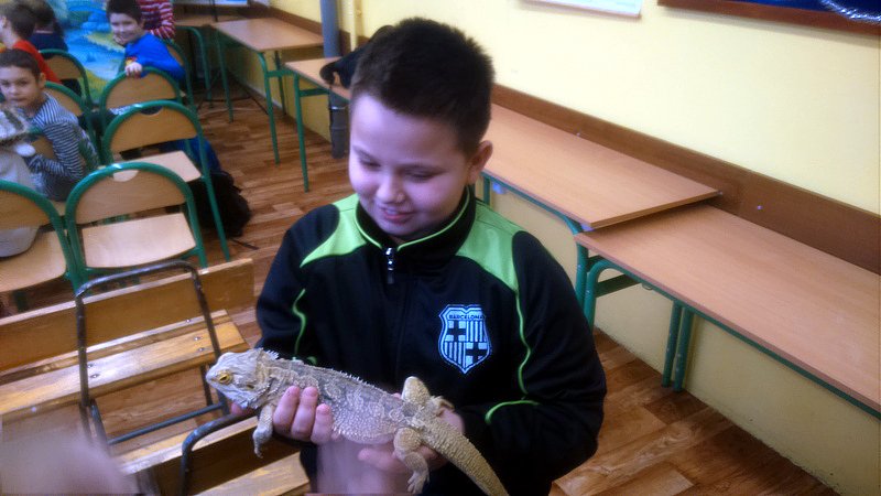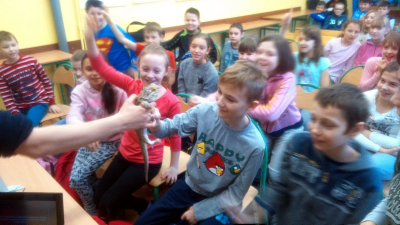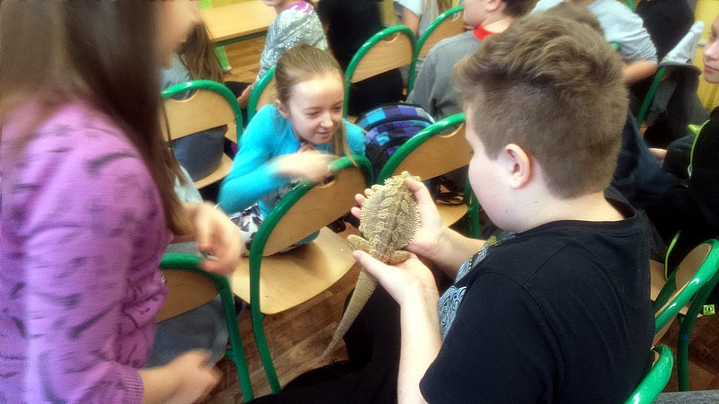 Podczas zajęć mogli poznać zwyczaje egzotycznych zwierząt. Nietypowe spotkanie z przyrodą, okazało się bardzo interesujące. Uczniowie zdobyli cenną wiedzę na temat budowy żywych organizmów, sposobu odżywiania i miejsca ich występowania. Poznali ciekawostki z życia zwierząt i najdziwniejsze cechy charakterystyczne danego gatunku. Dużą atrakcją dla uczniów i najbardziej ekscytującą częścią zajęć było spotkanie „oko w oko” z jaszczurką Agamą Brodatą, którą mogli dotknąć, pogłaskać, zrobić zdjęcie – oczywiście pod okiem ich właściciela. Przysporzyło to dzieciom wiele radości i wrażeń.