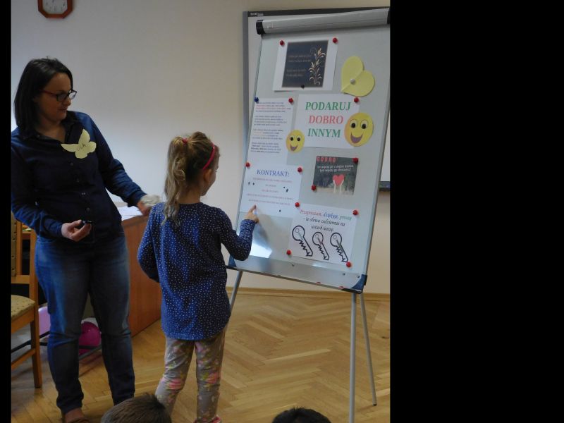 Następnie zawarły kontrakt dotyczący właściwego zachowania się podczas wspólnej zabawy odciskając ślad paluszka. Rozmawiały na temat zachowania się w stosunku do koleżanek, kolegów, osób dorosłych, zwierząt, podając różne przykłady z życia. Wysłuchały, czytanego przez panie, opowiadania pt. "Ciepłe i Puchate”, które pokazało, w jaki sposób dobro usuwa z naszego życia wszelkie nieporozumienia i wrogość.