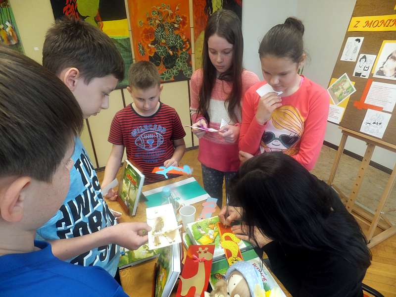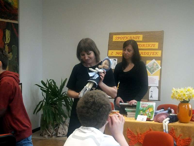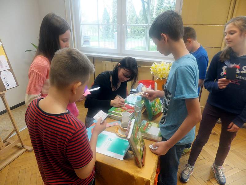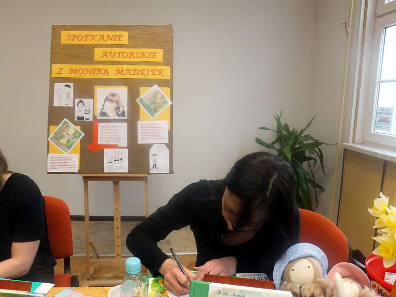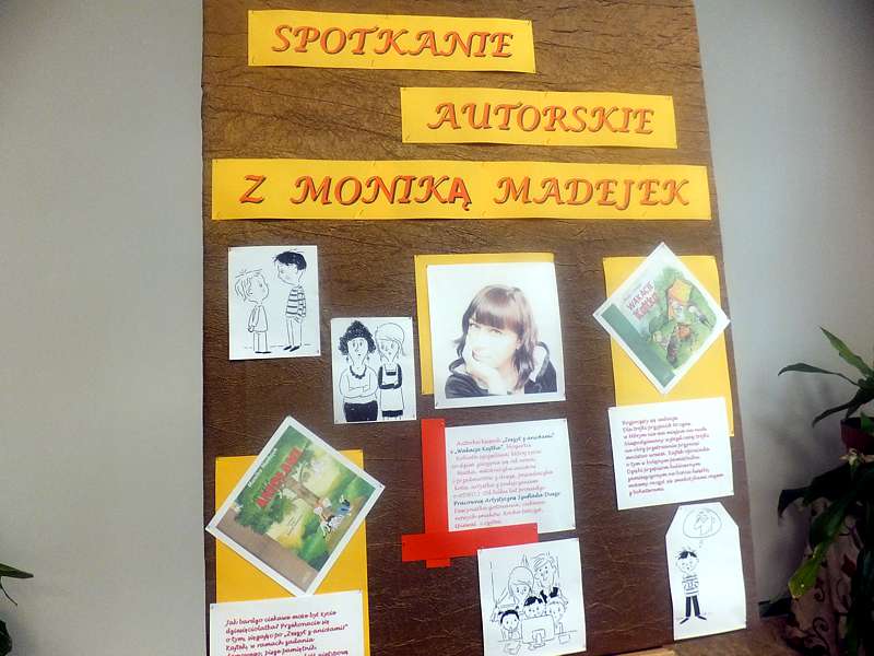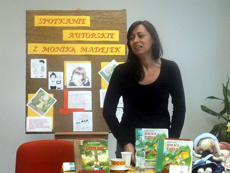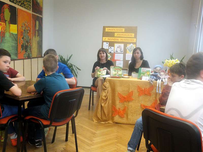 Dnia 11 kwietnia klasa Va wraz z nauczycielem języka polskiego udała się do Biblioteki Pedagogicznej na spotkanie z Moniką Madejek - pisarką „kobietą szczęśliwą, której życie co dzień zaczyna się od nowa”. Z matką, miłośniczką aniołów i przedmiotów z duszą, artystką. Pani Monika, jak na współczesną kobietę przystało, oprócz tworzenia dzieł składających się na literaturę piękną, prowadzi blog kulinarny, z którego można m. in. dowiedzieć się, jak w kilkanaście minut możemy przyrządzić przepyszne serowe racuszki z malinami.