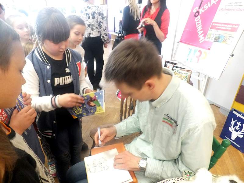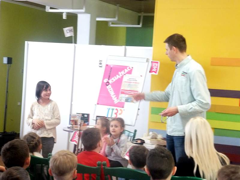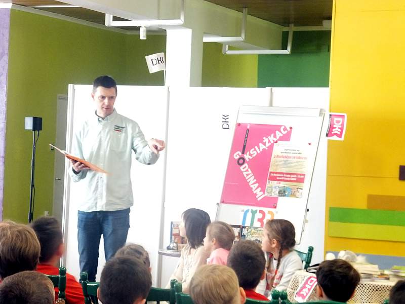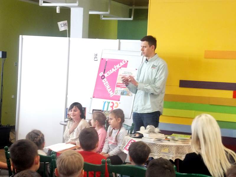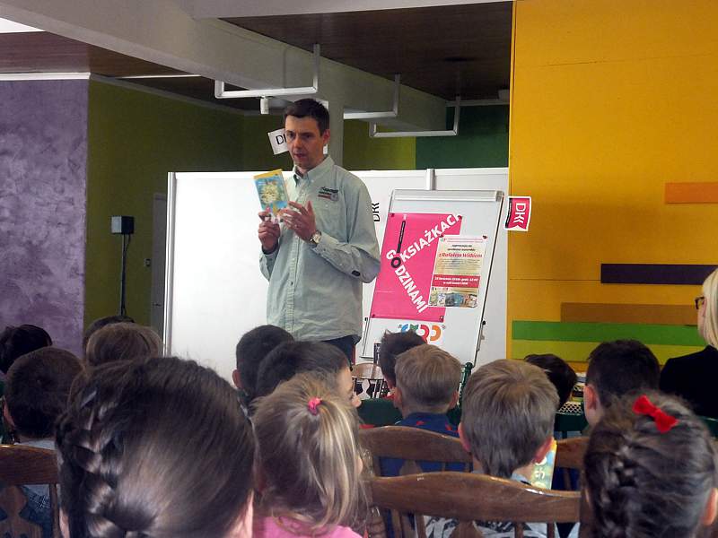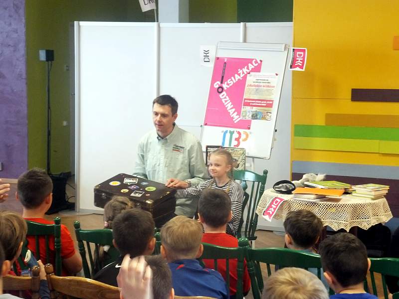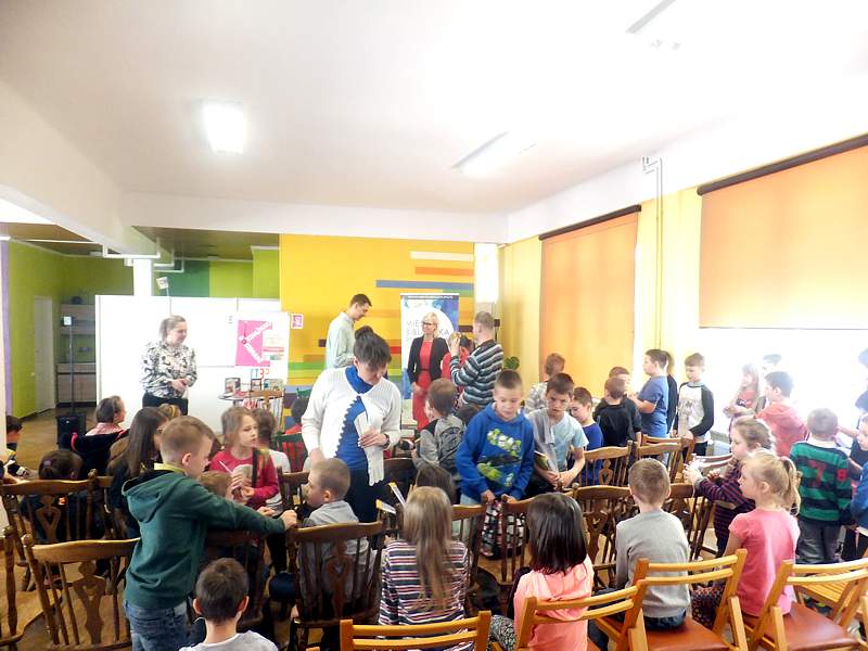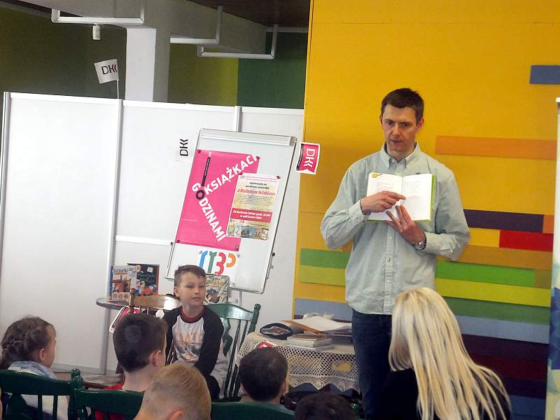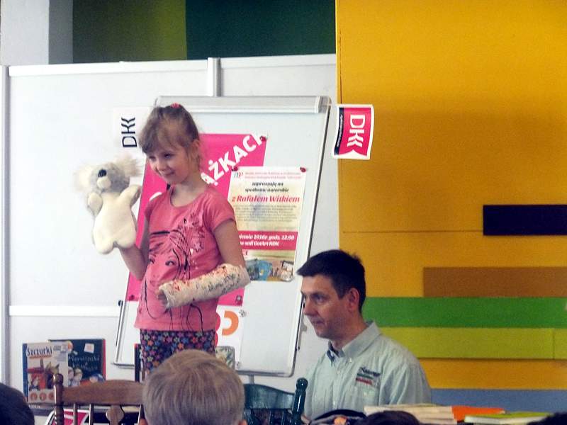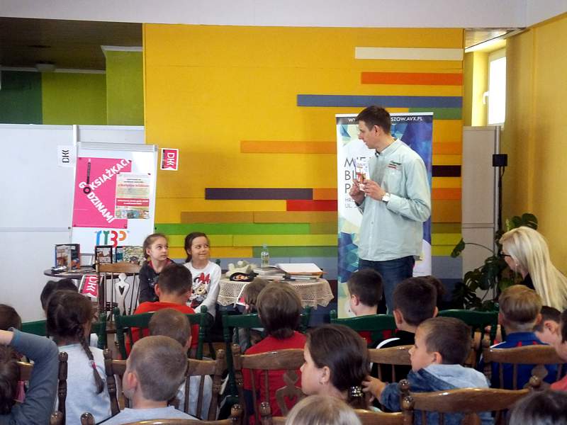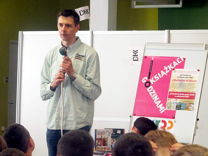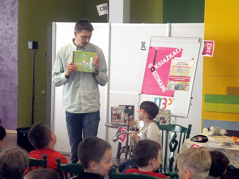 28 kwietnia uczniowie z kl. IVb wraz z wychowawcą udali się z kolei na spotkanie zorganizowane przez Bibliotekę Publiczną i "Lekturynki". Jego bohaterem był tym razem Rafał Witek. Jest on autorem ponad dwudziestu książek dla dzieci, laureatem Konkursu im. Astrid Lindgren. Aby uświetnić spotkanie i pobudzić wyobraźnię młodych czytelników pisarz przygotował dla nich gry, zabawy, zgadywanki.Wielu emocji dostarczało dzieciom losowanie i wyciąganie z tajemniczej walizki kul z numerami. Kryły się za nimi niespodzianki. Dzieci uczestniczące w zabawie niejednokrotnie za swoje bezbłędne wypowiedzi, za odwagę sceniczną, za umiejętność np. szybkiego czytania otrzymywały od autora pochwały. Na zakończenie każdy mógł zadać pisarzowi pytania, a także poprosić o pamiątkowy autograf.
