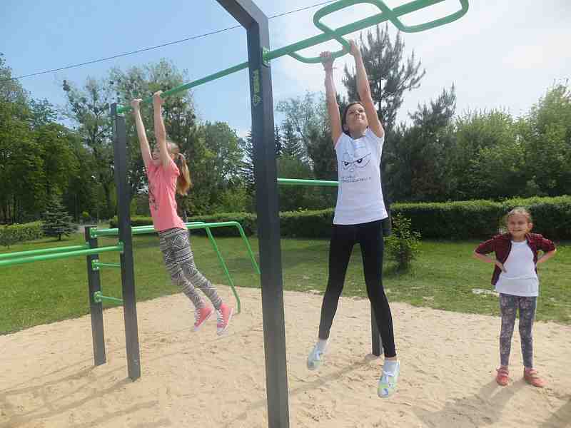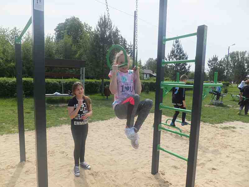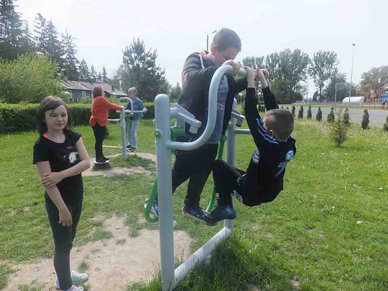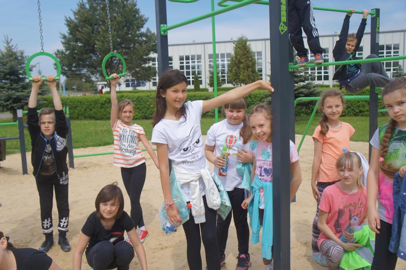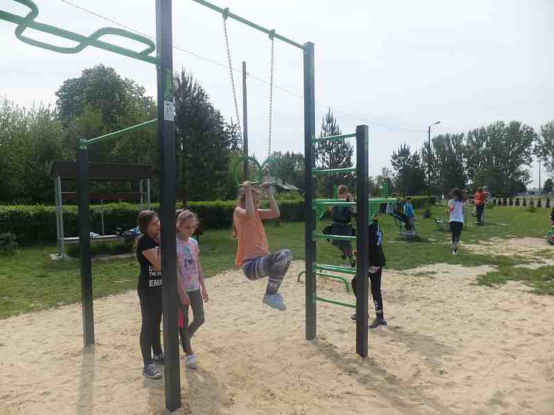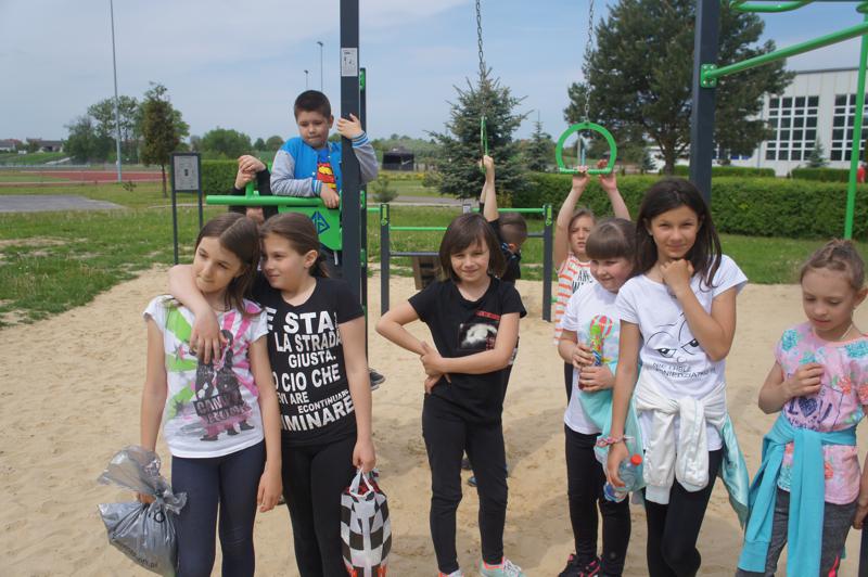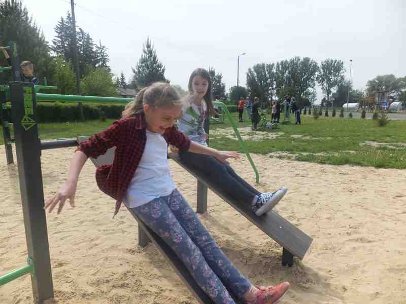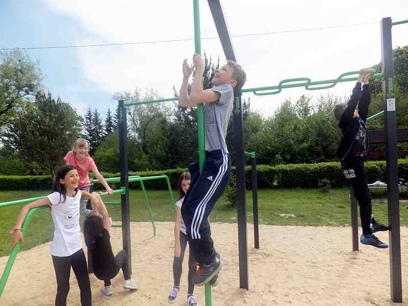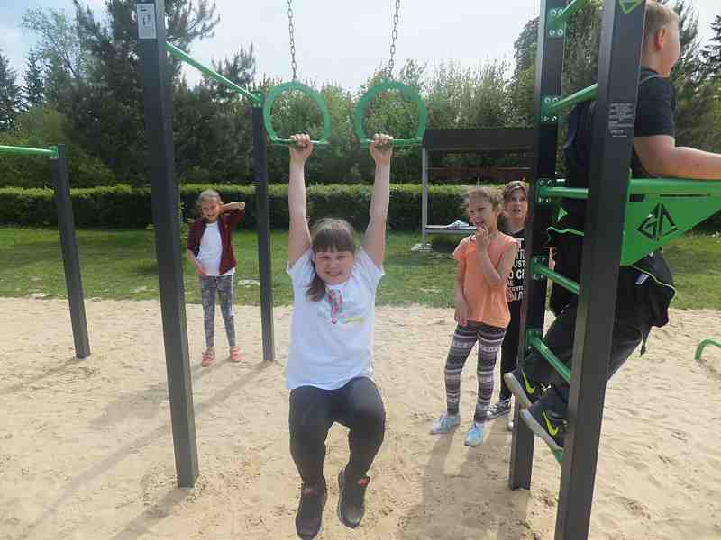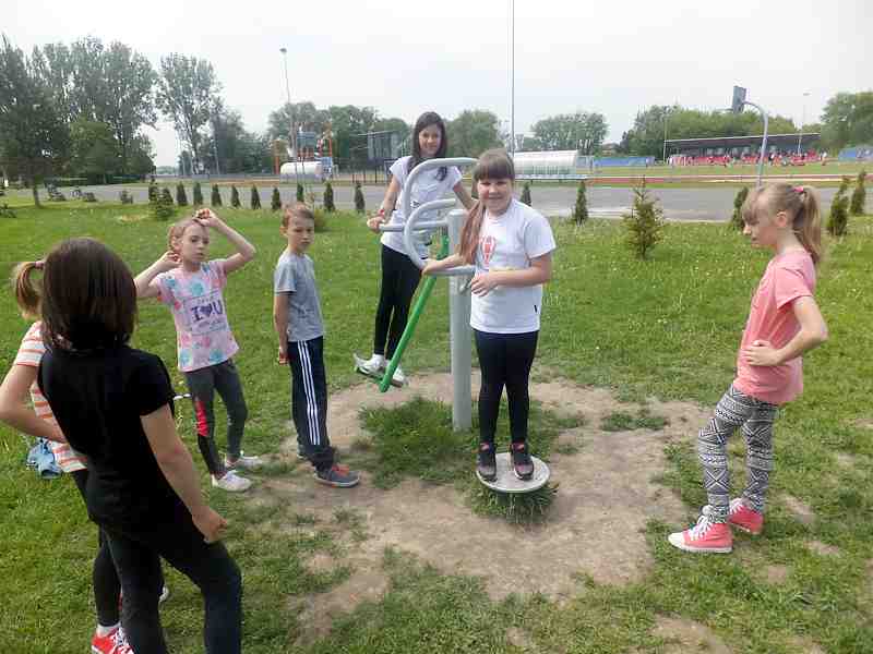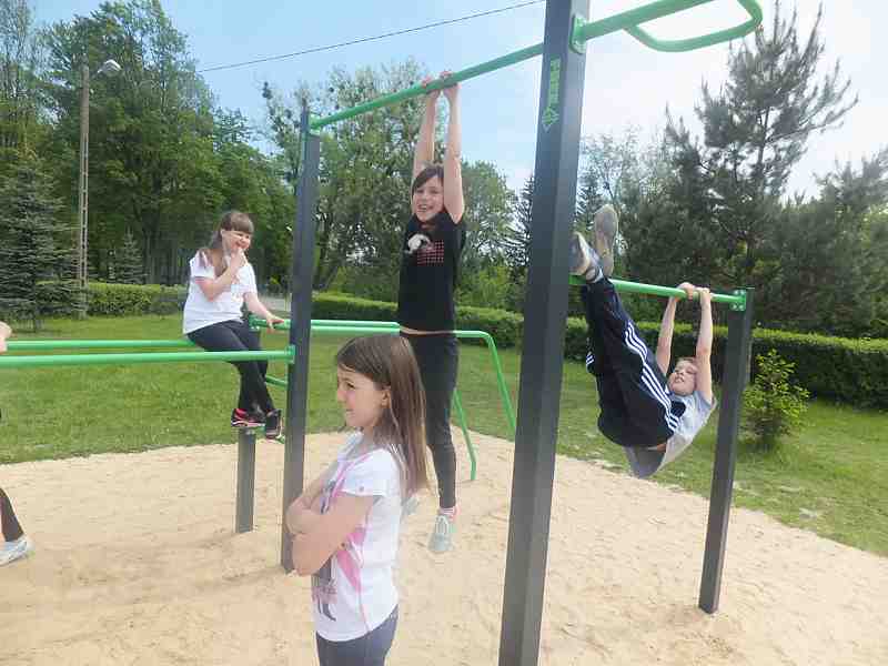 Dnia 13 maja klasa IV b udała się do Hrubieszowskiego Ośrodka Sportu i Rekreacji, by skorzystać z jego ofert i zażyć ruchu na świeżym powietrzu. Na początku dzieci zatrzymały się na terenie siłowni zewnętrznej. To tutaj został zgromadzony sprzęt, który pozwala uczniom spożytkować energię, pobawić się z rówieśnikami, wykonać przeróżne ćwiczenia, w tym akrobatyczne. Po godzinnych zajęciach dzieci wraz z wychowawcą, nauczycielami wych. fiz. - p. Iwoną Stefaniak i p. Dominikiem Stajszczykiem (instruktorem) udali się do parku linowego.