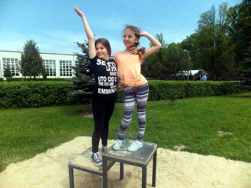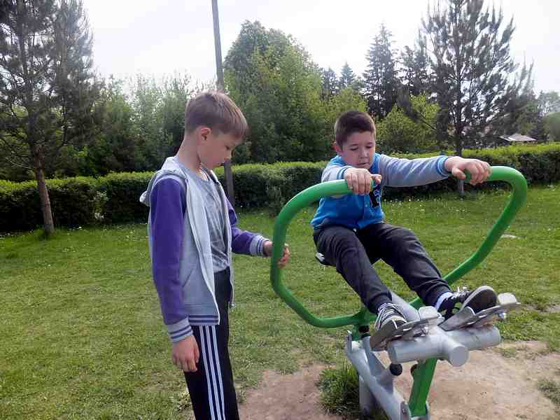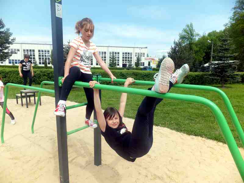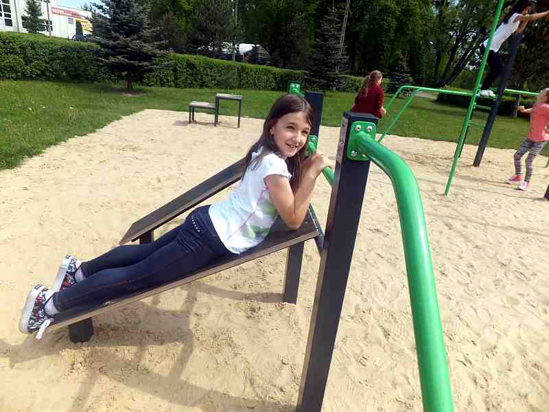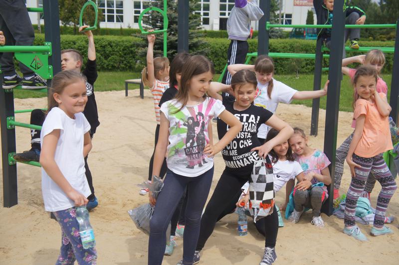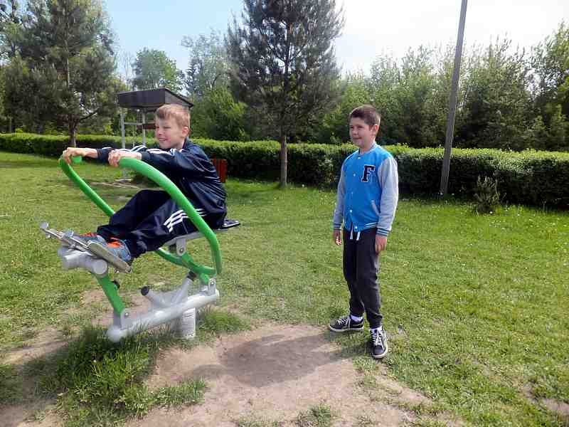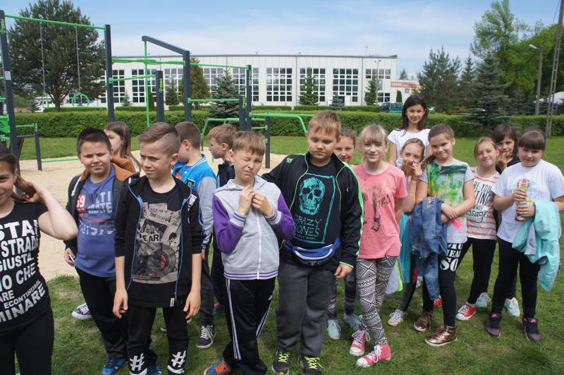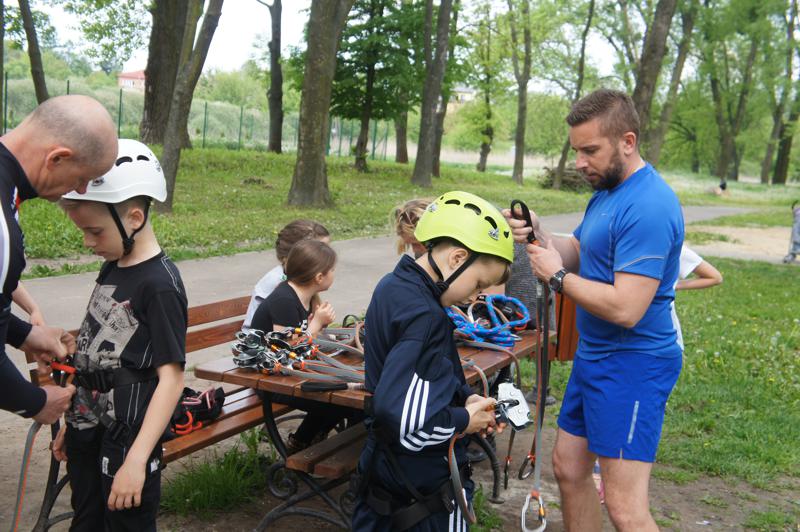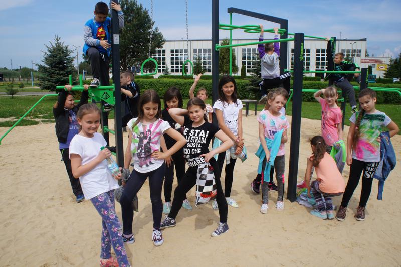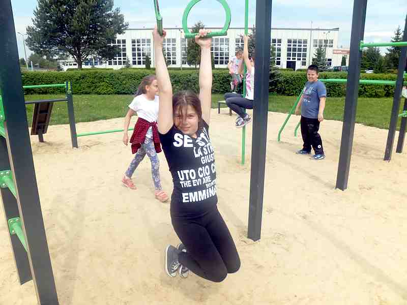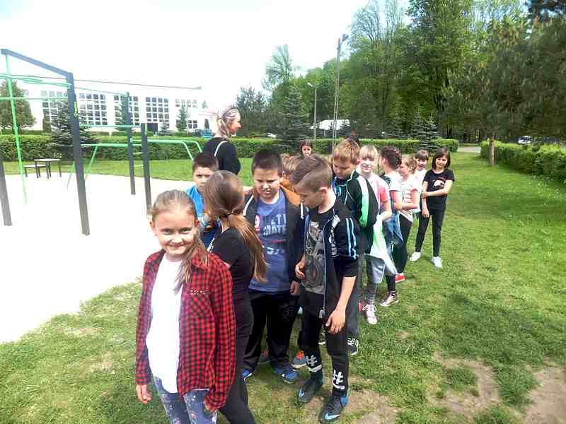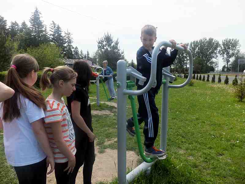 Dnia 13 maja klasa IV b udała się do Hrubieszowskiego Ośrodka Sportu i Rekreacji, by skorzystać z jego ofert i zażyć ruchu na świeżym powietrzu. Na początku dzieci zatrzymały się na terenie siłowni zewnętrznej. To tutaj został zgromadzony sprzęt, który pozwala uczniom spożytkować energię, pobawić się z rówieśnikami, wykonać przeróżne ćwiczenia, w tym akrobatyczne. Po godzinnych zajęciach dzieci wraz z wychowawcą, nauczycielami wych. fiz. - p. Iwoną Stefaniak i p. Dominikiem Stajszczykiem (instruktorem) udali się do parku linowego.