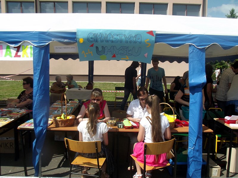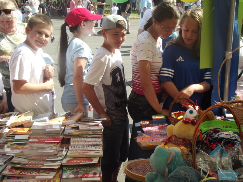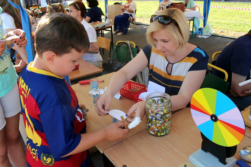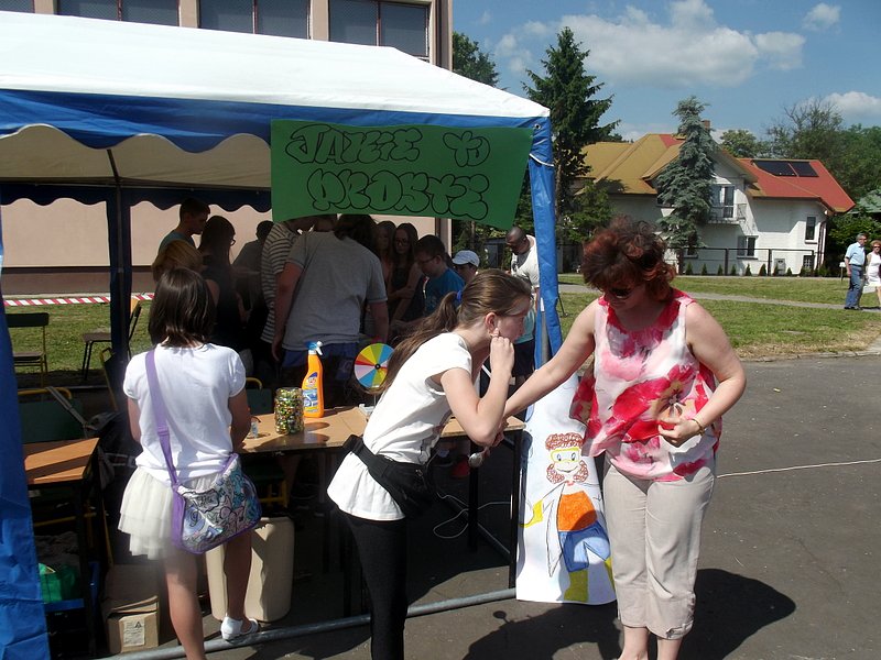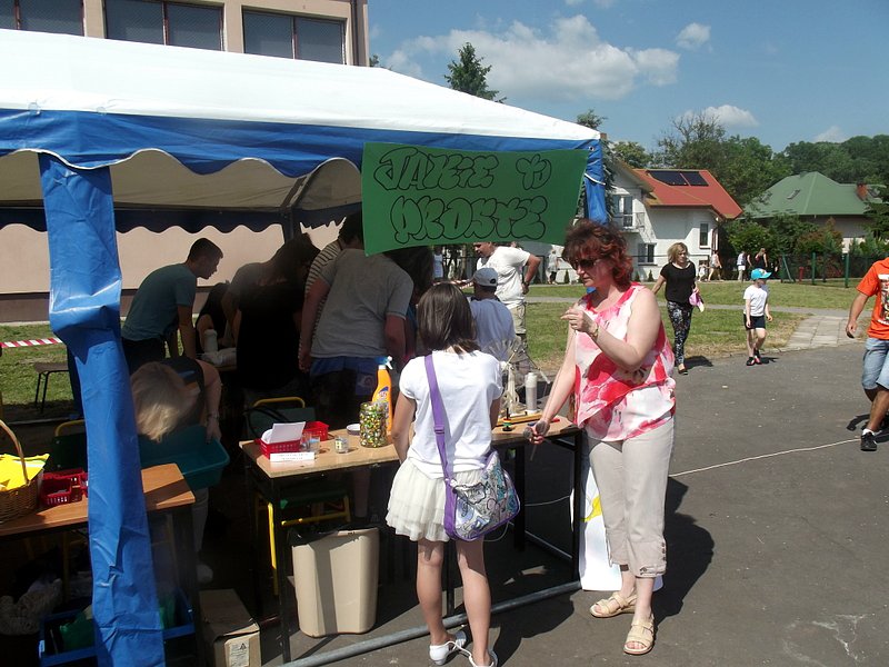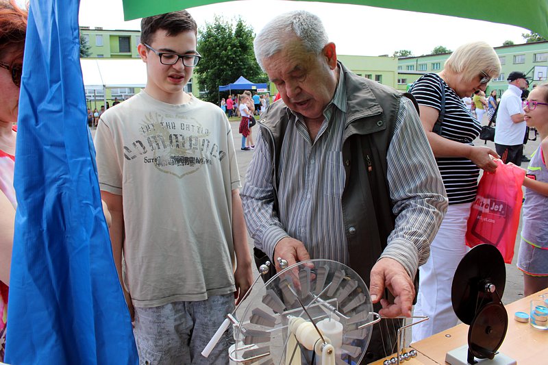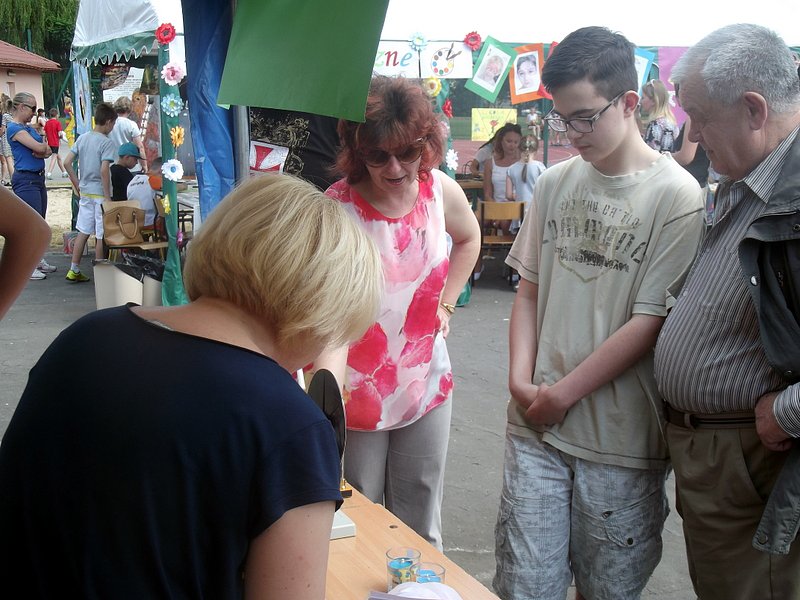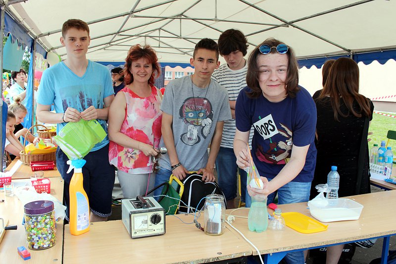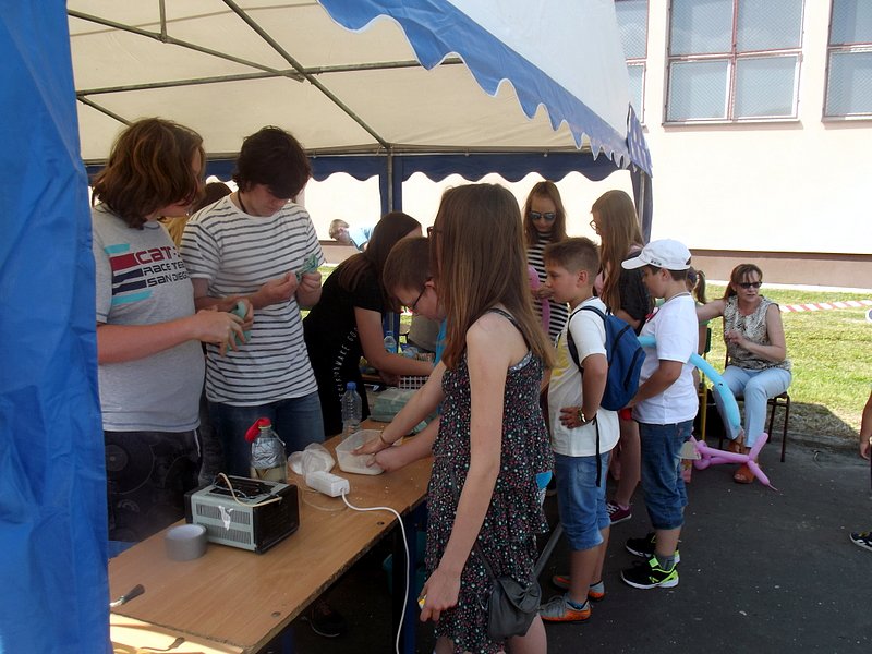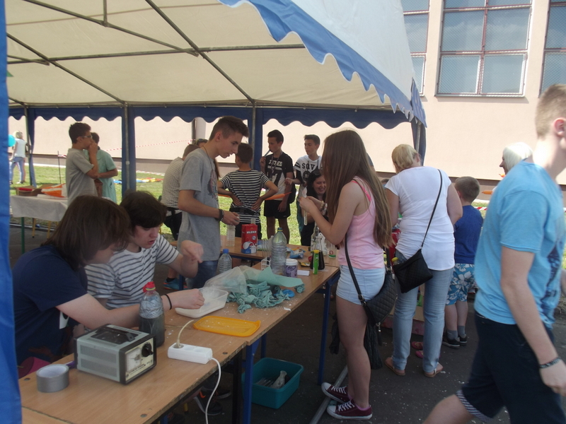 W przygotowaniu i prezentowaniu doświadczeń pomagali uczniowie naszego gimnazjum, którzy mogli zaprezentować i podzielić się swoją wiedzą i umiejętnościami nabytymi podczas nauki w naszej szkole. Uczestnicy festynu świetnie odnajdywali się przy stoisku z książkami. Panie z biblioteki w ramach promocji czytelnictwa przygotowały bogatą ofertę różnorodnych książek, zarówno tych pobudzających wyobraźnię, wywołujących emocje, czy wzbogacających wiedzę. Duży gwar i zainteresowanie wzbudziła loteria fantowa. Każdy chciał spróbować szczęścia. Wśród licytowanych fantów znalazł się m.in.: laptop wylosowany przez uczennicę klasy piątej.