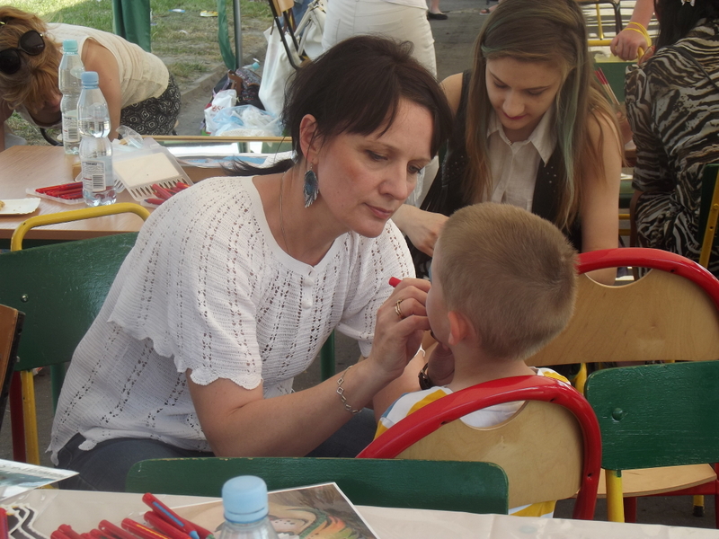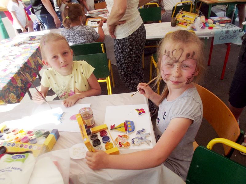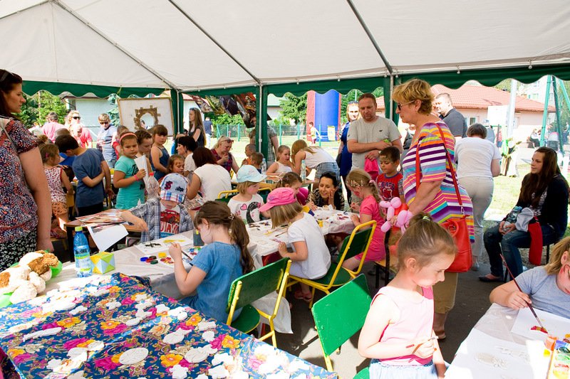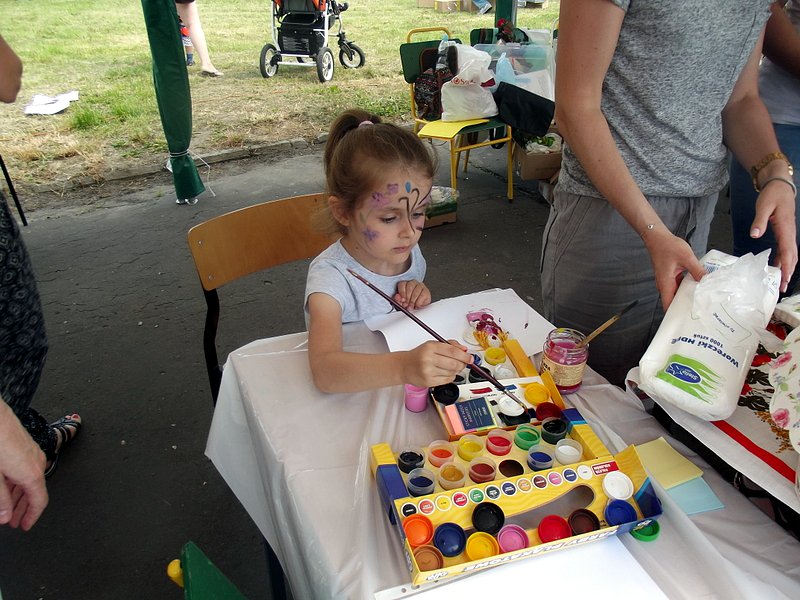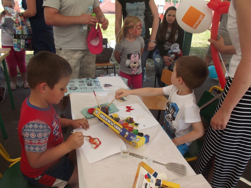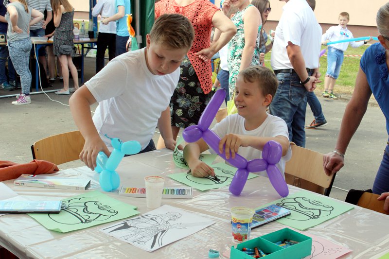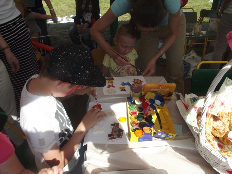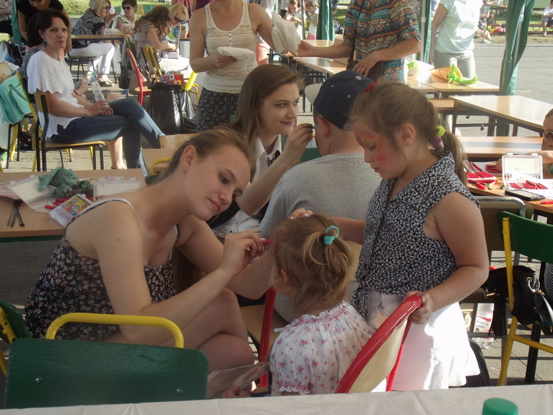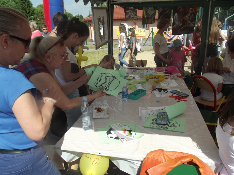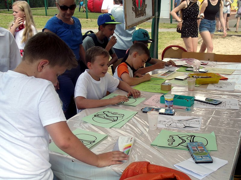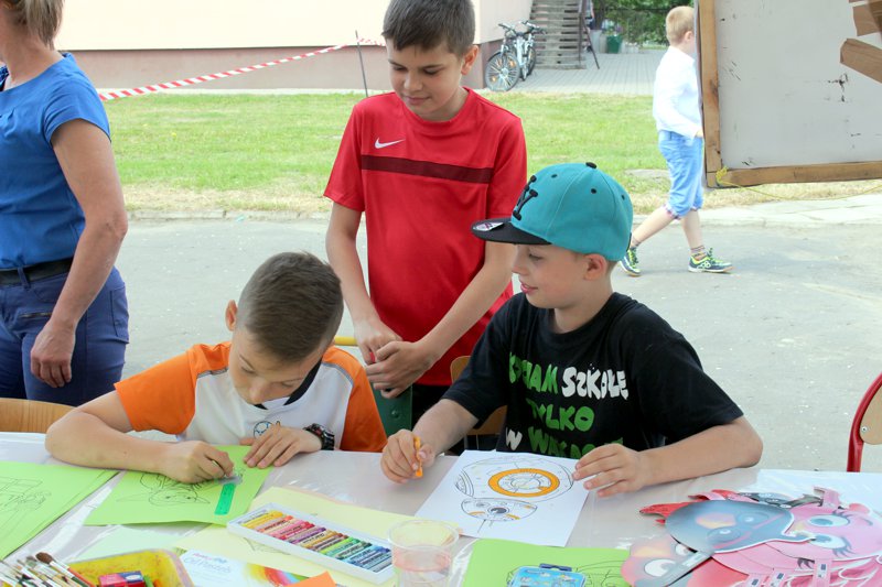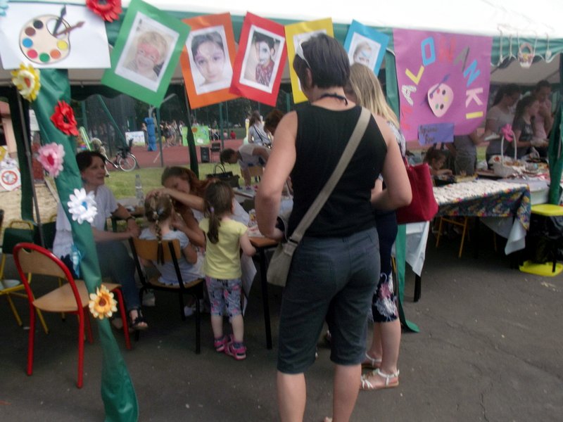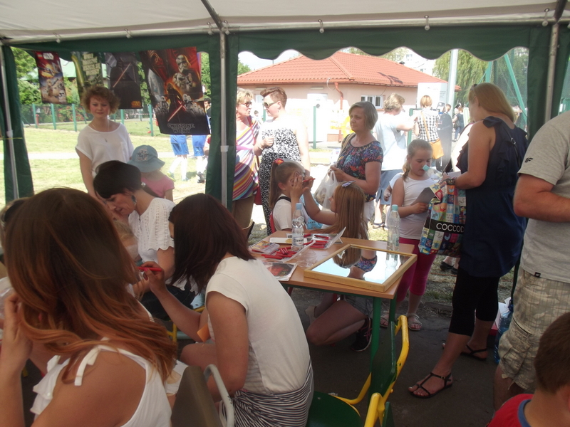 Dzieci chętnie korzystały z pracowni artystycznej, w której można było otrzymać na pamiątkę i własnoręcznie pomalować gipsową figurkę oraz sprawić sobie na twarzy makijaż. Niejeden milusiński opuszczał to miejsce, wcielając się w postać motyla, tygrysa, czy kota. Mali i starsi fani Star Wars mogli odbyć podróż w świat „Gwiezdnych wojen” biorąc udział w zajęciach plastycznych z kolorowankami, przedstawiającymi postacie z bajek i filmów tej serii, a ponadto przy makietach bohaterów „Gwiezdnych wojen” zrobić pamiątkowe zdjęcie. Chętni mieli okazję budować roboty z makulatury i pudełek. Wynik ich pracy był imponujący. Przy wejściu na boiska orlik można było podziwiać uczniowskie prace, które zostały zrobione na plastyce w minionym roku szkolnym, zachęcające do nauki naszej szkole. Zainteresowaniem cieszyło się również skręcanie figur z baloników oraz biegi w łączonych potrójnych spodniach. W zabawie uczestniczyły najmłodsze dzieci.