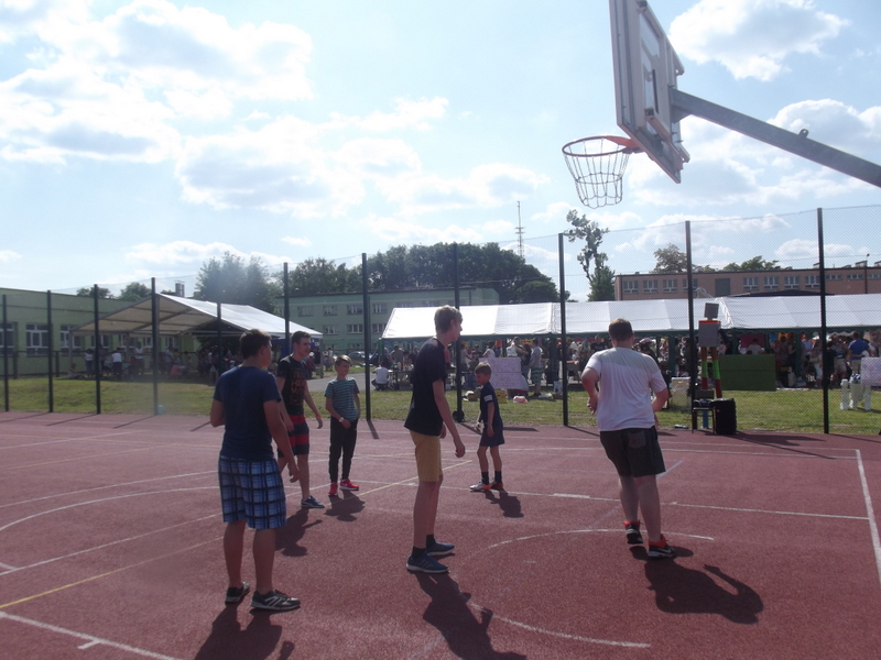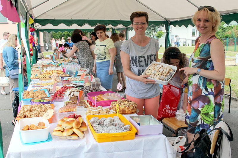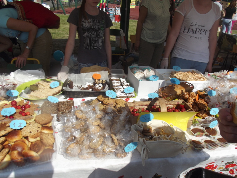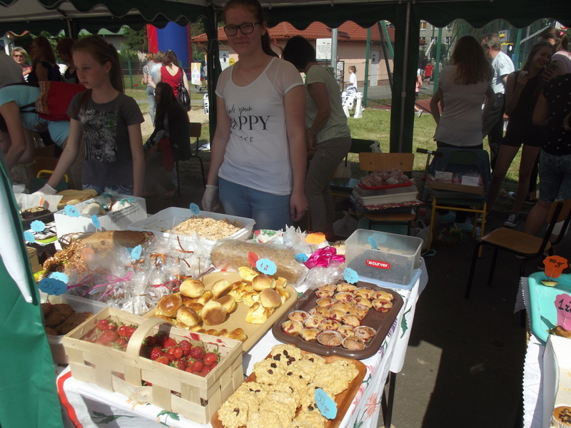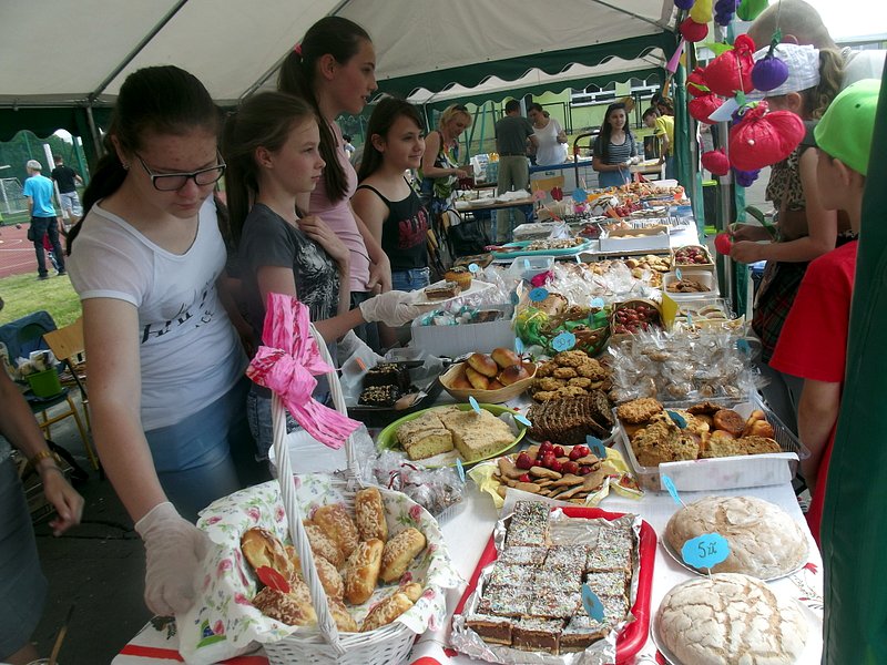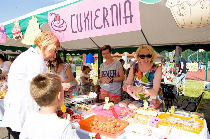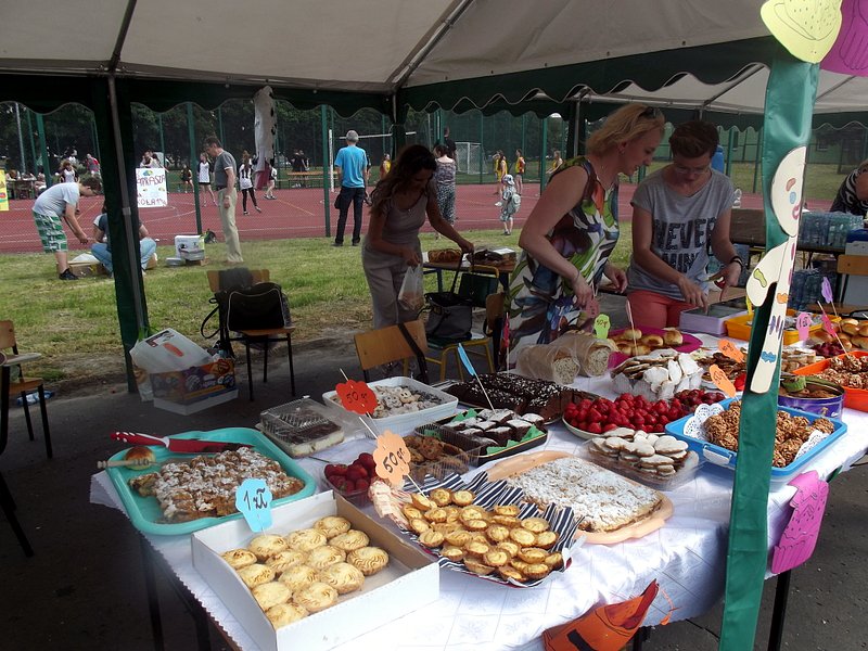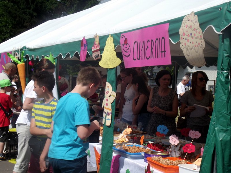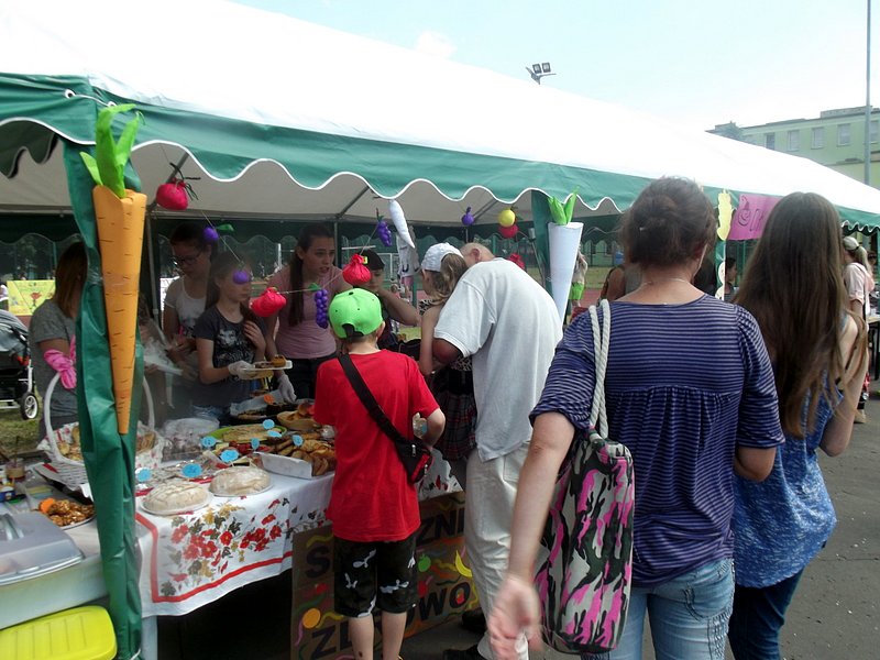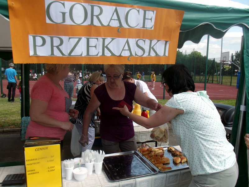 Stoiska ze zdrową żywnością i ciastem kusiły uczestników festynu aromatem i wyglądem smacznych i słodkich wypieków, do kupienia za symboliczną złotówkę. Przygotowały je mamy uczniów i grono nauczycielskie. O żołądki uczestników zadbała także kuchnia szkolna oferując tradycyjnie smaczne, gorące kiełbaski, pyszne paszteciki. Sklepik szkolny zaopatrywał w wodę i orzeźwiające lody. Goście chętnie kupowali watę cukrową i popcorn. Wszystkie pochłonięte kalorie można, a nawet trzeba było spalić w konkurencjach sportowych, poprowadzonych z zaangażowaniem i dawką humoru przez nauczycieli wychowania fizycznego. W pasie zieleni koło sali gimnastycznej odbył się konkurs w Kule Boule, ciekawa gra, która polega na rzucaniu z wytyczonego okręgu metalowymi kulami (bulami) o wadze ok. 700 g , w kierunku małej drewnianej kulki zwanej potocznie „świnką” . Zadaniem graczy było umieszczenie swojej buli bliżej świnki lub wybicie buli przeciwnika. W zabawie zwycięża ten gracz , którego kula stoi najbliżej świnki.