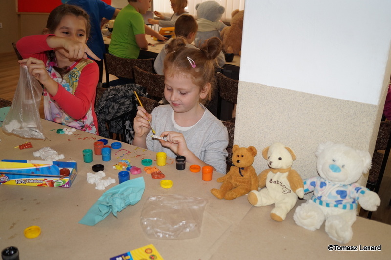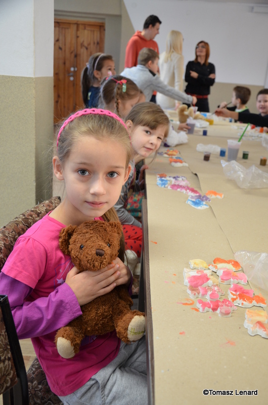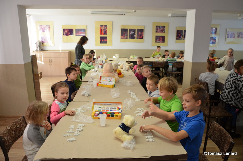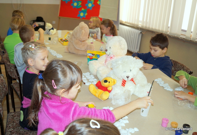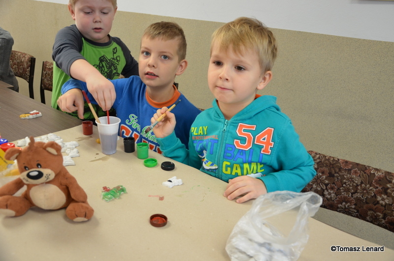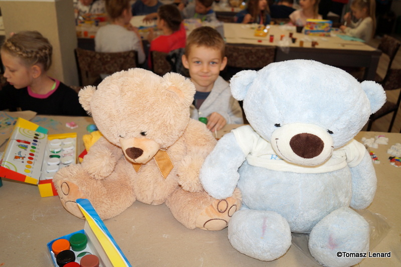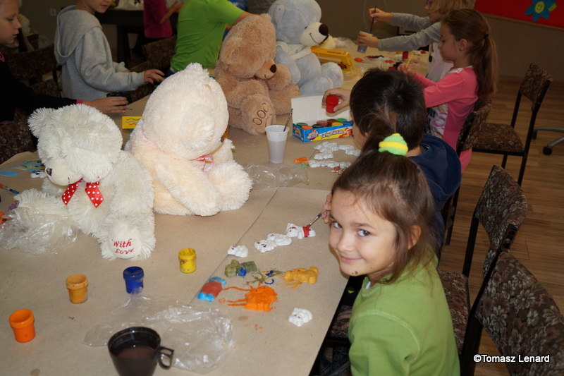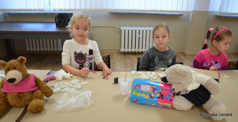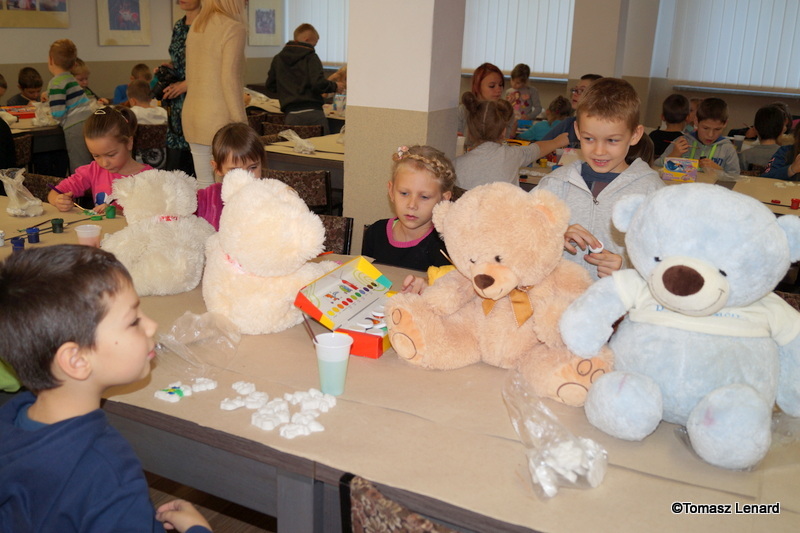 30 października br. nauka dzieci z klas I c i II c odbyła się w towarzystwie pluszaków. Na każdej ławce siedziały misie, o których wychowawczynie klas wymyśliły zabawne historie i opisy. Druga część zajęć odbyła się w Powiatowym Zespole Placówek Szkolno – Wychowawczych, gdzie pierwszo- i drugoklasiści wspólnie z wychowankami Internatu malowali gipsowe figurki miśków. Na zajęciach plastycznych uczestnicy chętnie rozmawiali ze sobą o swoich ulubieńcach, a także prezentowali wykonane ozdoby.