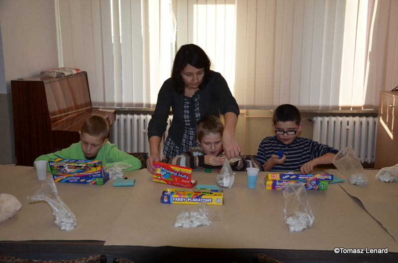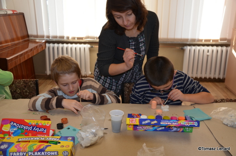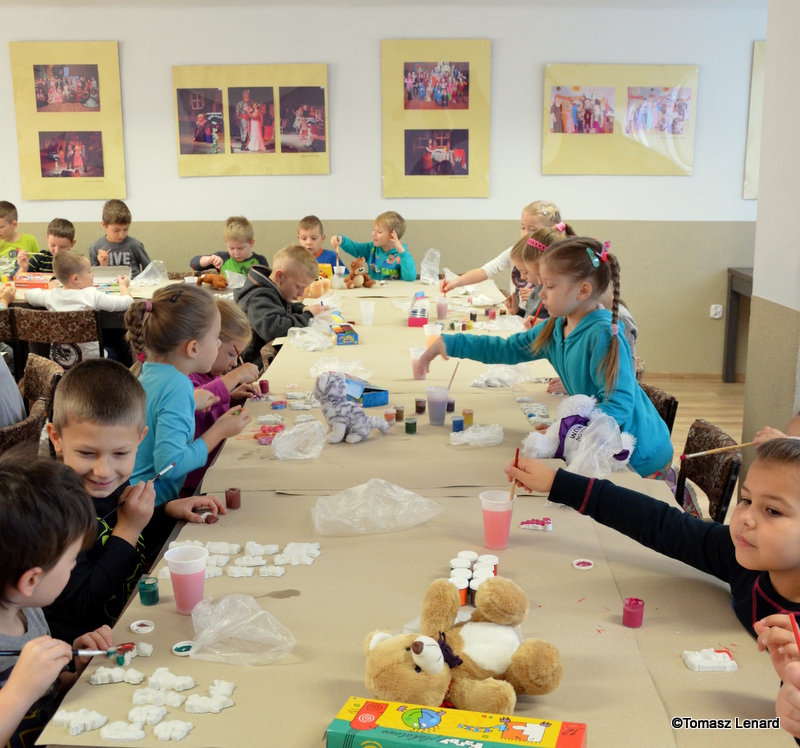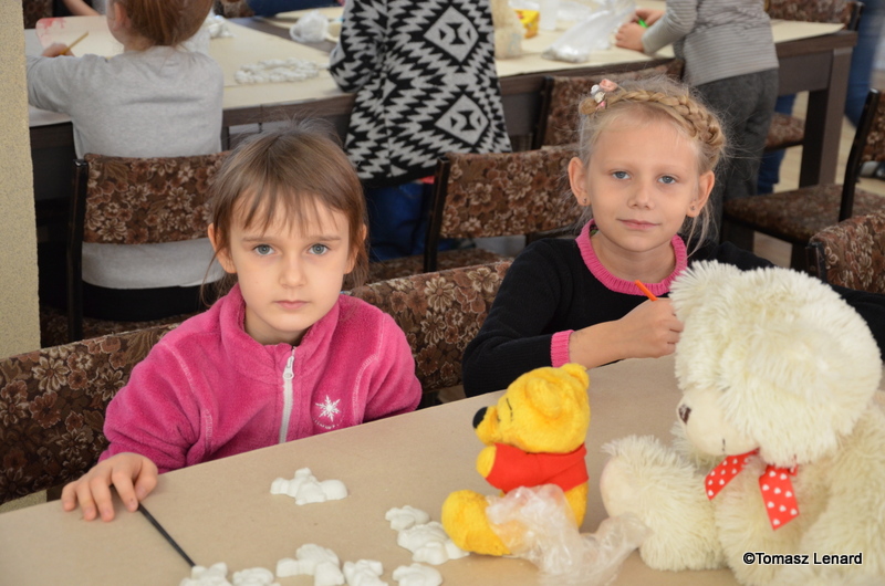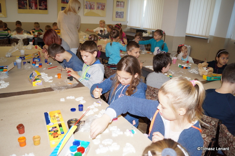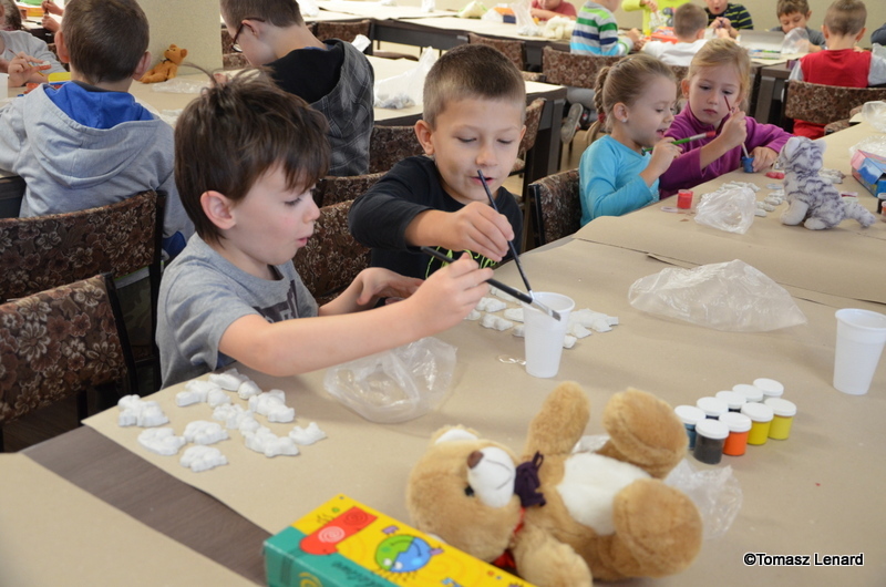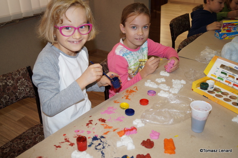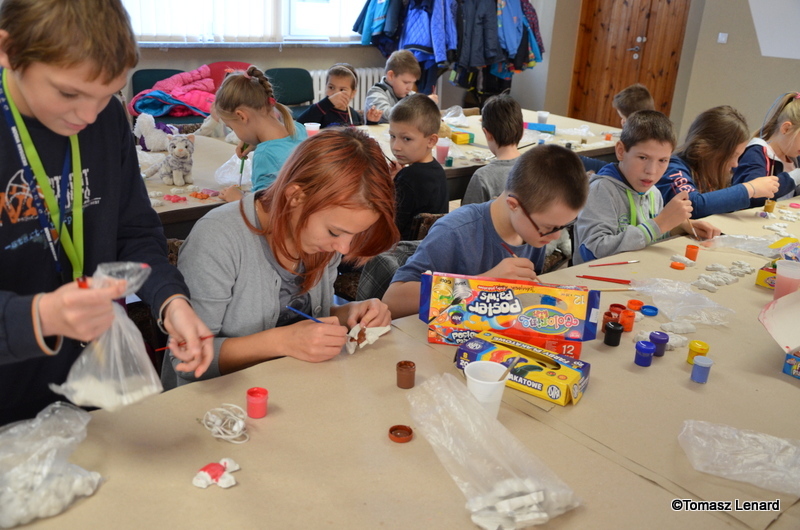 30 października br. nauka dzieci z klas I c i II c odbyła się w towarzystwie pluszaków. Na każdej ławce siedziały misie, o których wychowawczynie klas wymyśliły zabawne historie i opisy. Druga część zajęć odbyła się w Powiatowym Zespole Placówek Szkolno – Wychowawczych, gdzie pierwszo- i drugoklasiści wspólnie z wychowankami Internatu malowali gipsowe figurki miśków. Na zajęciach plastycznych uczestnicy chętnie rozmawiali ze sobą o swoich ulubieńcach, a także prezentowali wykonane ozdoby.