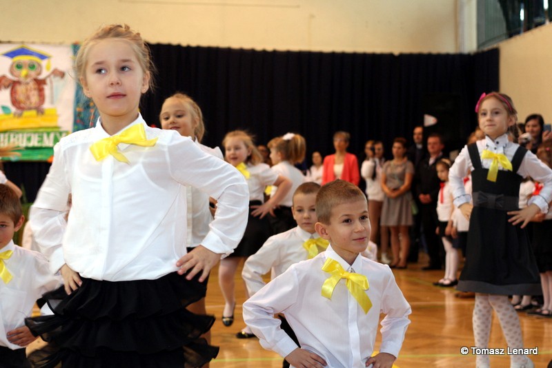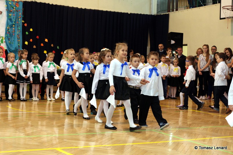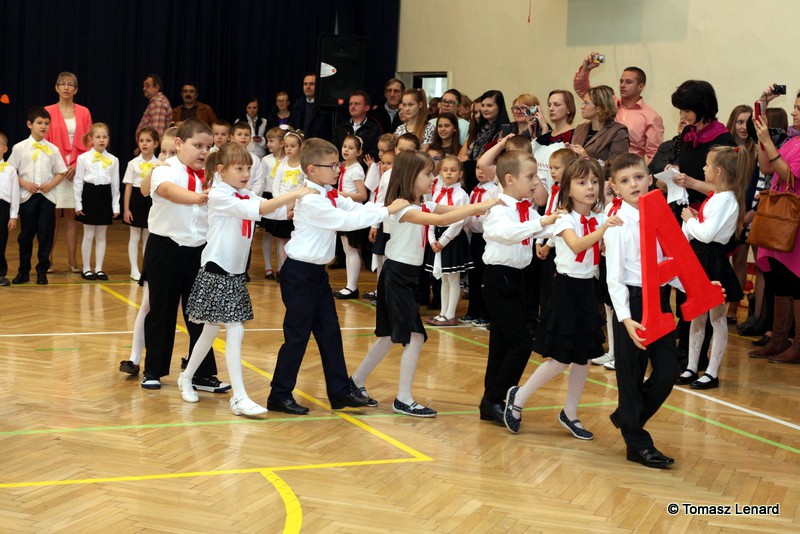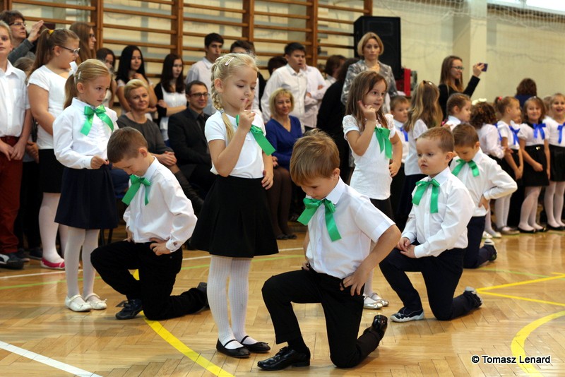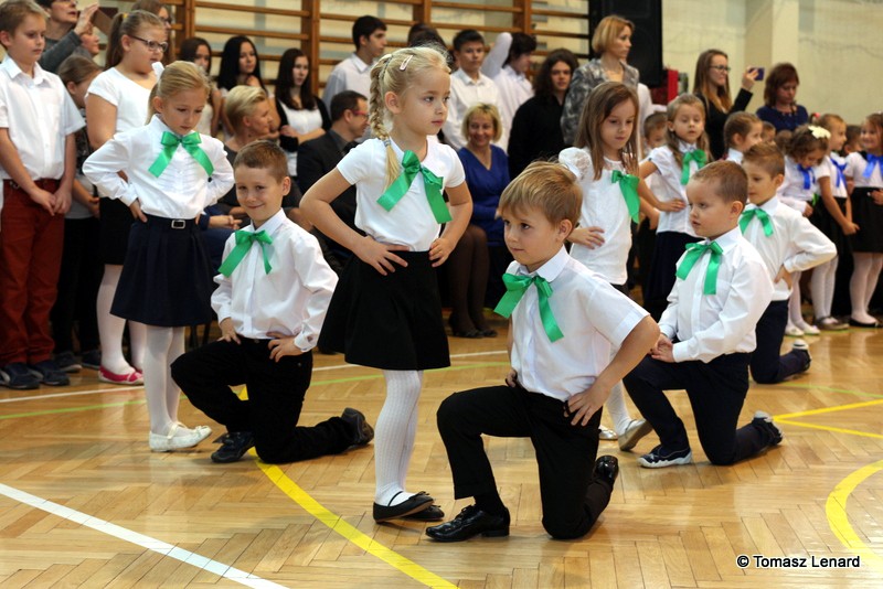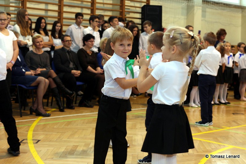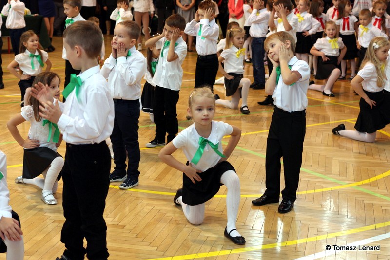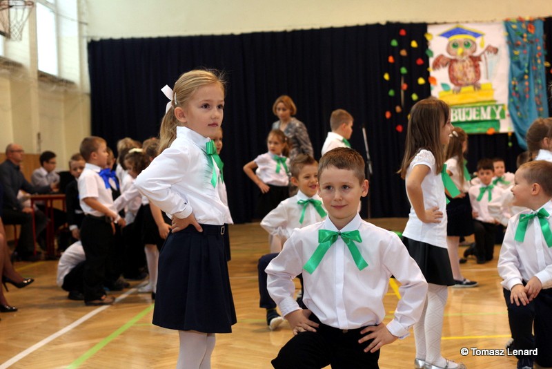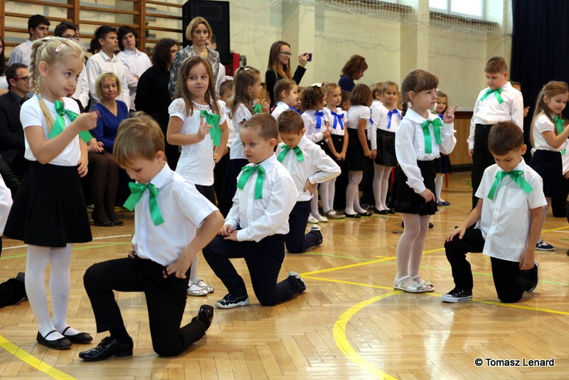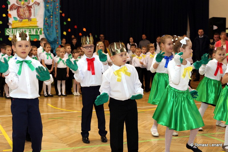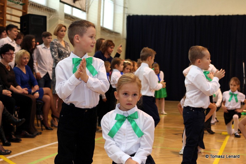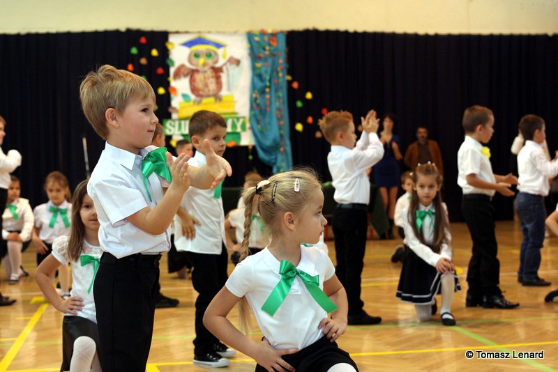 Po dokonaniu pasowania, dzieci zaprezentowały swoje umiejętności artystyczne przygotowane pod kierunkiem swoich wychowawców. W ich bardzo dynamicznej części artystycznej znalazły się przeplatane słowem radosne piosenki z inscenizacją, wesołe i rytmiczne tańce oraz pięknie i dostojnie wykonany polonez. Występ dzieci spotkał się z bardzo ciepłym przyjęciem widowni. Po każdym występie mali artyści byli nagradzani gromkimi brawami. Na zakończenie pani dyrektor podziękowała pierwszakom i ich wychowawcom za wysoki poziom części artystycznej, piękne wykonanie hymnów: państwowego i szkolnego oraz wzorową postawę podczas uroczystości.