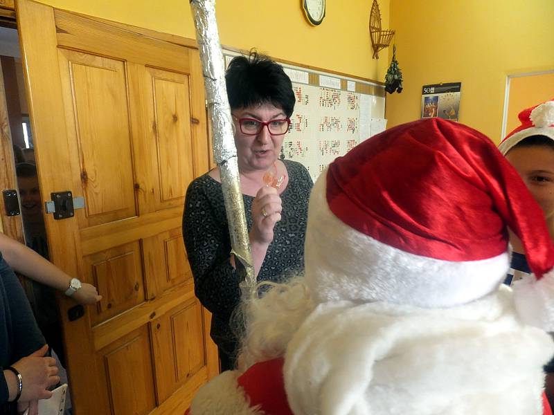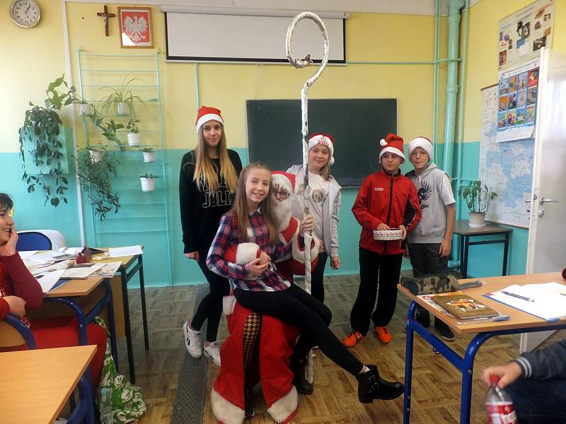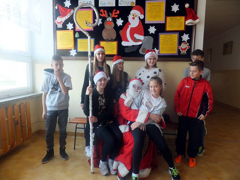 Św. Mikołaj był bardzo życzliwy i otwarty, gdyż zgodził się wziąć udział w sesji fotograficznej. Później nasz niecodzienny gość pojawił się , ale już w innej szacie. Wraz ze swoimi pomocnikami chodził po szkole i rozdawał cukierki. Zajrzał nawet do gabinetu p. Dyrektor, do sekretariatu. Następnie udał się do sal lekcyjnych, by nagrodzić tych, którzy byli w tym roku wyjątkowo grzeczni. Każdy , kto chciał, mógł przy okazji wykonać zdjęcie na tle pięknych, świątecznych dekoracji wykonanych przez Klub Europejski, nauczycieli ze świetlicy i innych.