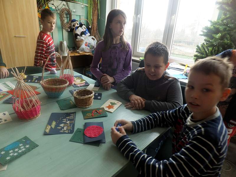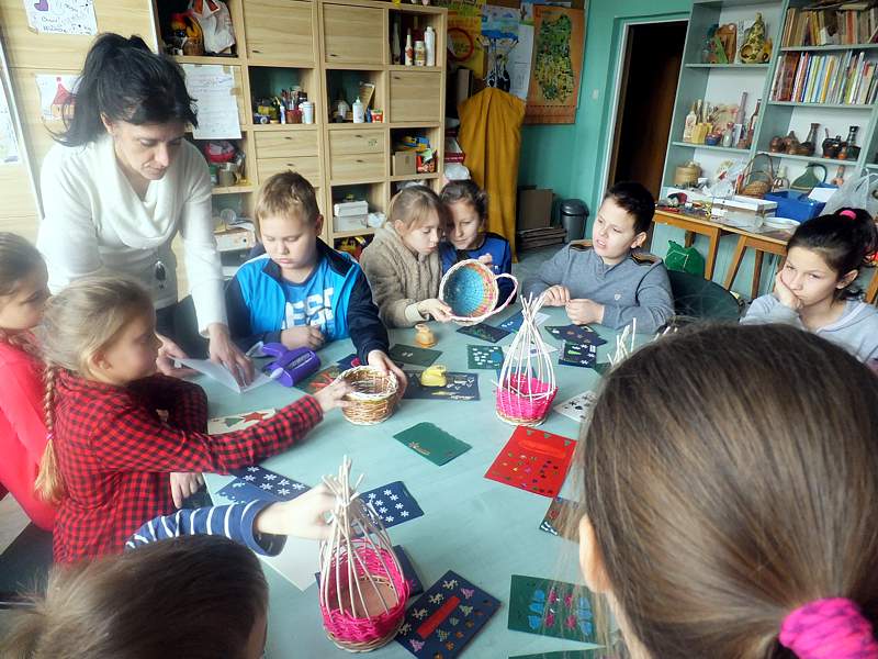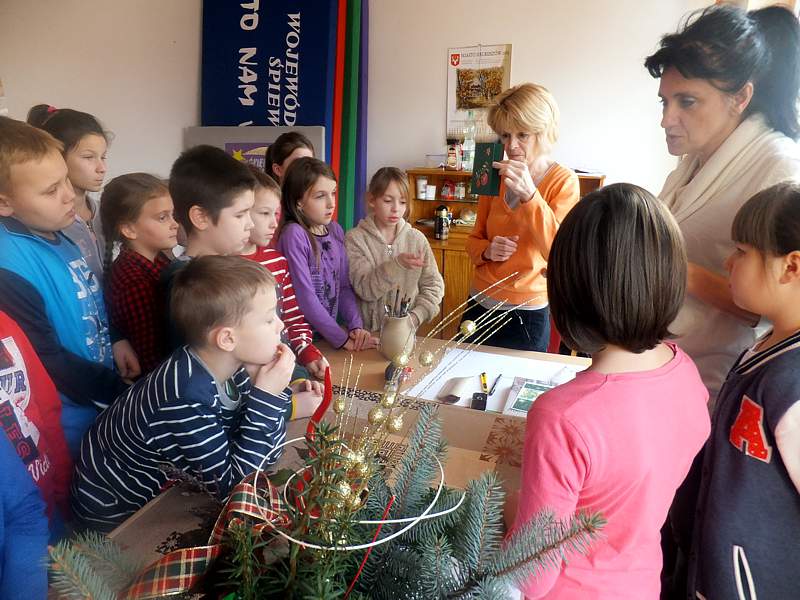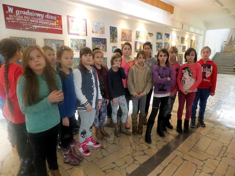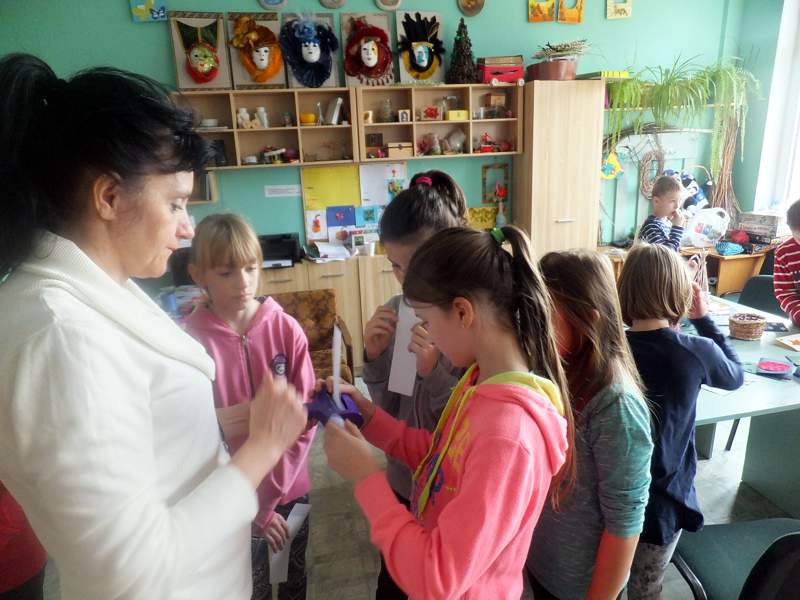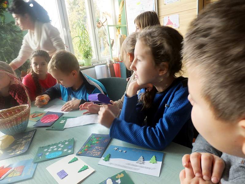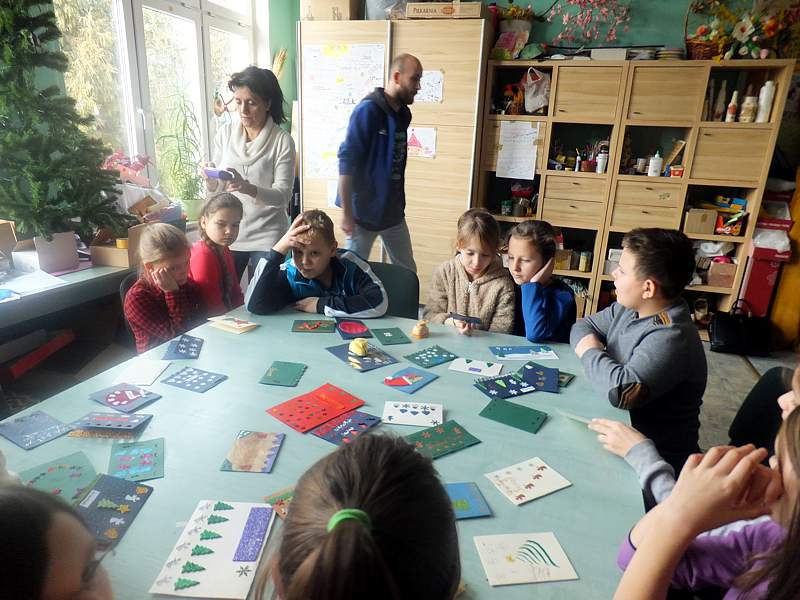 Po krótkich warsztatach teatralnych dzieci udały się do pracowni plastycznej. To w niej pod okiem instruktorów, m.in. p. Andrzeja Maruta, p. Ewy Watras wykonuje się prace, które mogą liczyć na podziw i uznanie. W kolejnej sali czekała na nas pani Barbara Smal, która potrafi po mistrzowsku i w sposób artystyczny odręcznie zapisać słowa. Jej pismo to dowód na to, ze kaligrafia nie jest rzeczą prostą. Tuż obok jej pokoju była pracownia , w której p. Marek Sioma wraz z chętnymi przygotowywał piękne kartki i dekoracje świąteczne.