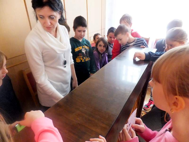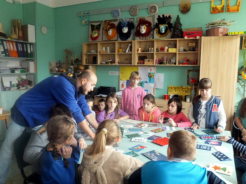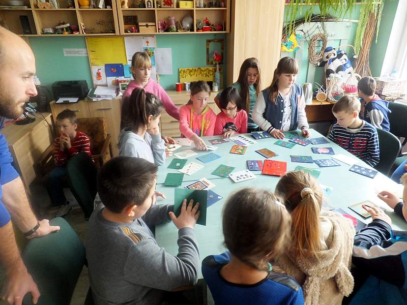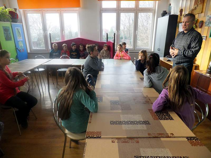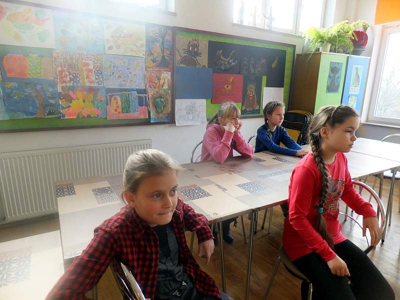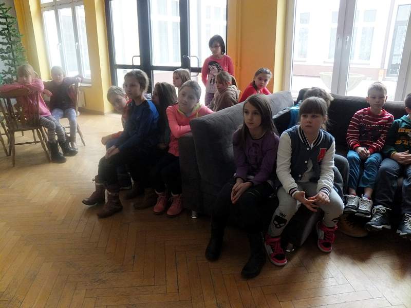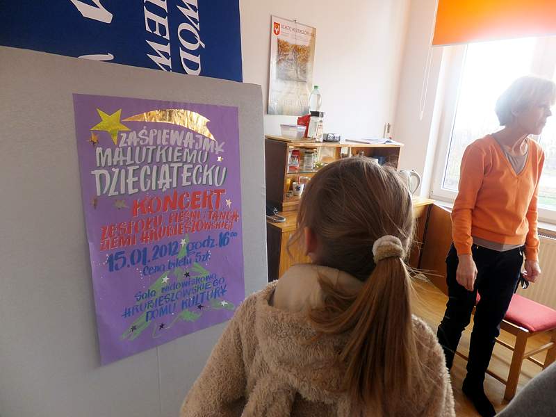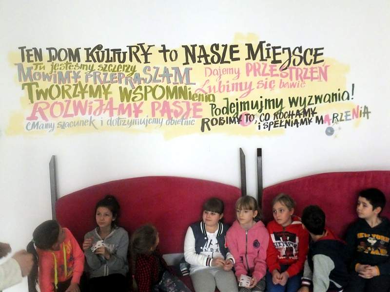 Po krótkich warsztatach teatralnych dzieci udały się do pracowni plastycznej. To w niej pod okiem instruktorów, m.in. p. Andrzeja Maruta, p. Ewy Watras wykonuje się prace, które mogą liczyć na podziw i uznanie. W kolejnej sali czekała na nas pani Barbara Smal, która potrafi po mistrzowsku i w sposób artystyczny odręcznie zapisać słowa. Jej pismo to dowód na to, ze kaligrafia nie jest rzeczą prostą. Tuż obok jej pokoju była pracownia , w której p. Marek Sioma wraz z chętnymi przygotowywał piękne kartki i dekoracje świąteczne.