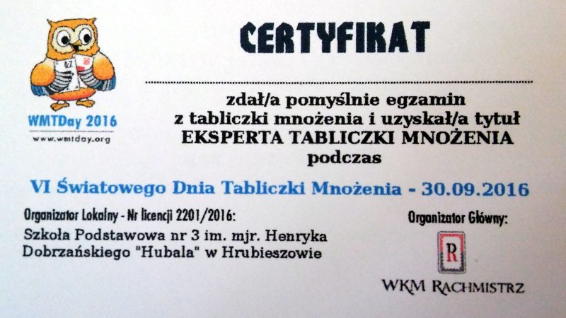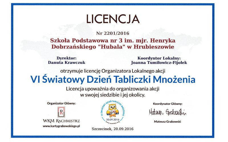 „Młodsi sprawdzają, czy starsi tabliczkę mnożenia znają!” pod takim hasłem w piątek 30 września 2016 roku w ramach obchodów VI Światowego Dnia Tabliczki Mnożenia, uczniowie Szkoły Podstawowej i Gimnazjum nr 3 w Hrubieszowie sprawdzali swoje umiejętności w tym zakresie. W tym roku w akcji uczestniczyło niemal 3 tysiące szkół z 15 krajów. Celem akcji jest propagowanie zabawowej formy uczenia się matematyki.