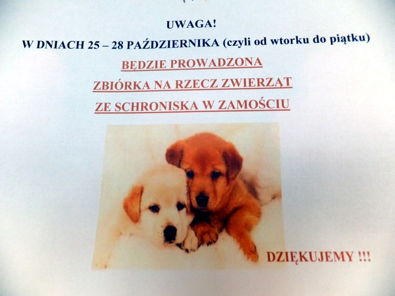 W dniach 25-28 października, jak co roku, Samorząd Uczniowski zorganizował wśród uczniów z klas 0- VI zbiórkę pieniędzy na rzecz bezdomnych zwierząt ze schroniska w Zamościu. Zebrano 288,64 zł. Kwota ta pozwoli na zakup suchej karmy i konserw dla psów, które czekają nie tylko na pożywienie, ale i nowy dom. Być może znajdzie się ktoś , kto jeszcze przed zimą zechce przygarnąć do swojego domu czworonożnego przyjaciela. Liczymy na to!