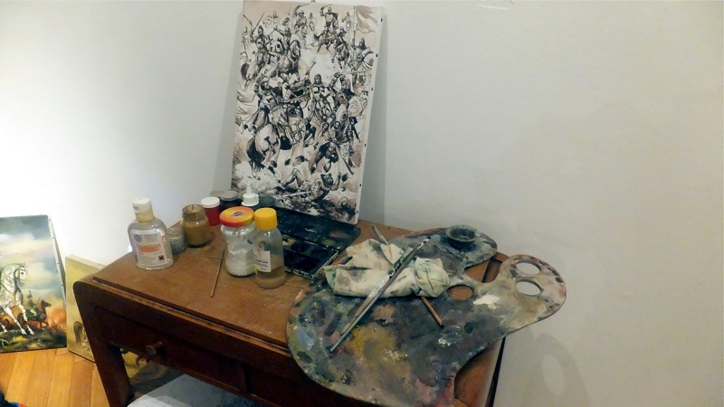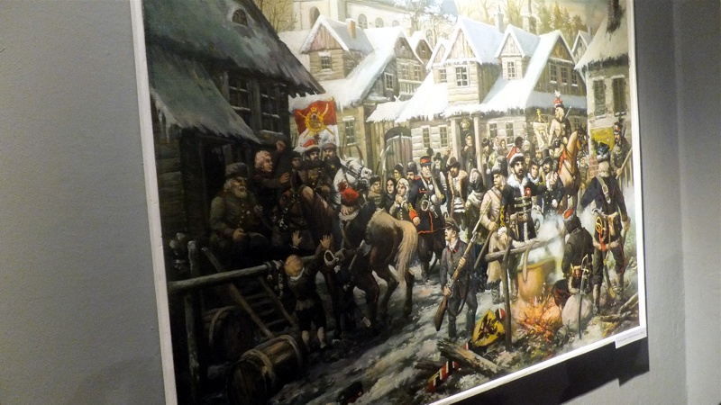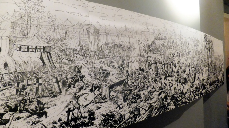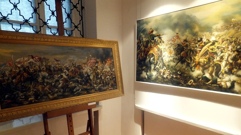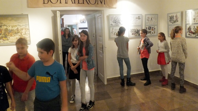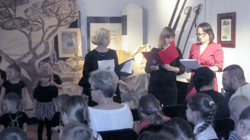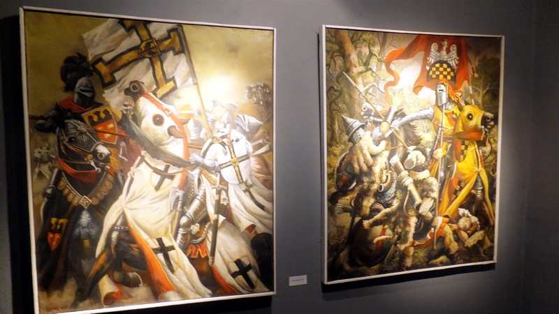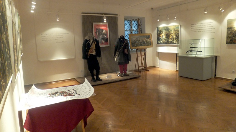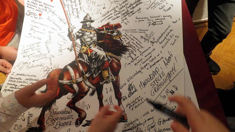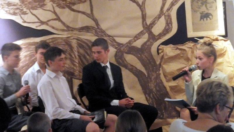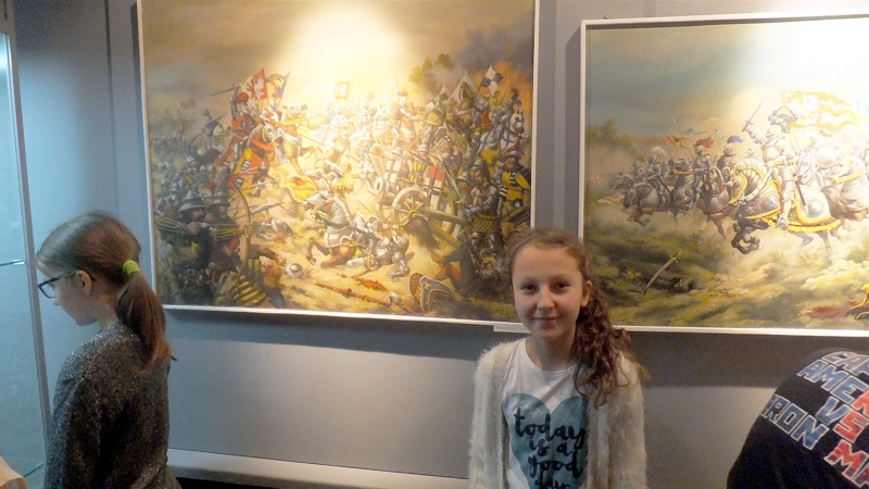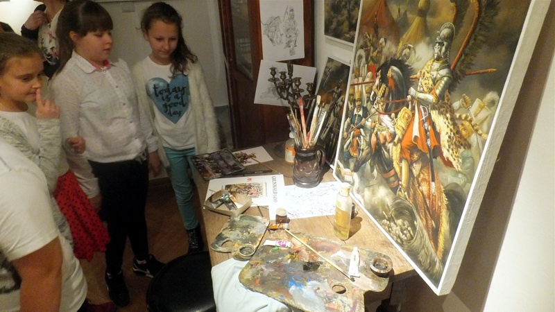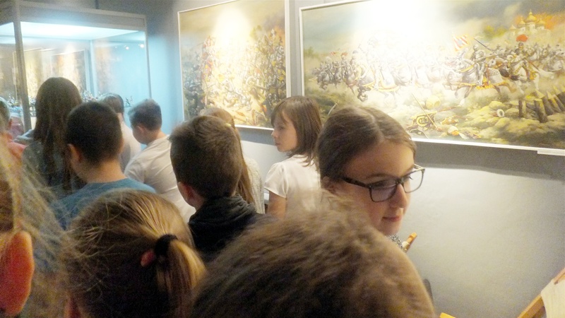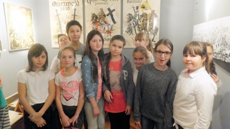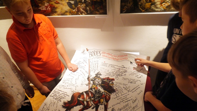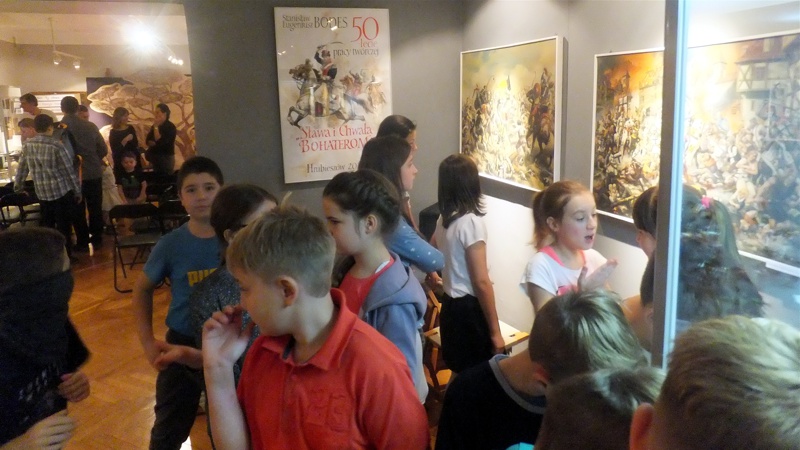Po występie najmłodszej grupy artystów przyszedł czas na uczniów z Gimnazjum nr 1. Groteskowa scena z życia szkoły, do której przez przypadek trafił Sienkiewicz, rozbawiła widzów, którzy przy okazji dowiedzieli się o perypetiach życiowych Zbycha, Maćka i Danuśki. Ciekawą częścią spotkania były zagadki dotyczące twórczości noblisty oraz booktalking, czyli ustna prezentacja utworu Henryka Sienkiewicza wzbogacona, czytanymi przez laureatów konkursu, fragmentami dzieła. Po części prowadzonej przez pracowników Biblioteki Pedagogicznej wszyscy przybyli na spotkanie zostali zaproszeni na wystawę pt. "Sława i chwała bohaterom’’. Została ona zorganizowana przez osoby pracujące w naszym muzeum, a co najważniejsze- pana Stanisława Bodesa. Artysta w tym roku obchodzi 50-lecie pracy twórczej. Uczniowie, zwiedzając poszczególne sale, podziwiali wybitne dzieła naszego malarza batalisty. Na wystawie , jako ciekawostka, pojawiły się także narzędzia pracy artysty, figurki żołnierzy, jak również książki, które są źródłem inspiracji dla malarza. W jednej z sal można było obejrzeć grunwaldzką panoramę. Całość zachwyciła uczniów, którzy przy okazji uświadomili sobie , jak bogata jest historia naszego kraju.