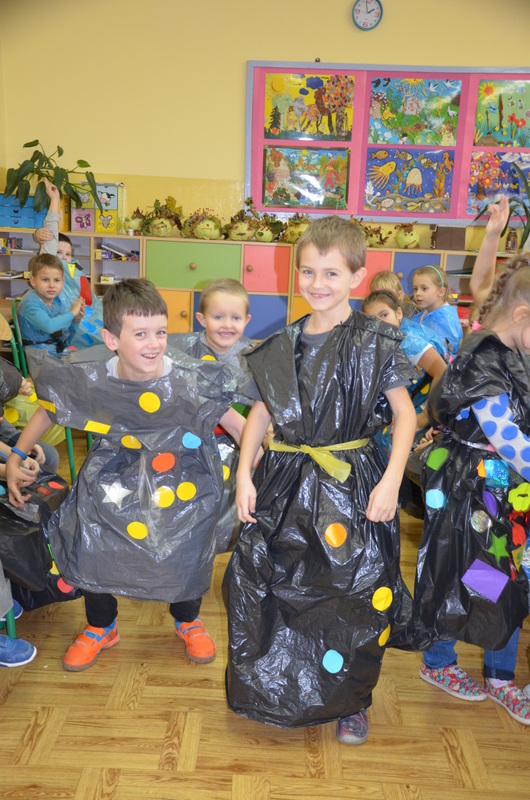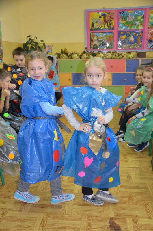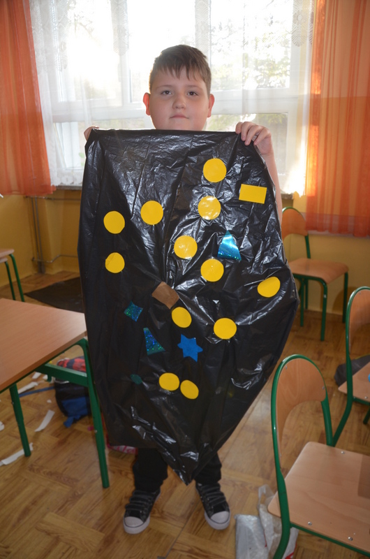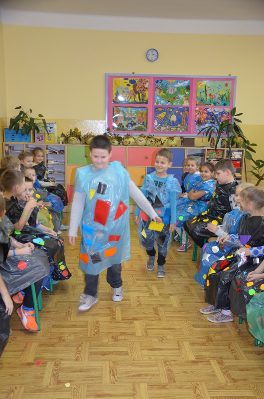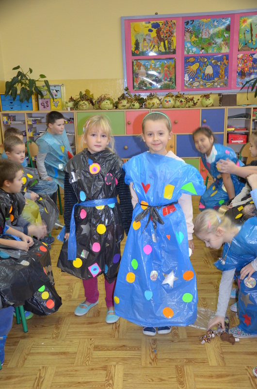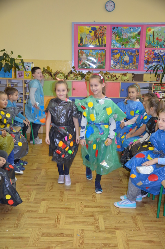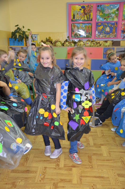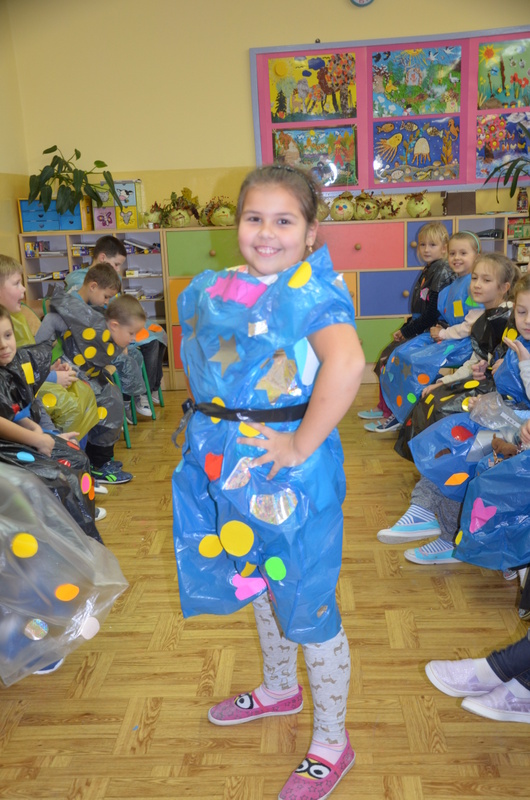 Zaczęły od zaprojektowania i wycinania różnorodnych kształtów z papieru samoprzylepnego. Potem, w ciekawy sposób ozdabiały nimi worki. Na koniec jeszcze tylko kilka cięć i gotowy był oryginalny strój na deszczową pogodę. Pracę zwieńczył Pokaz mody deszczowej. Każdy dumnie i z radością prezentował swoje dzieło.