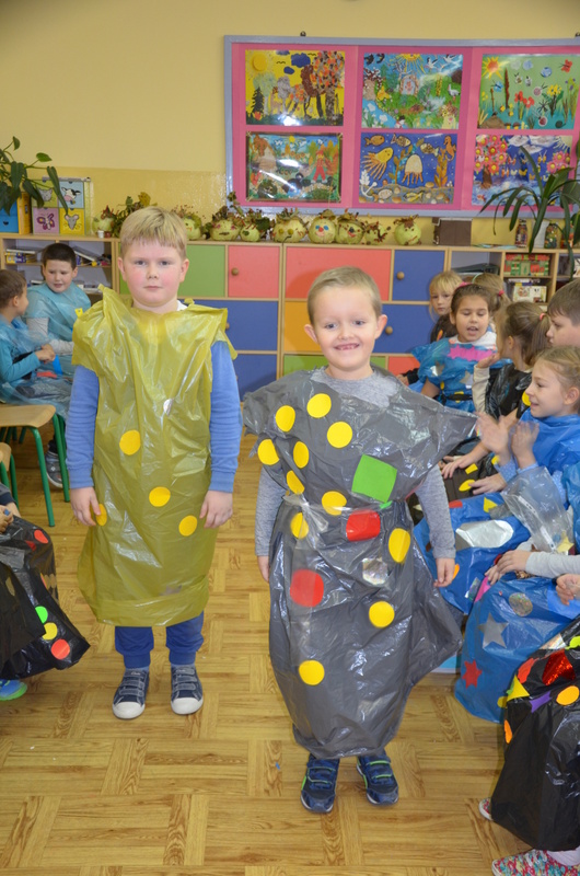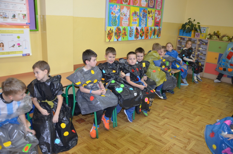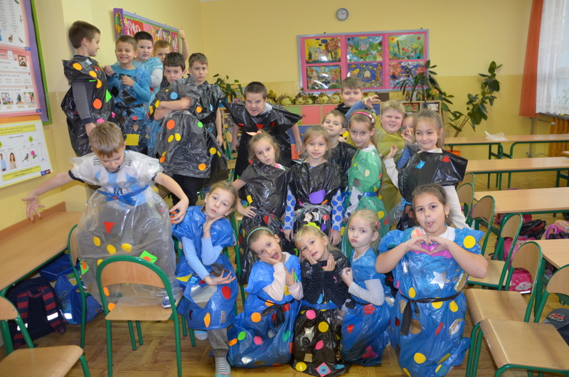 Uczniowie kl. IIc zaplanowali na listopadowe popołudnie twórcze i kreatywne działania. Inspiracją była deszczowa pogoda, typowa dla późnej jesieni. Tego dnia zwykłe worki na śmieci miały zamienić się w kolorowe płaszcze przeciwdeszczowe. Dzieci do tego celu w pełni wykorzystały swoją fantazję i wyobraźnię.