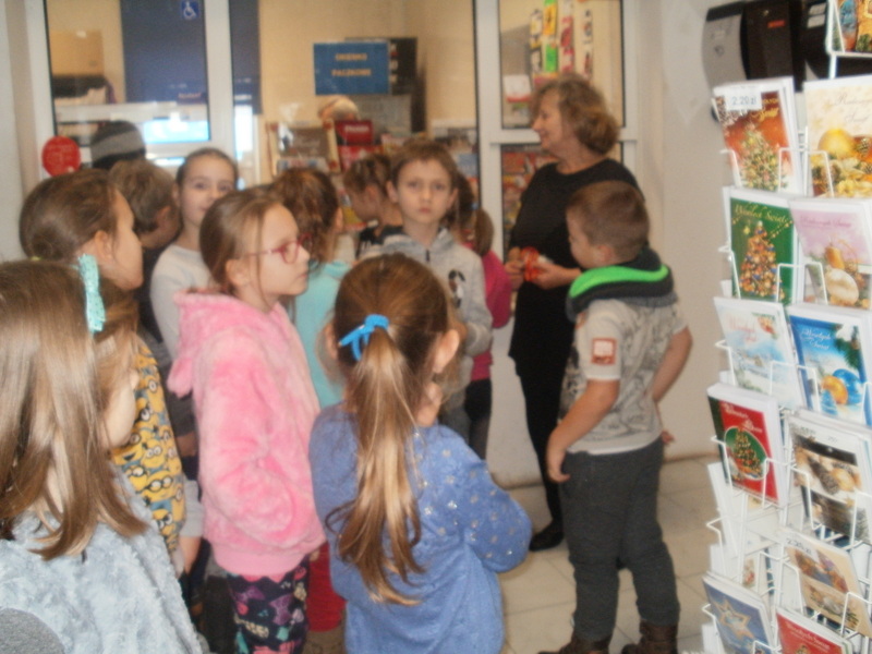 Dnia 8 grudnia uczniowie klasy II,,d'' wybrali się do placówki pocztowej aby przyjrzeć się pracy ludzi tam zatrudnionych i poznać zawód listonosza. Dzieci oglądały dawne i współczesne sposoby przesyłania korespondencji, a także wysłuchały historii na temat poczty polskiej. Później oglądały pomieszczenia dla klientów i pracowników poczty.