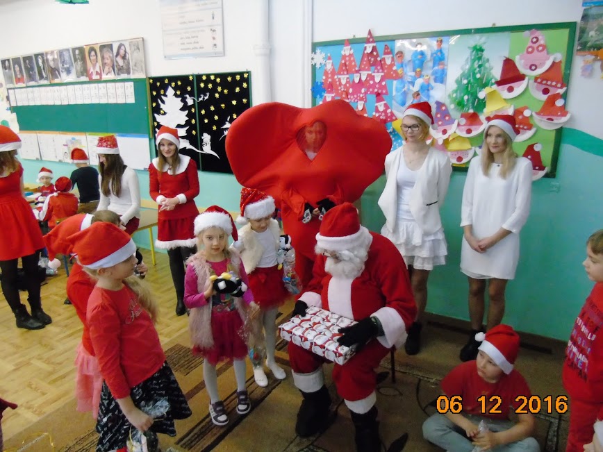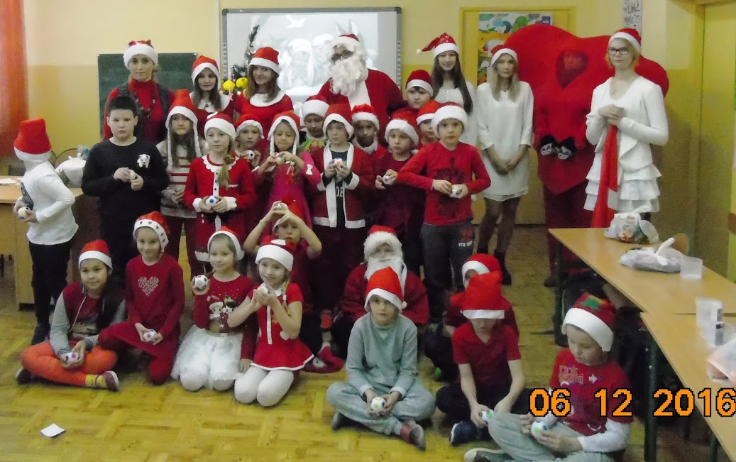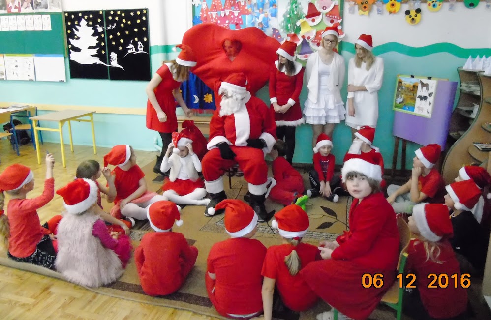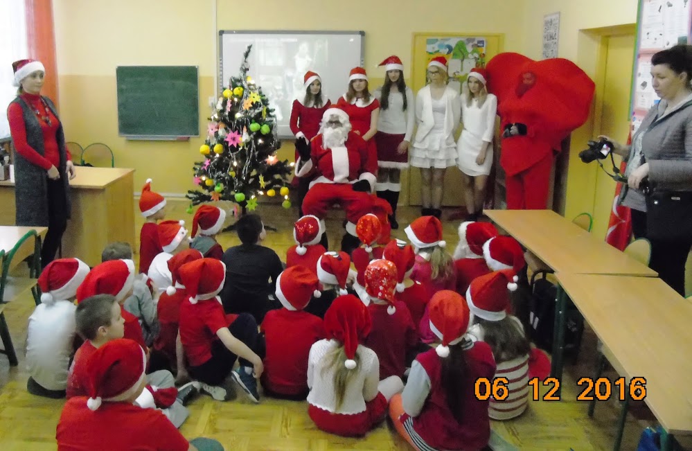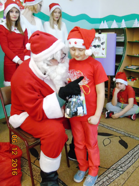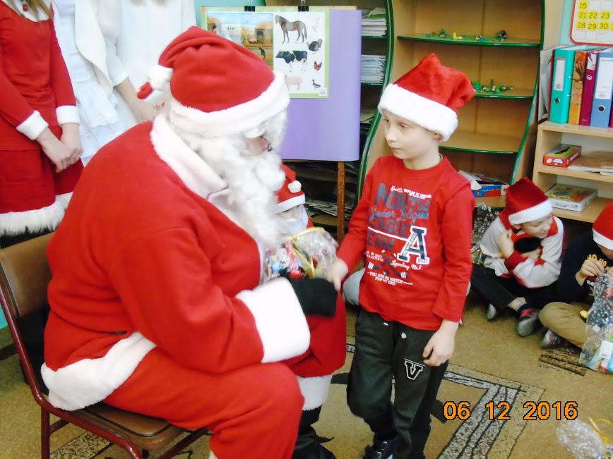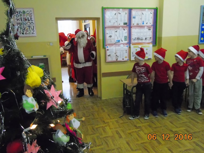 6 grudnia na zaproszenie Samorządu Uczniowskiego młodszej grupy wiekowej do szkoły zawitał Mikołaj ze Śnieżynkami. Wszyscy uczniowie w tym dniu ubrani na czerwono z niecierpliwością czekali na prezenty, które wręczył Nasz Gość. Dzieci przywitały Gościa piosenkami i wierszykami.