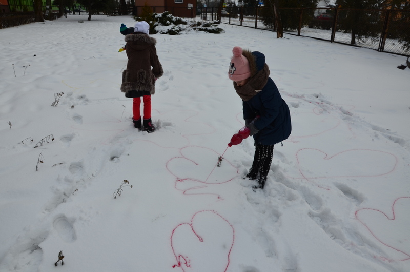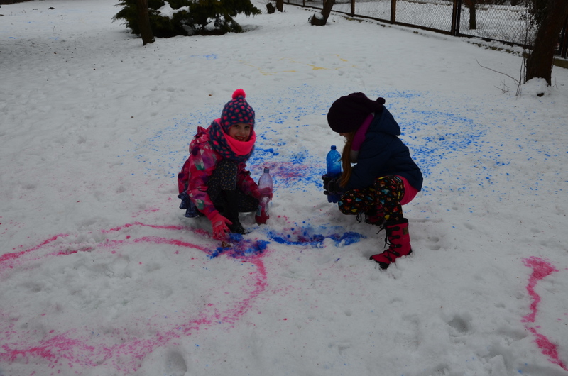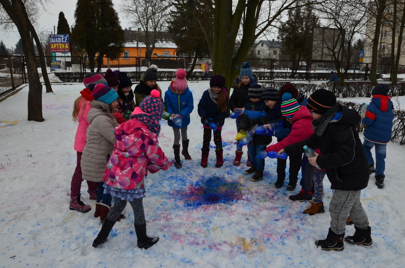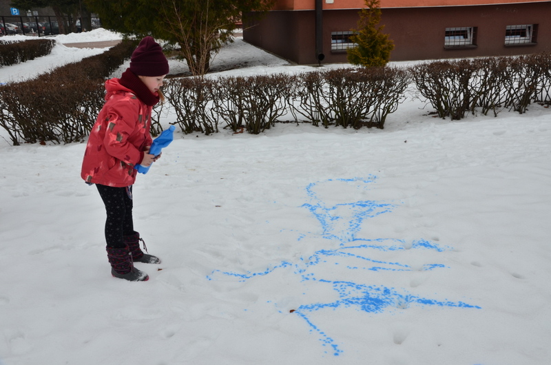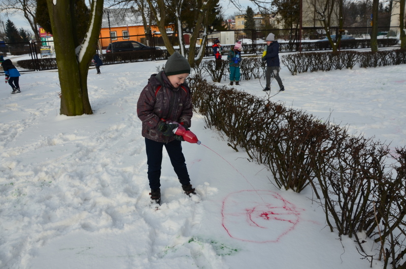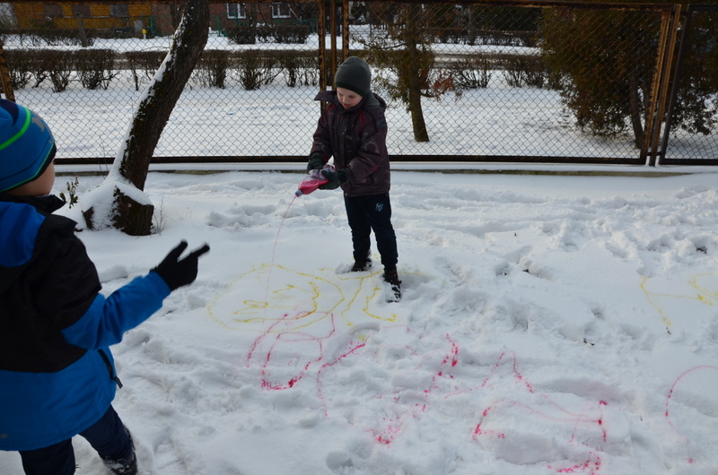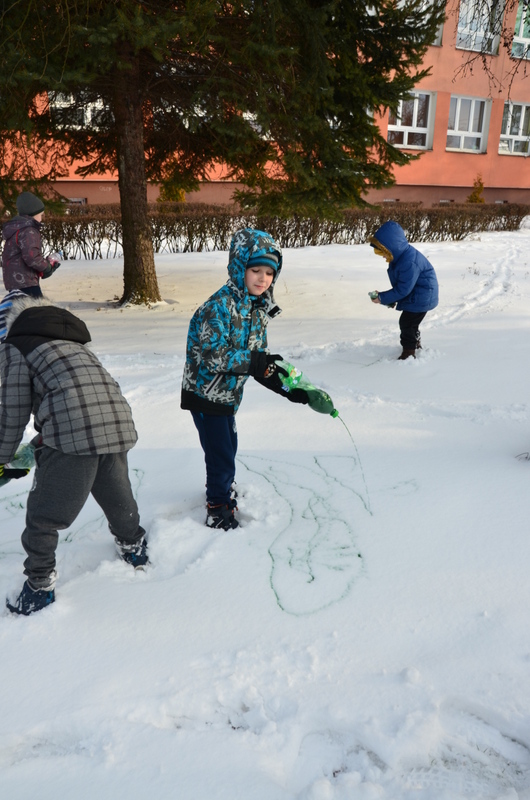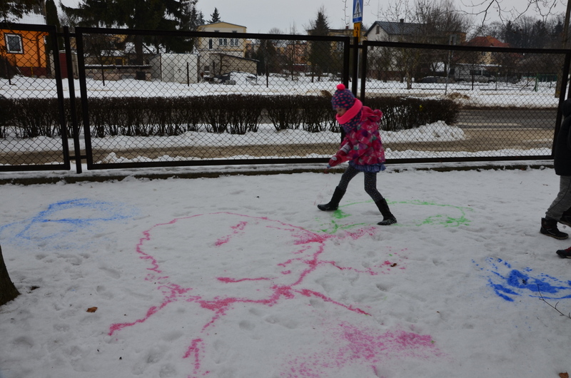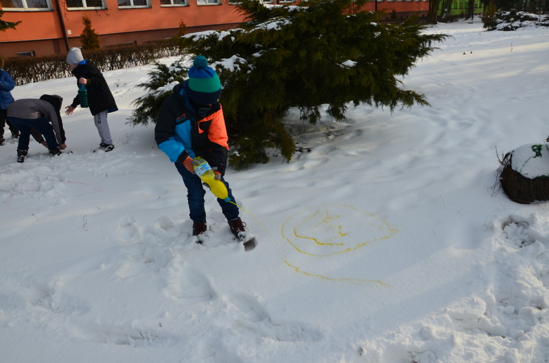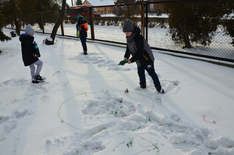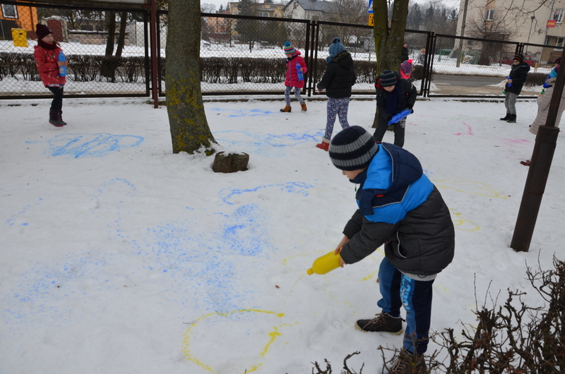 W klasach IIb i IIc odbyły się ciekawe zajęcia plastyczne, połączone z aktywnością ruchową na świeżym powietrzu. "Malowanie śniegu" było nie lada wyzwaniem i wspaniałą zabawą. Butelki z kolorową wodą zastąpiły dzieciom pędzle. Wielką frajdą okazało się stworzenie dzieła sztuki na białym i delikatnym podłożu.