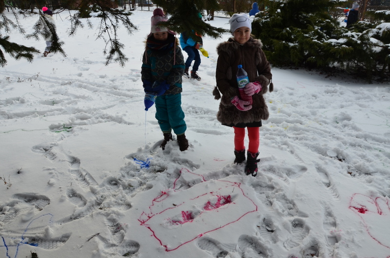 Fantazja maluchów była nieograniczona. Przekonały się, że śnieg można wykorzystać na wiele sposobów. Tym razem posłużył dzieciom do rozwijania wyobraźni i zdolności malarskich.