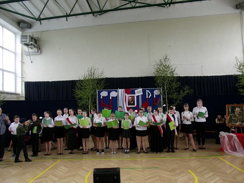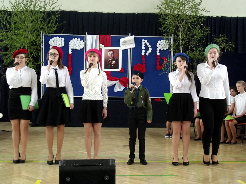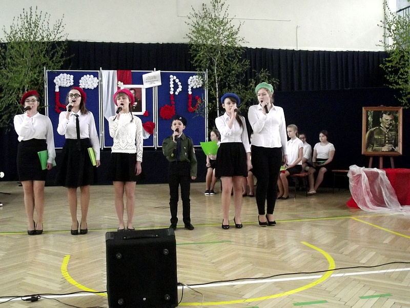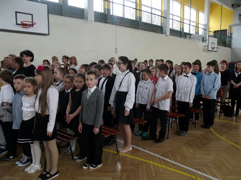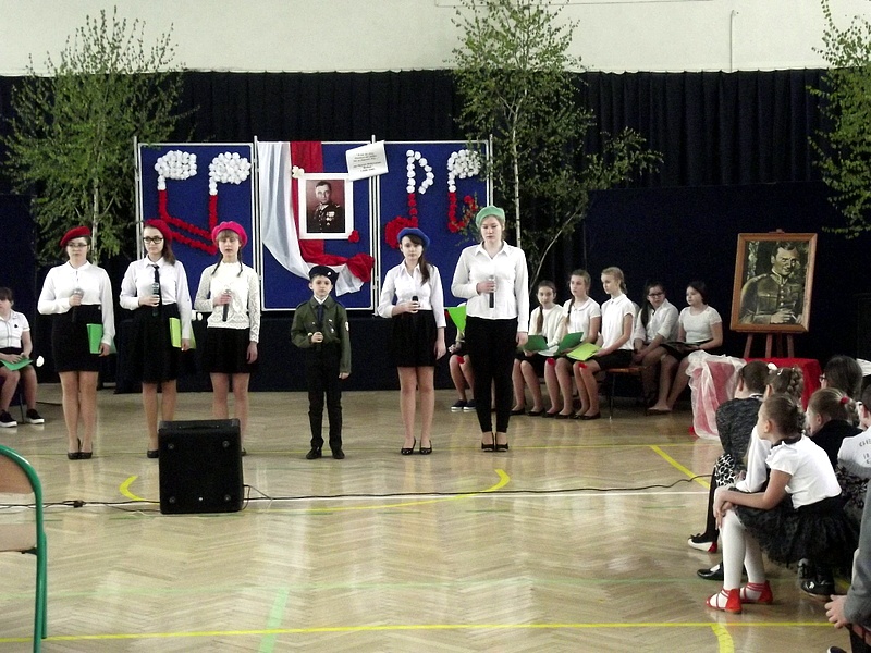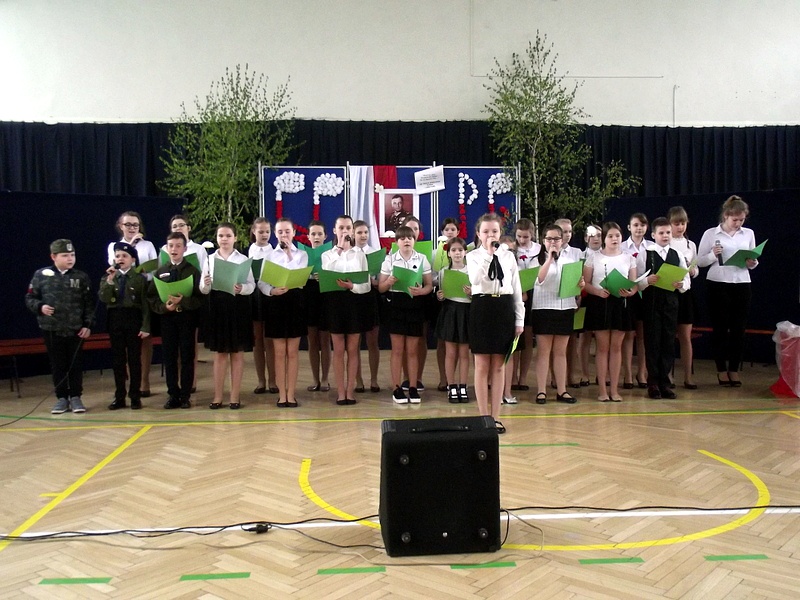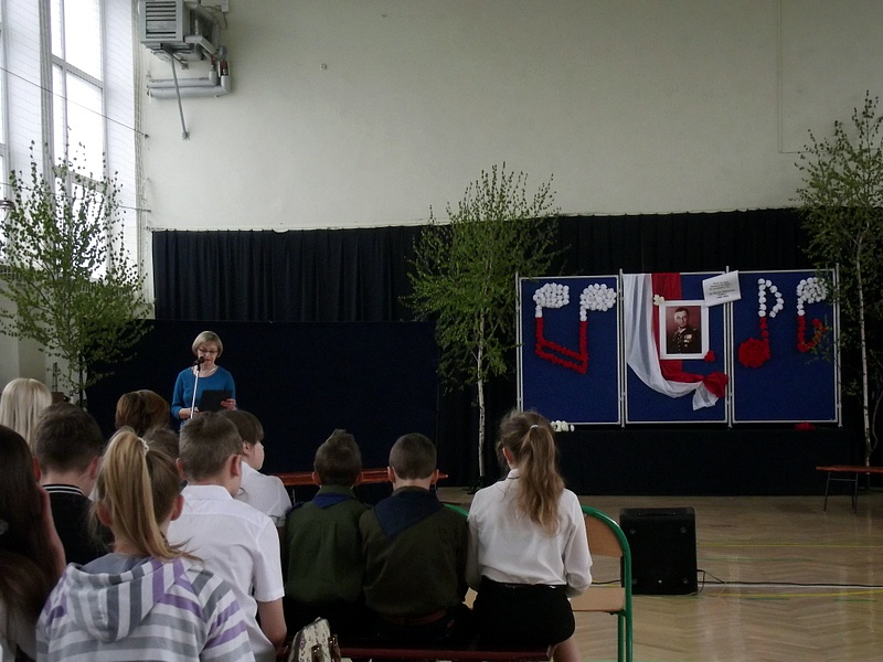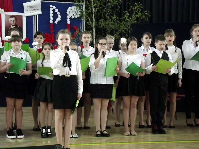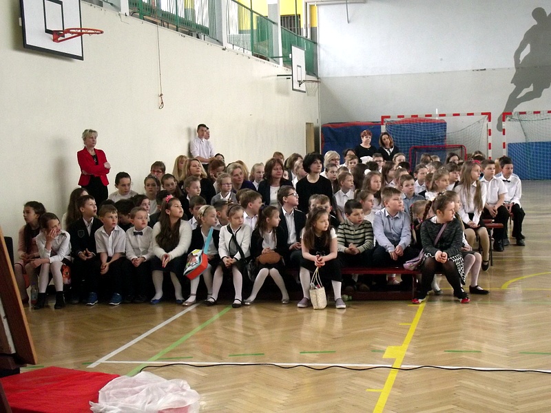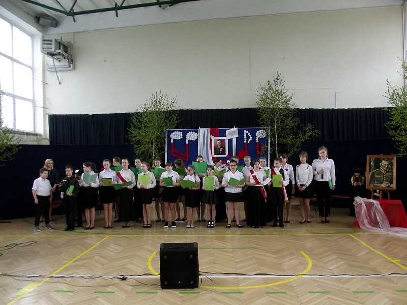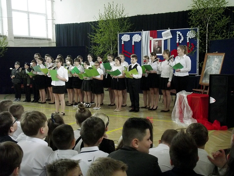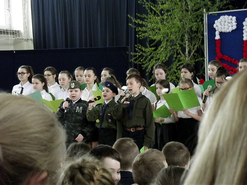 Wzruszający koncert pieśni patriotycznej nawiązujący do różnych wydarzeń polskiej historii od II wojny światowej zaprezentowali uczniowie. Muzyczne obrazy, piękne solowe, chóralne pieśni i piosenki, ciekawa dekoracja przeniosły widzów w świat, o którym uczniowie wiedzą tylko z lekcji historii, filmów, książek i opowieści dziadków. Wystąpili: Zuzanna Tychmańska (IVa), Wiktoria Boniecka, Mateusz Tokarz, Karolina Soboń (IV b), Karol Derlak, Patryk Roch, Patrycja Darmochwał (Va), Aleksandra Szabat, Oliwia Rybaczuk, Karolina Zymon (Vb), Julia Borkowska, Oliwia Czerw, Dawid Kudelski, Szymon Wac, Sebastian Zając (VI a), Honorata Dobrowolska, Kinga Żuraw (VI b), Patrycja Gontarz, Klaudia Lachowska, Julia Ciemięga, Dominika Krawiec, Martyna Wiśniewska, Maja Baranowska, Jakub Mazur, Milena Marciniuk, (VI c). Artystów z klas IV-VI chętnie wsparli absolwenci podstawówki - gimnazjaliści z Trójki: Marta Markiewicz, Małgorzata Pitus (II b) Agata Łaba, Aleksandra Kędziera, Justyna Szlonzak (III a), Kamil Simon, Gracjan Skwarek (III c). Koncert i jego oprawę przygotowały p. Justyna Marcych i p. Aneta Franke. Nad efektami dźwiękowymi czuwali uczniowie z radioli: Jakub Sarapkiewicz i Adrian Romaniewicz z klasy VI b. Przygotowaniem sali, nagłośnienia zajęli się pracownicy szkoły pod kierunkiem p. Tomasza Rubachy.