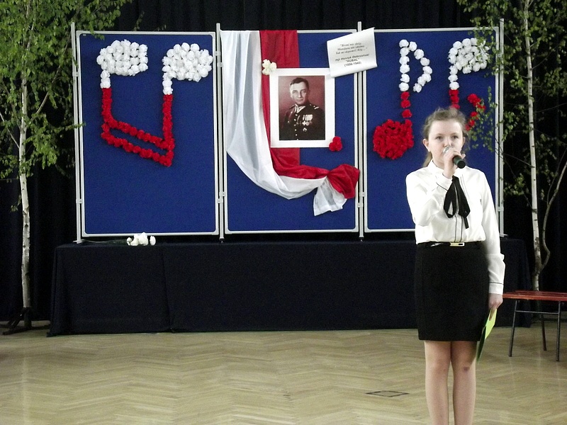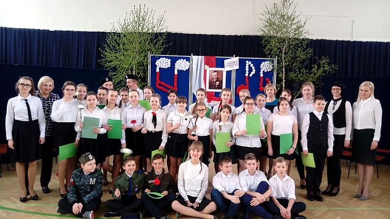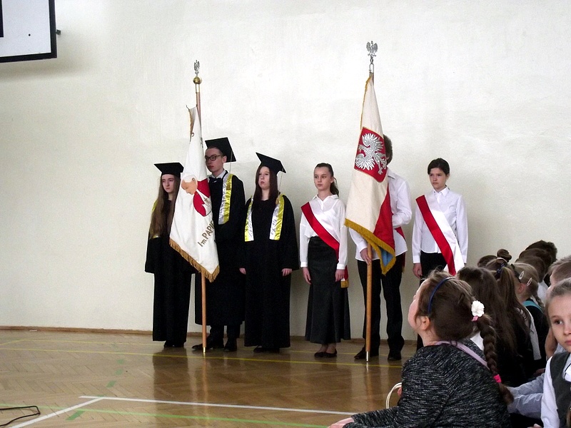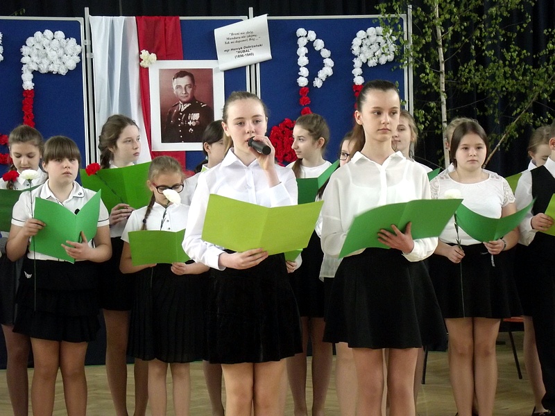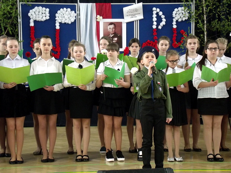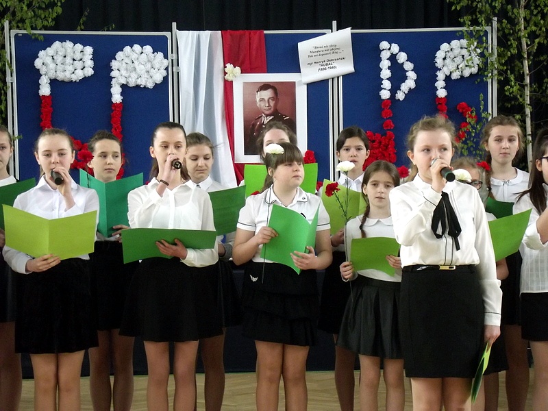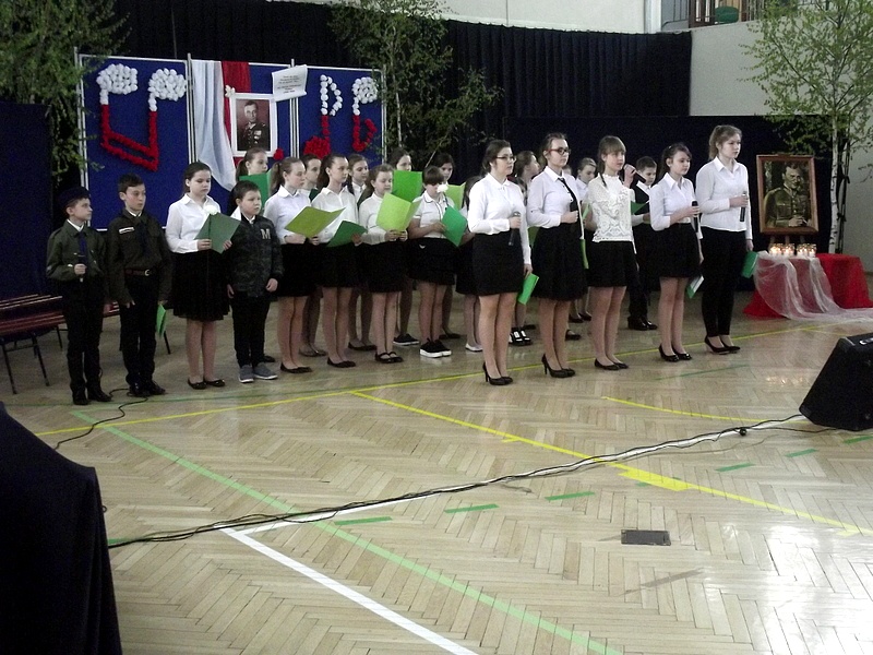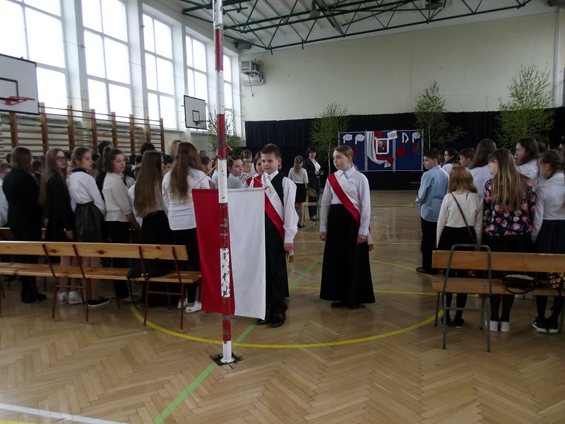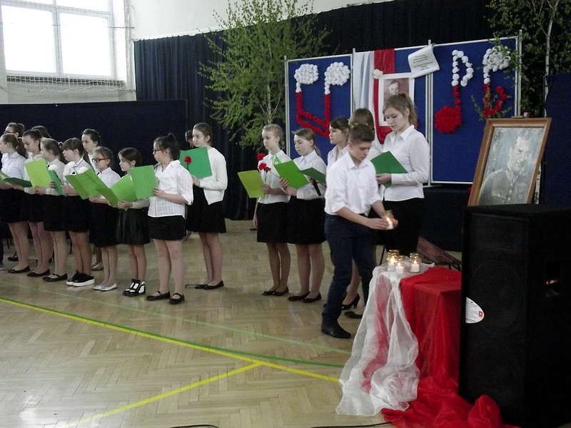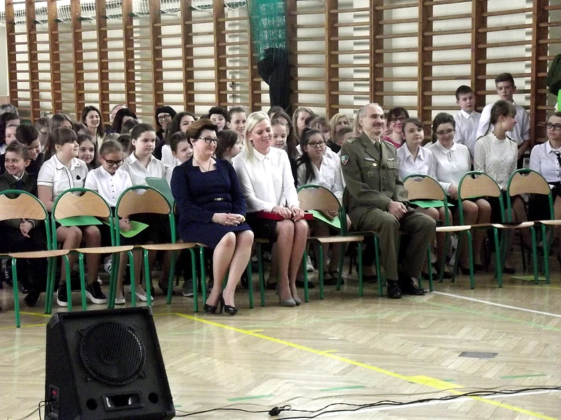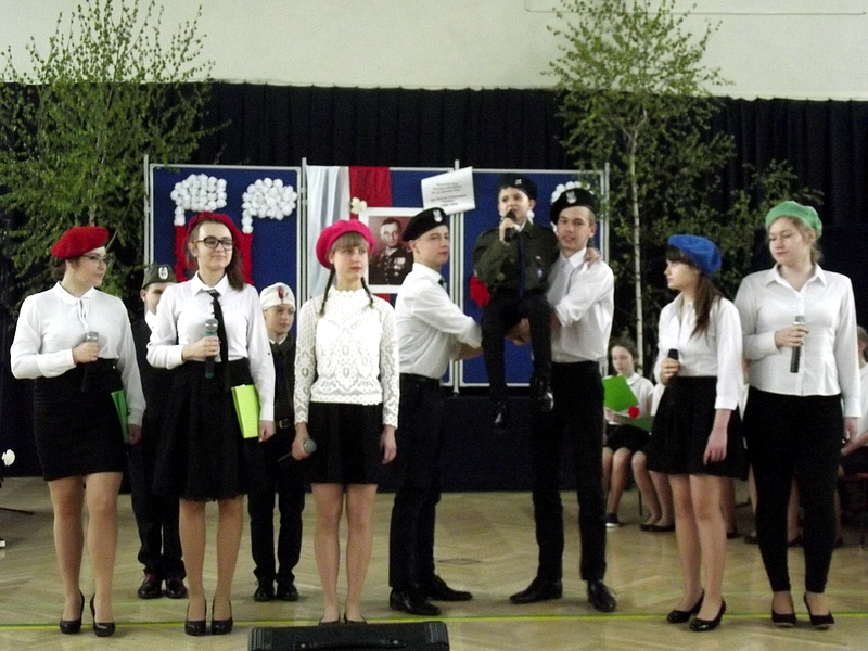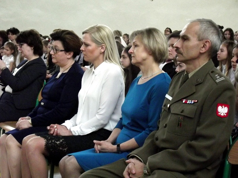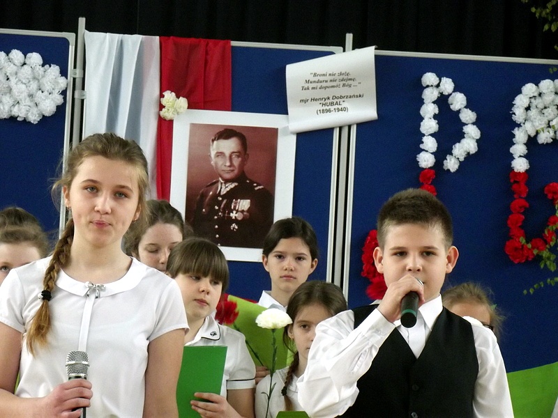 Wzruszający koncert pieśni patriotycznej nawiązujący do różnych wydarzeń polskiej historii od II wojny światowej zaprezentowali uczniowie. Muzyczne obrazy, piękne solowe, chóralne pieśni i piosenki, ciekawa dekoracja przeniosły widzów w świat, o którym uczniowie wiedzą tylko z lekcji historii, filmów, książek i opowieści dziadków. Wystąpili: Zuzanna Tychmańska (IVa), Wiktoria Boniecka, Mateusz Tokarz, Karolina Soboń (IV b), Karol Derlak, Patryk Roch, Patrycja Darmochwał (Va), Aleksandra Szabat, Oliwia Rybaczuk, Karolina Zymon (Vb), Julia Borkowska, Oliwia Czerw, Dawid Kudelski, Szymon Wac, Sebastian Zając (VI a), Honorata Dobrowolska, Kinga Żuraw (VI b), Patrycja Gontarz, Klaudia Lachowska, Julia Ciemięga, Dominika Krawiec, Martyna Wiśniewska, Maja Baranowska, Jakub Mazur, Milena Marciniuk, (VI c). Artystów z klas IV-VI chętnie wsparli absolwenci podstawówki - gimnazjaliści z Trójki: Marta Markiewicz, Małgorzata Pitus (II b) Agata Łaba, Aleksandra Kędziera, Justyna Szlonzak (III a), Kamil Simon, Gracjan Skwarek (III c). Koncert i jego oprawę przygotowały p. Justyna Marcych i p. Aneta Franke. Nad efektami dźwiękowymi czuwali uczniowie z radioli: Jakub Sarapkiewicz i Adrian Romaniewicz z klasy VI b. Przygotowaniem sali, nagłośnienia zajęli się pracownicy szkoły pod kierunkiem p. Tomasza Rubachy.
