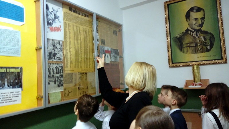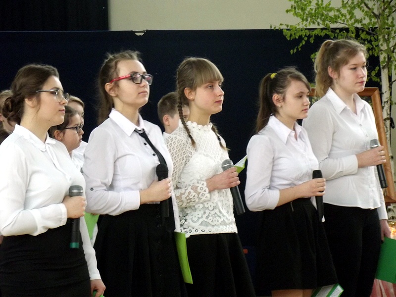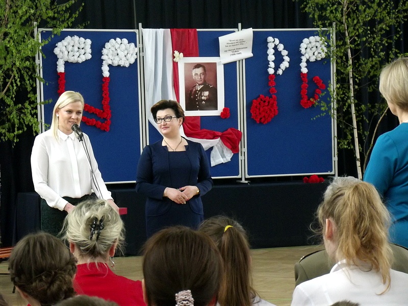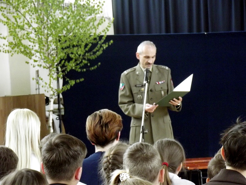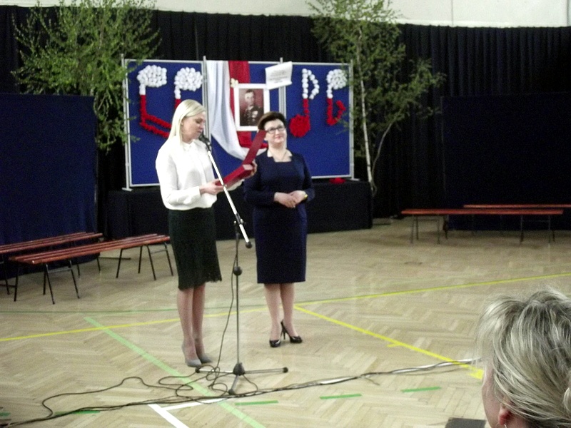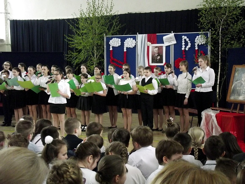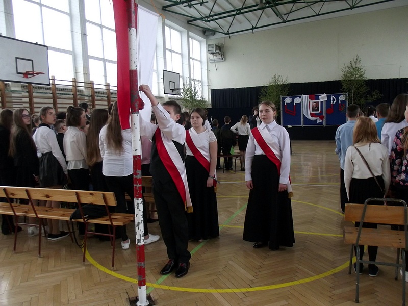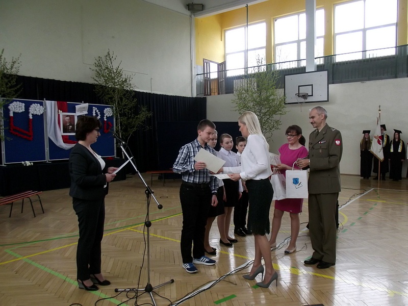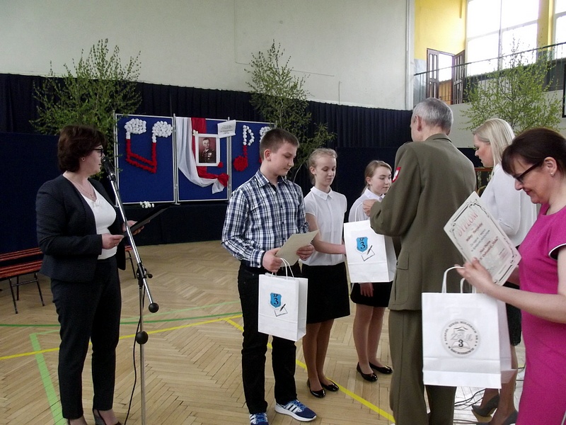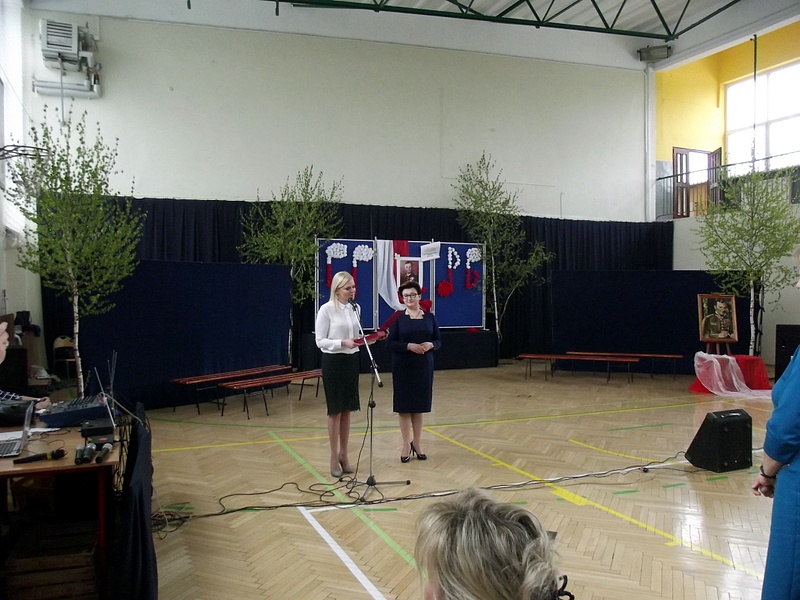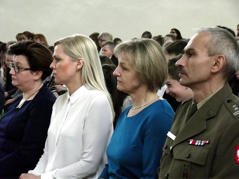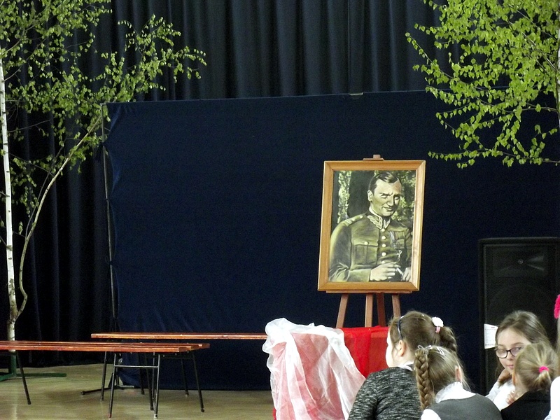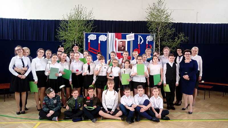 Wzruszający koncert pieśni patriotycznej nawiązujący do różnych wydarzeń polskiej historii od II wojny światowej zaprezentowali uczniowie. Muzyczne obrazy, piękne solowe, chóralne pieśni i piosenki, ciekawa dekoracja przeniosły widzów w świat, o którym uczniowie wiedzą tylko z lekcji historii, filmów, książek i opowieści dziadków. Wystąpili: Zuzanna Tychmańska (IVa), Wiktoria Boniecka, Mateusz Tokarz, Karolina Soboń (IV b), Karol Derlak, Patryk Roch, Patrycja Darmochwał (Va), Aleksandra Szabat, Oliwia Rybaczuk, Karolina Zymon (Vb), Julia Borkowska, Oliwia Czerw, Dawid Kudelski, Szymon Wac, Sebastian Zając (VI a), Honorata Dobrowolska, Kinga Żuraw (VI b), Patrycja Gontarz, Klaudia Lachowska, Julia Ciemięga, Dominika Krawiec, Martyna Wiśniewska, Maja Baranowska, Jakub Mazur, Milena Marciniuk, (VI c). Artystów z klas IV-VI chętnie wsparli absolwenci podstawówki - gimnazjaliści z Trójki: Marta Markiewicz, Małgorzata Pitus (II b) Agata Łaba, Aleksandra Kędziera, Justyna Szlonzak (III a), Kamil Simon, Gracjan Skwarek (III c). Koncert i jego oprawę przygotowały p. Justyna Marcych i p. Aneta Franke. Nad efektami dźwiękowymi czuwali uczniowie z radioli: Jakub Sarapkiewicz i Adrian Romaniewicz z klasy VI b. Przygotowaniem sali, nagłośnienia zajęli się pracownicy szkoły pod kierunkiem p. Tomasza Rubachy.