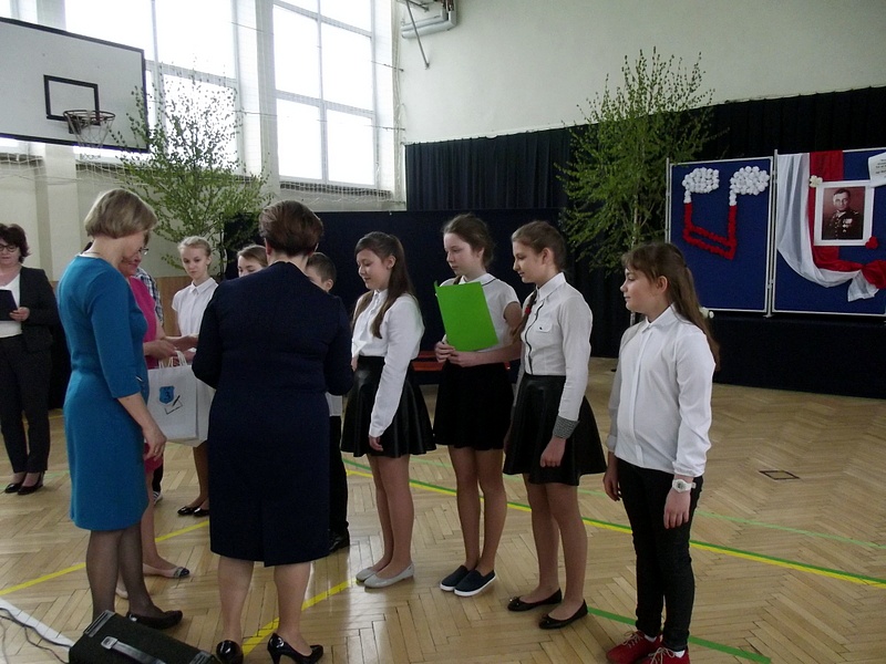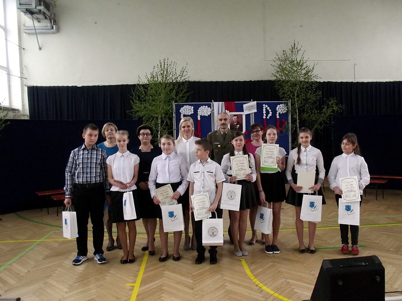 Następnie p. Marzanna Bednarczuk ogłosiła wyniki konkursów poświęconych Patronowi Szkoły pod hasłem „Nasz Patron mjr Henryk Dobrzański „Hubal”. Uczestniczyły w nich uczniowie z klas IV-VI, a zorganizowała je nauczycielka historii p. Irmina Spisacka Najobszerniejszą wiedzą wykazał się i zwycięzcą konkursu został Grzegorz Kędzierski z klasy VI b, II miejsce zajęła Honorata Dobrowolska z klasy VI b, na trzecim miejscu uplasowali się Klaudia Lachowska z kl. VI c i Paweł Płonkowski z kl. V b. W konkursie plastycznym I miejscem nagrodzono Milenę Turzyńską z kl. V a, II miejsce zajęła Kamila Dziomaga z kl. IV b, III miejsce przypadło Oliwii Czerw i Julii Borkowskiej z kl. VI a.