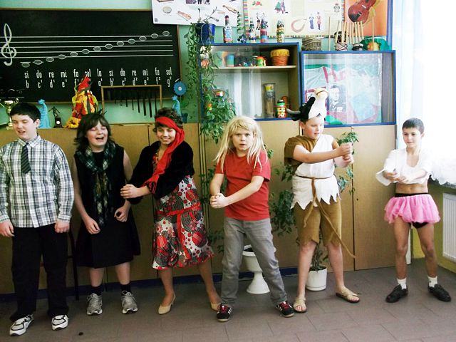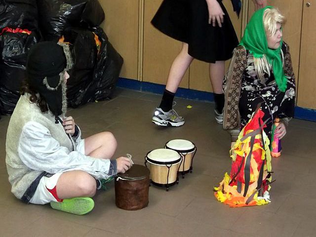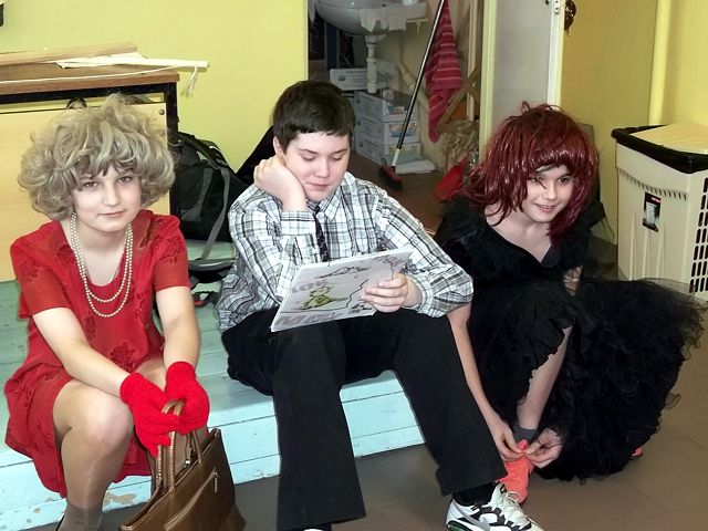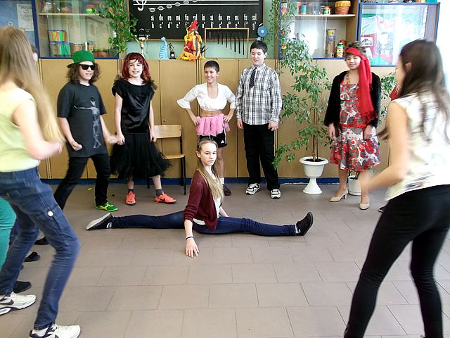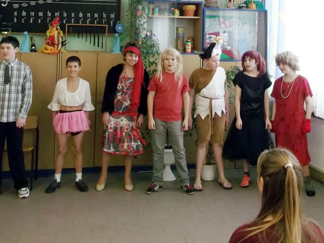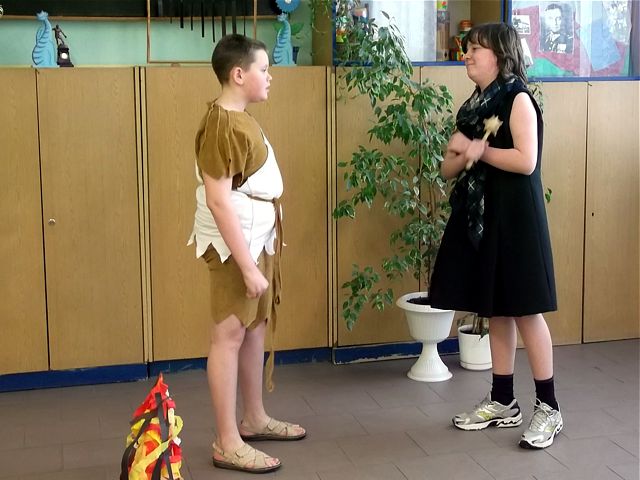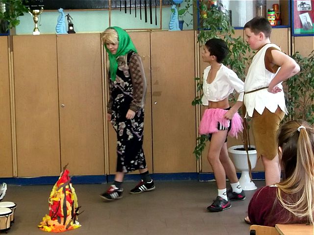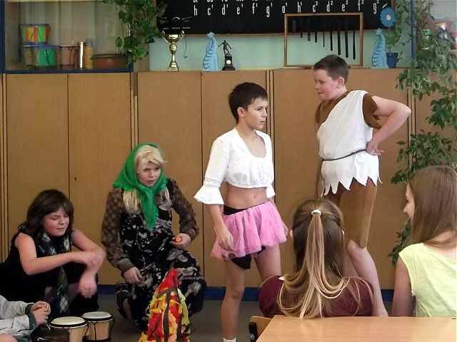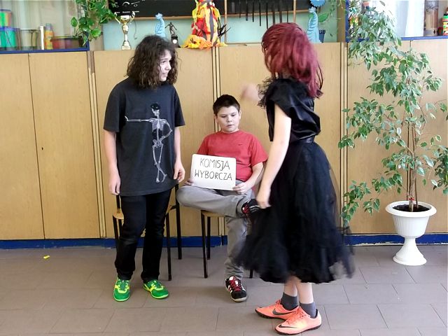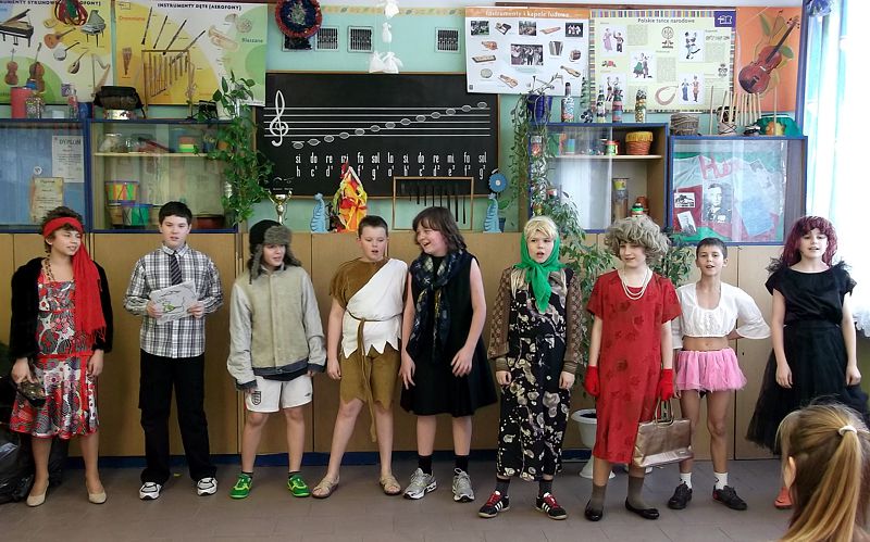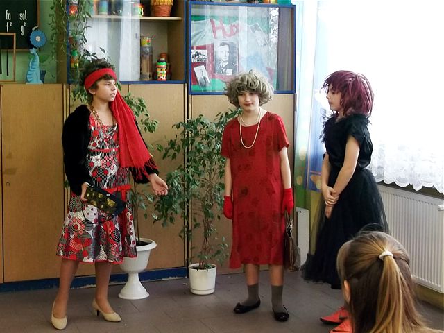 Panowie z VI c grali matki, żony, kuzynki, dziewczynki, feministki oraz role męskie. Sceny życia plemiennego, polowanie, porwanie panny z innego plemienia oraz tańce rytualne. Ważnym punktem przedstawienia był Paryż i piękne obywatelki miasta, kobiety walczące o równouprawnienie. Nie było łatwo chodzić w szpilkach z peruką na głowie, ba, nawet w tychże pantofelkach tańczyć kankana. Wszystkie próby wywoływały wybuchy śmiechu, kreatywność aktorów wprowadziła do scenariusza tańce i piosenki współczesne. Dziewczynkom z VIc bardzo podobał się taki sposób wyrażania sympatii. Dziękujemy koledzy!
