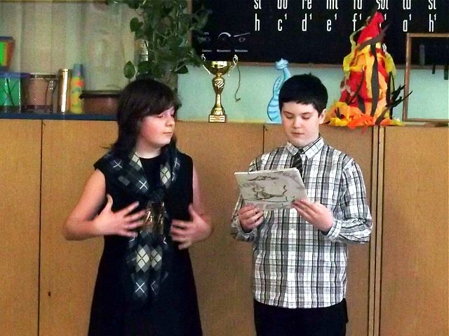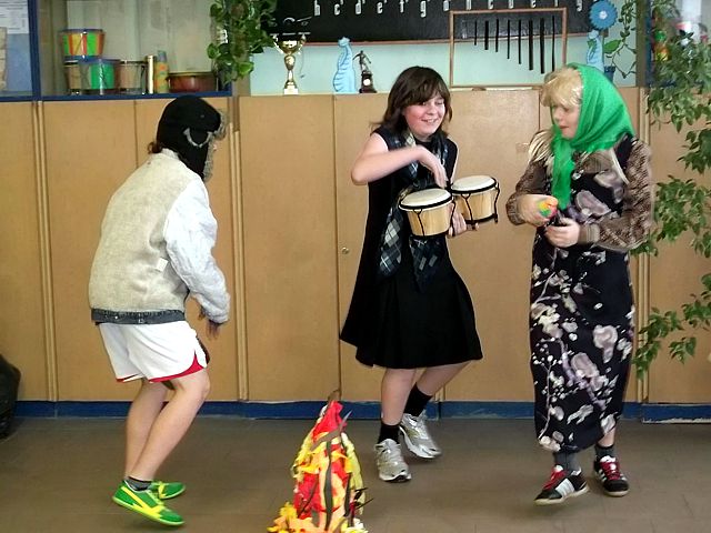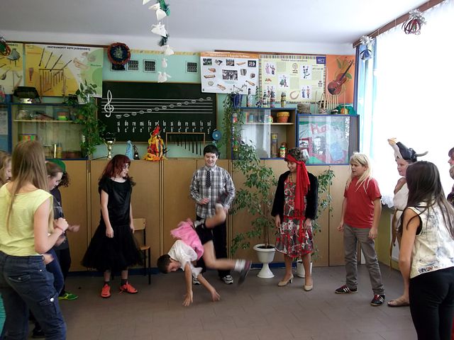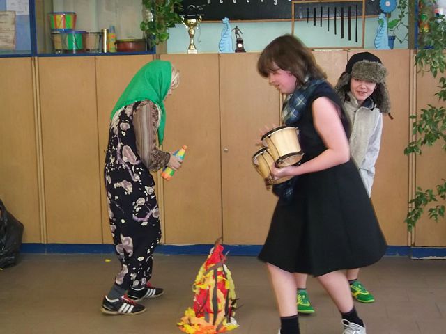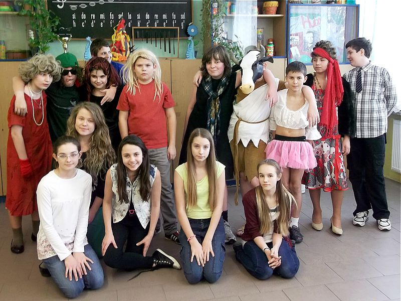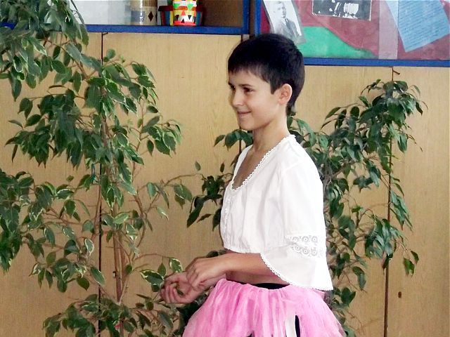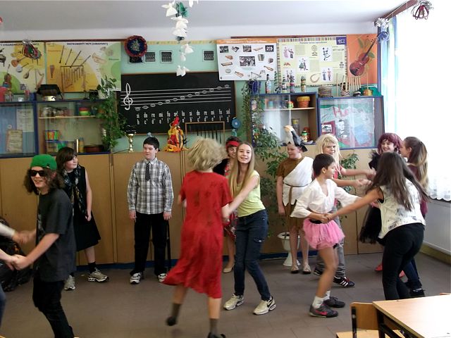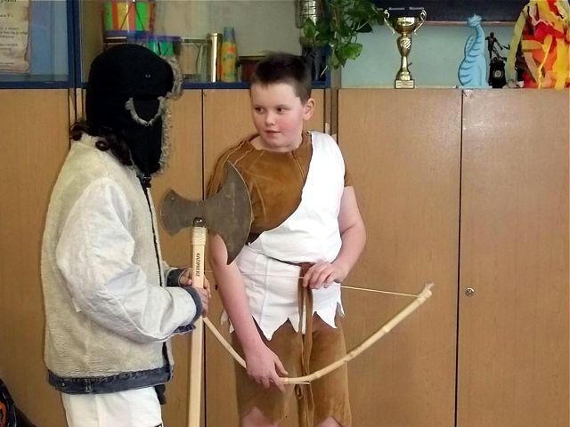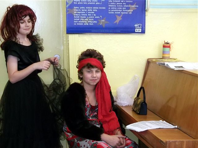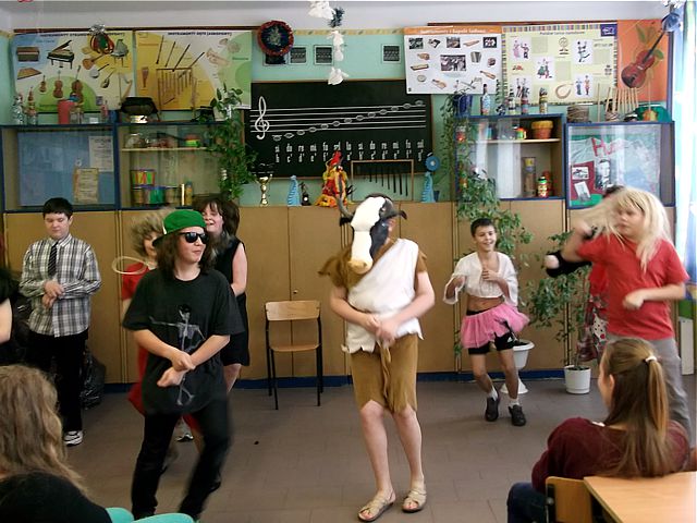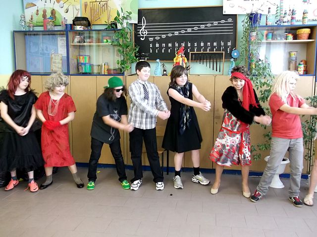Panowie z VI c grali matki, żony, kuzynki, dziewczynki, feministki oraz role męskie. Sceny życia plemiennego, polowanie, porwanie panny z innego plemienia oraz tańce rytualne. Ważnym punktem przedstawienia był Paryż i piękne obywatelki miasta, kobiety walczące o równouprawnienie. Nie było łatwo chodzić w szpilkach z peruką na głowie, ba, nawet w tychże pantofelkach tańczyć kankana. Wszystkie próby wywoływały wybuchy śmiechu, kreatywność aktorów wprowadziła do scenariusza tańce i piosenki współczesne. Dziewczynkom z VIc bardzo podobał się taki sposób wyrażania sympatii. Dziękujemy koledzy!