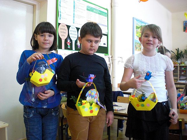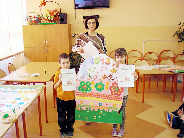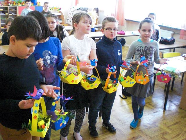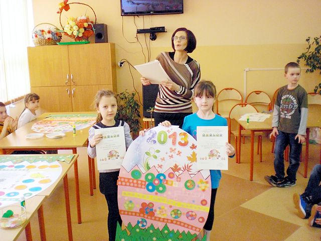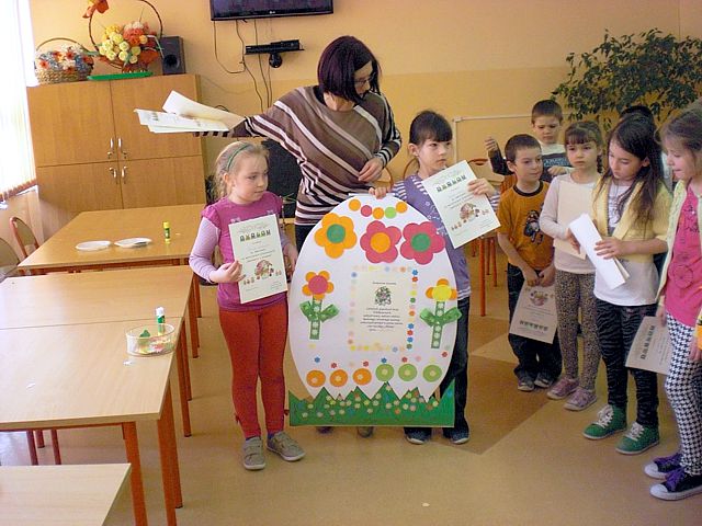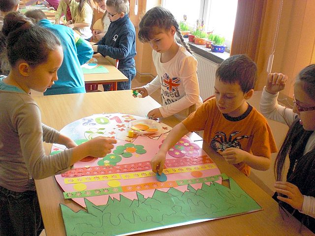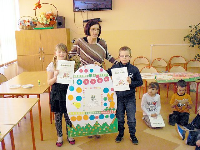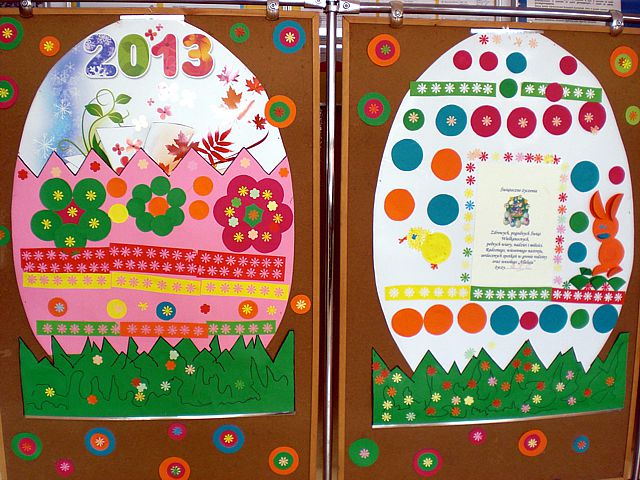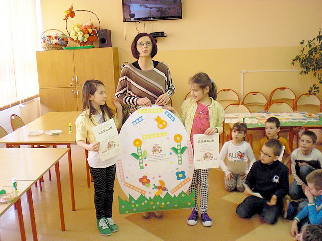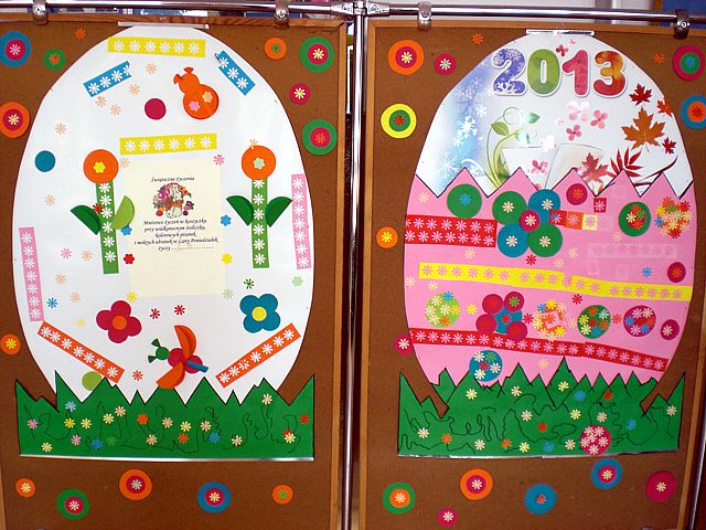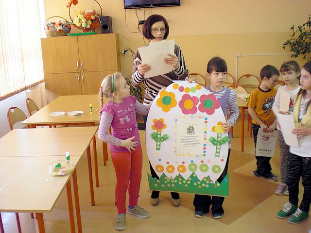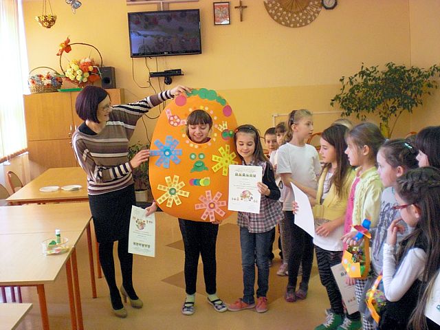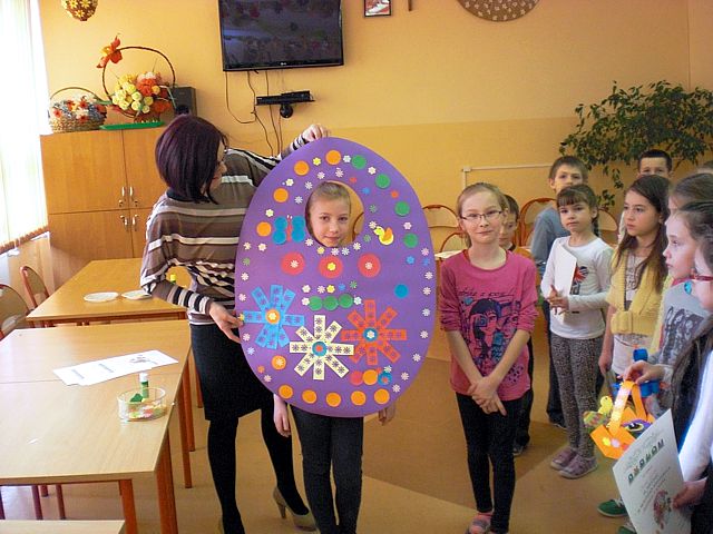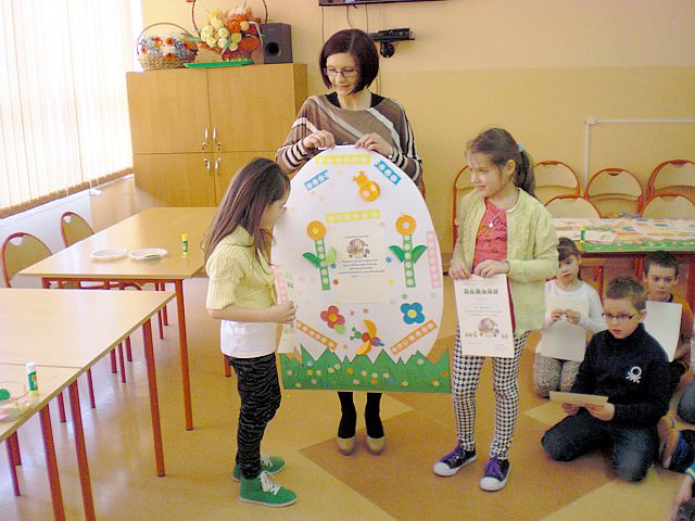 Samorząd Uczniowski młodszej grupy wiekowej zorganizował warsztaty plastyczne pod hasłem „Zabawa z pisankami”. Uczestnicy spotkania obejrzeli krótką prezentację o tworzeniu ozdób wielkanocnych, a następnie ozdobili wielkie kartonowe szablony. Stopień trudności zadania dostosowany był do wieku dzieci, ale radość z wykonywania zadania była jednakowo wielka dla wszystkich. Dzięki dzieciom z klas pierwszych w szkole zrobiło się kolorowo.