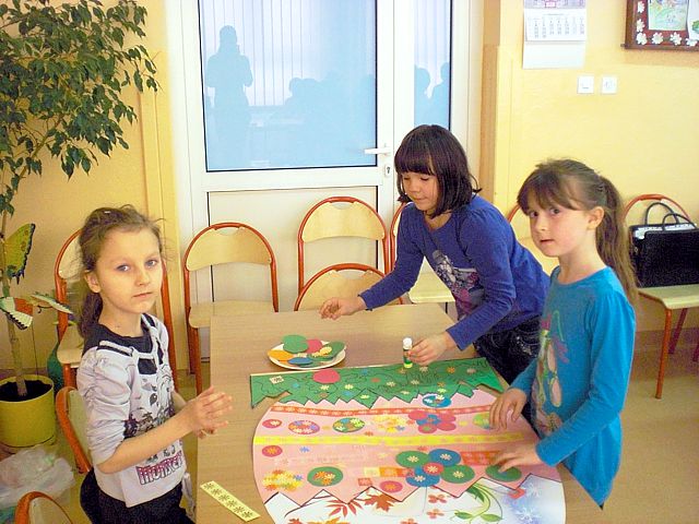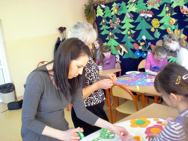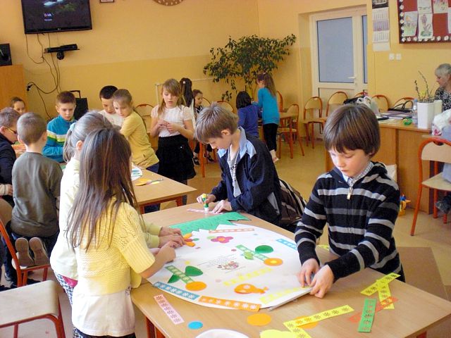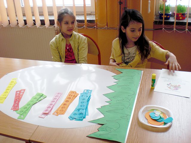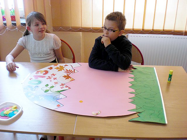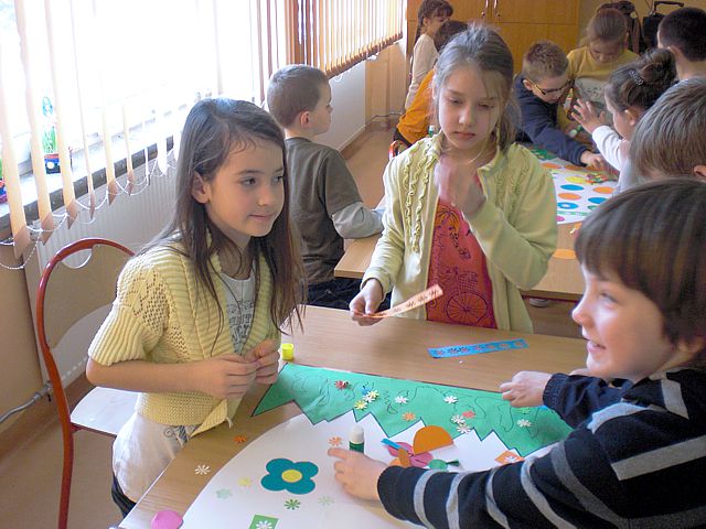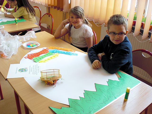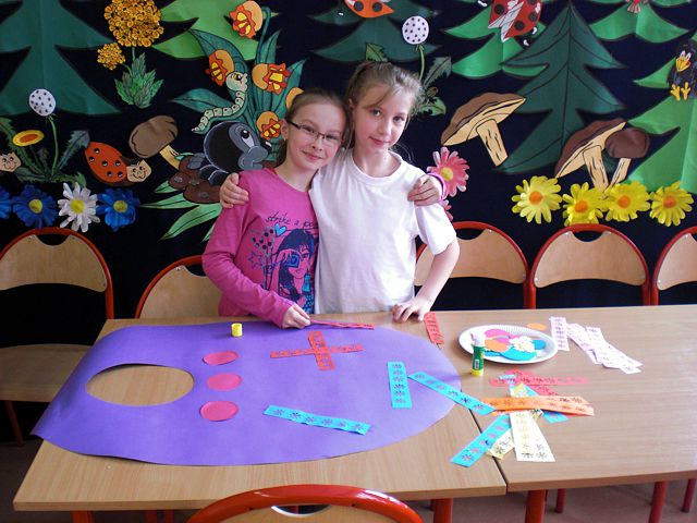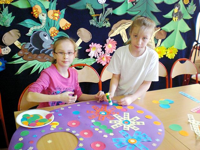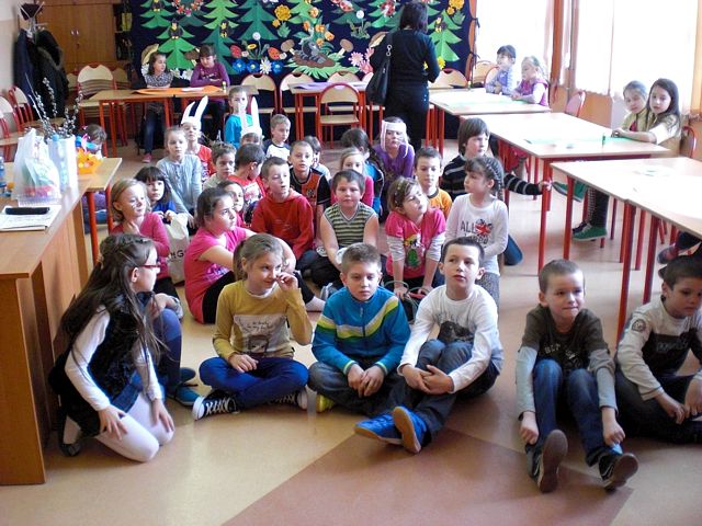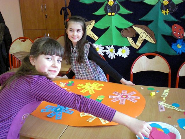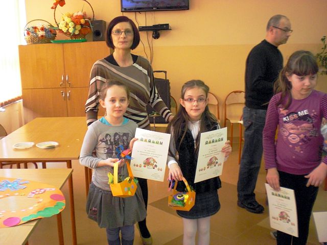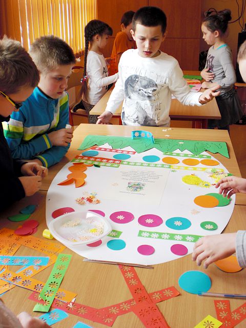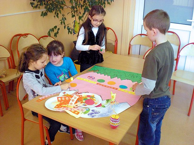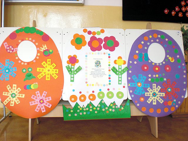 Samorząd Uczniowski młodszej grupy wiekowej zorganizował warsztaty plastyczne pod hasłem „Zabawa z pisankami”. Uczestnicy spotkania obejrzeli krótką prezentację o tworzeniu ozdób wielkanocnych, a następnie ozdobili wielkie kartonowe szablony. Stopień trudności zadania dostosowany był do wieku dzieci, ale radość z wykonywania zadania była jednakowo wielka dla wszystkich. Dzięki dzieciom z klas pierwszych w szkole zrobiło się kolorowo.