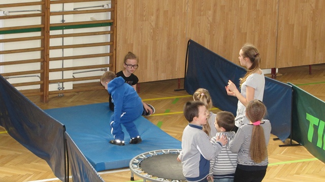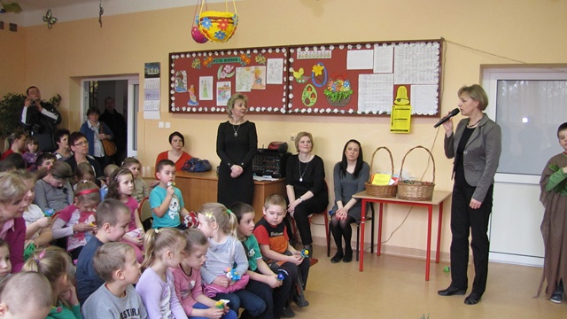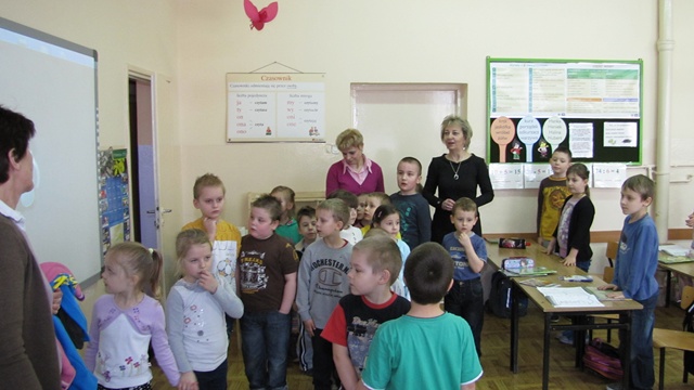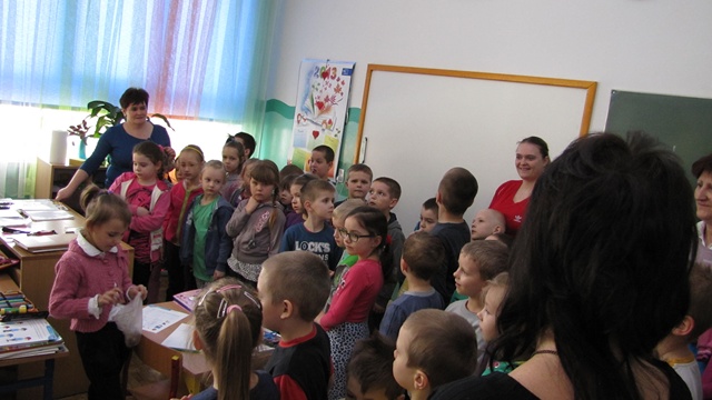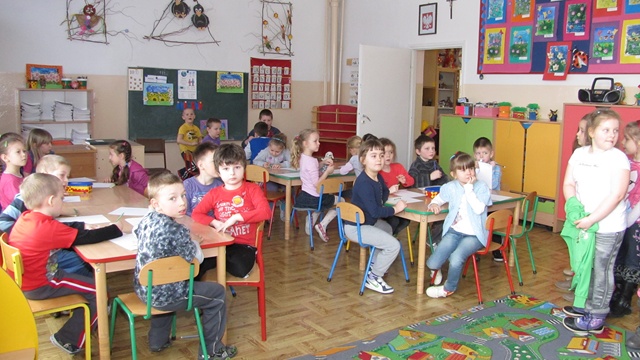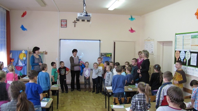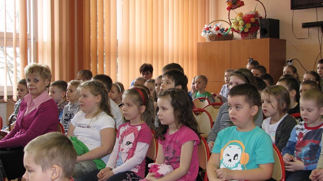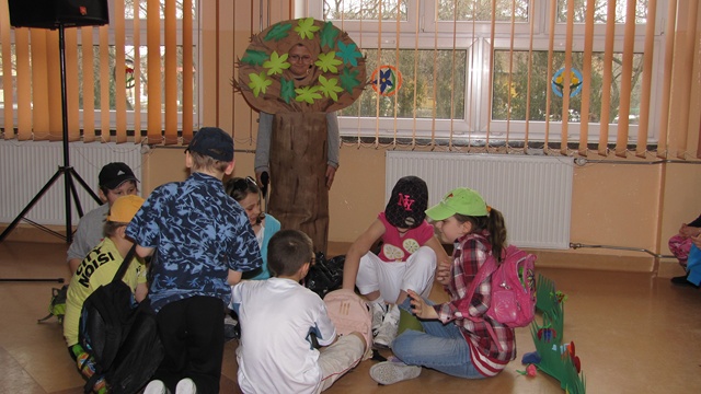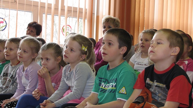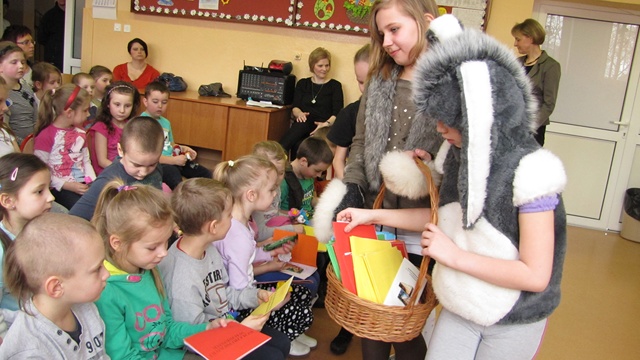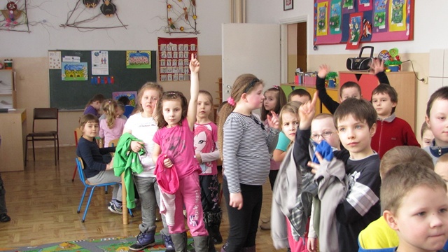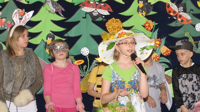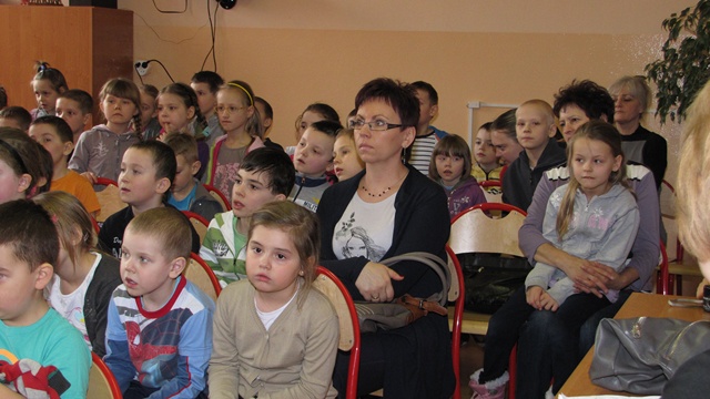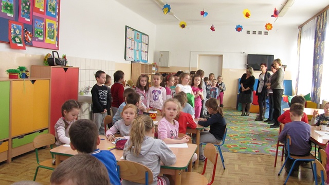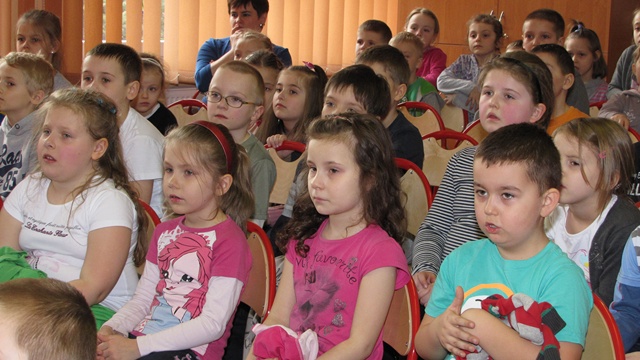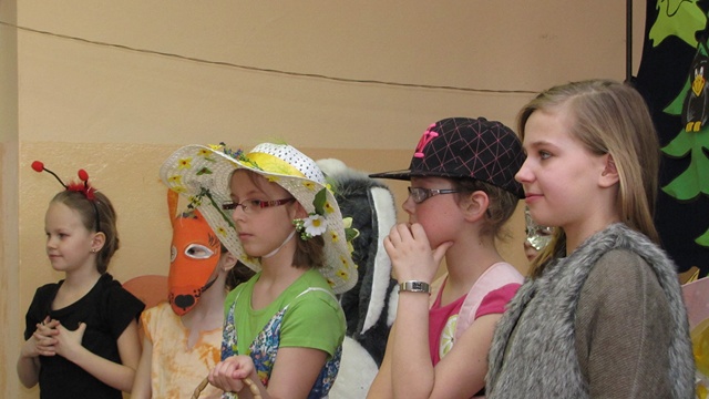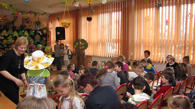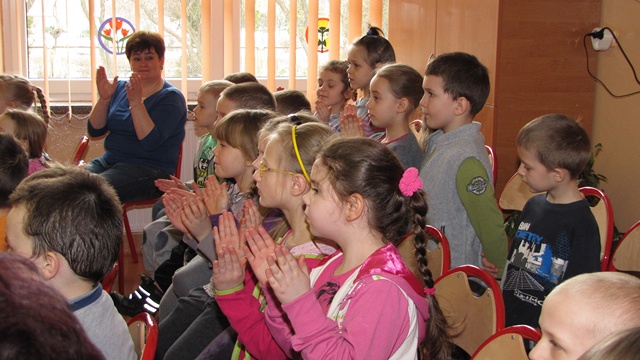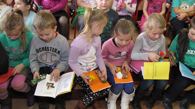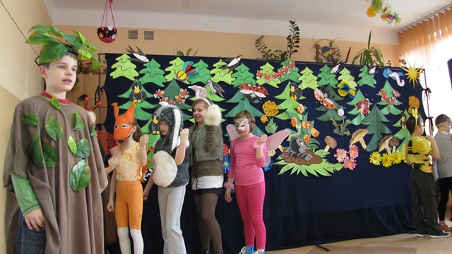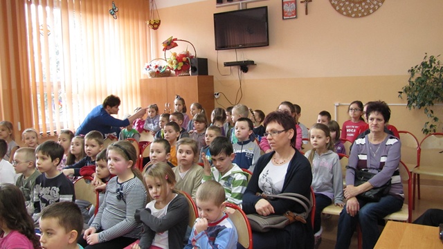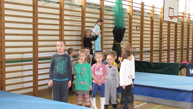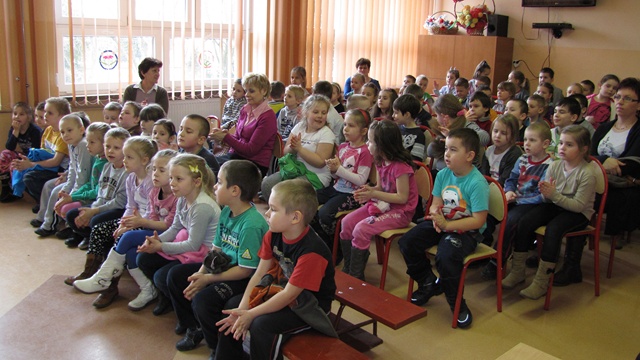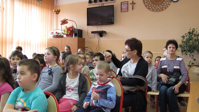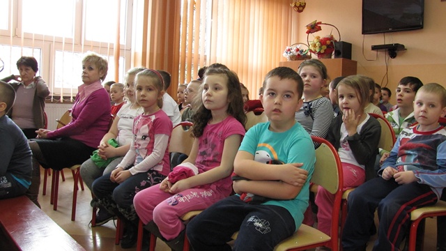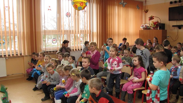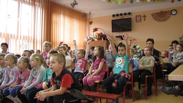 Każde mogło wybrać coś dla siebie. Jedne rzucały piłką do kosza, inne pokonywały tory przeszkód, jeszcze inne bawiły się kołem hula – hop. Na ich twarzach malowały się uśmiech i radość. Widać było, że są zadowolone. Potem zwiedzały szkołę. Odwiedziły sale klas I, II i oddział przedszkolny. Zobaczyły miejsca, w których uczą się ich starsze koleżanki i koledzy. Widziały jak można korzystać z tablicy interaktywnej, były na lekcji muzyki w kl. II, śpiewały z klasą piosenki. Dzień atrakcji zakończyła inscenizacja o tematyce ekologicznej „Wiosna w lesie”, którą przygotowali uczniowie kl. III a pod kierunkiem pani Alicji Dziedzic. Wartka, bardzo żywa część artystyczna bardzo podobała się przedszkolakom. Reagowały na różne rytmy muzyki klaskaniem, tupaniem i wspólnym śpiewem. Były szczęśliwe i zauroczone pobytem w szkole. Na koniec przedszkolaki otrzymały drobne upominki w postaci kolorowanek, słodyczy i drobnych wiosennych kwiatów wykonanych przez trzecioklasistów.