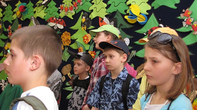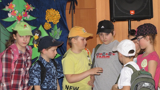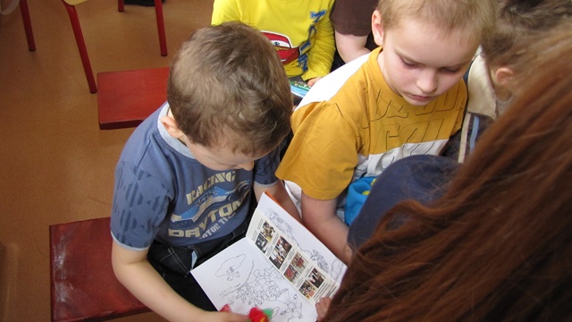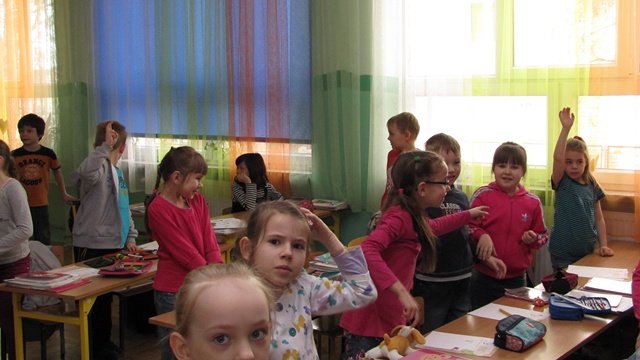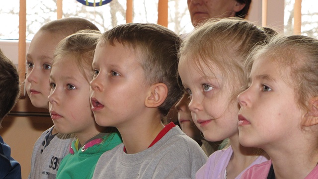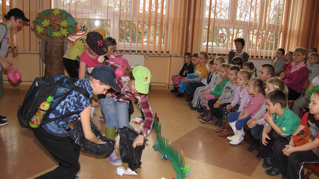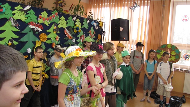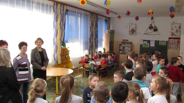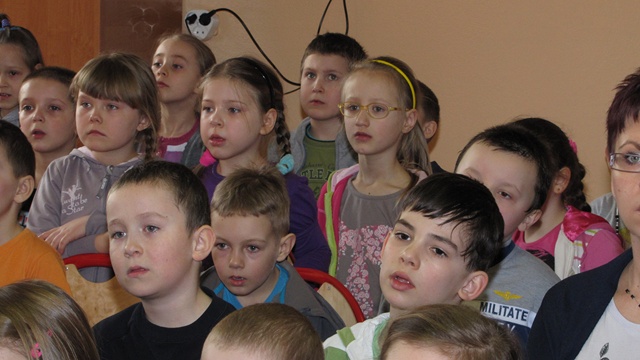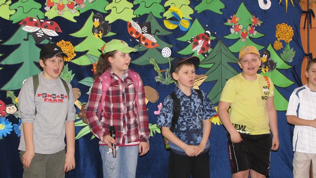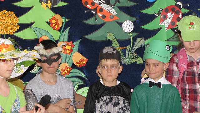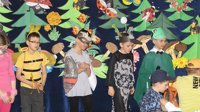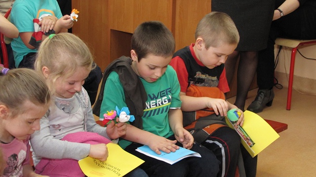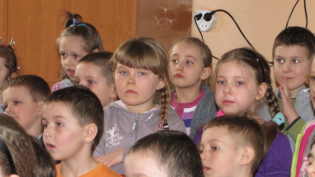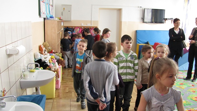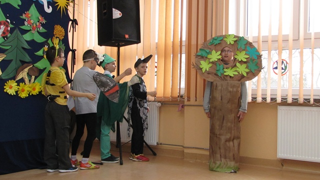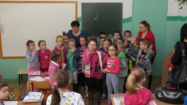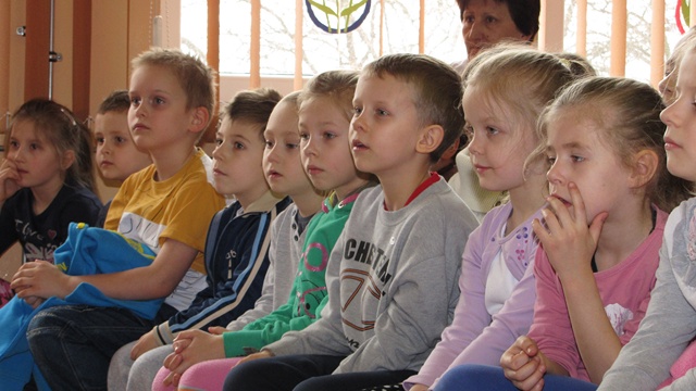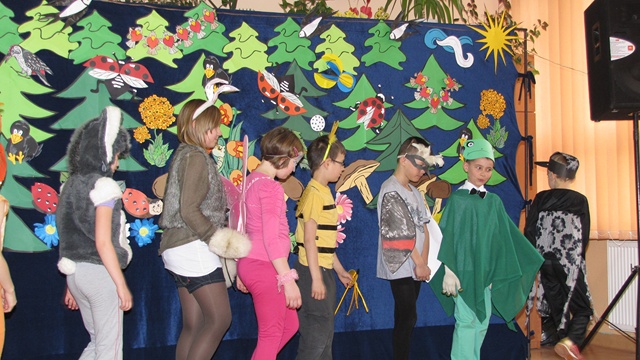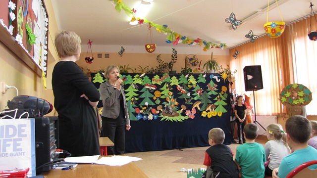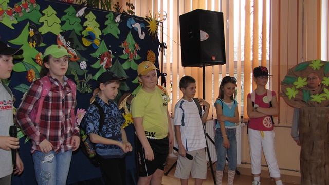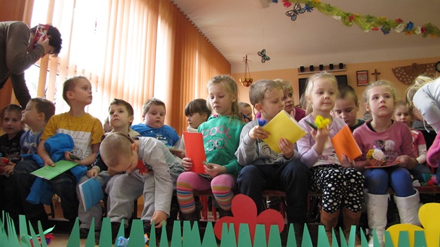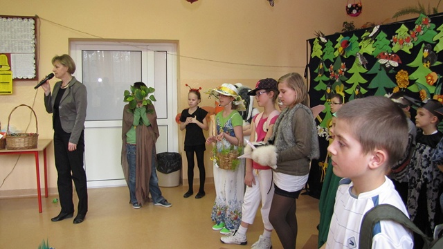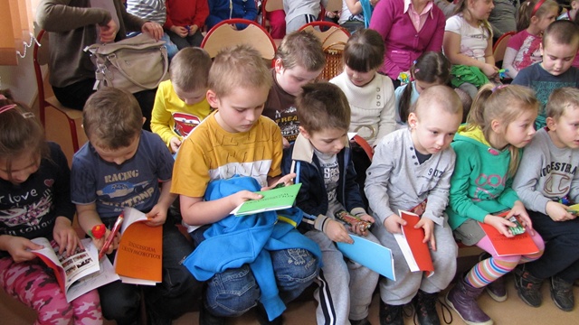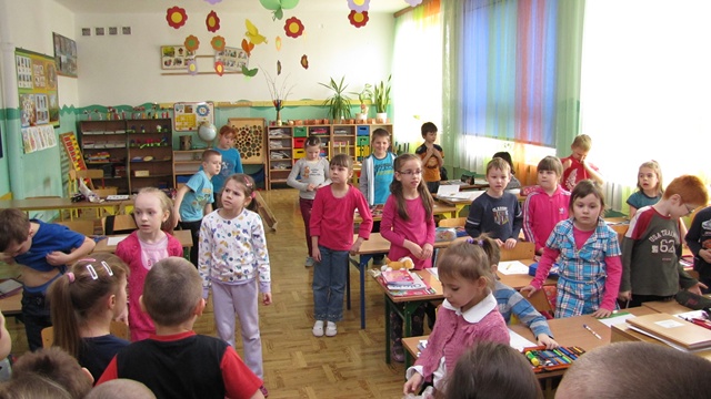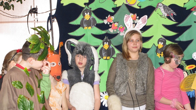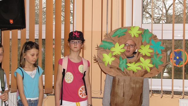 Każde mogło wybrać coś dla siebie. Jedne rzucały piłką do kosza, inne pokonywały tory przeszkód, jeszcze inne bawiły się kołem hula – hop. Na ich twarzach malowały się uśmiech i radość. Widać było, że są zadowolone. Potem zwiedzały szkołę. Odwiedziły sale klas I, II i oddział przedszkolny. Zobaczyły miejsca, w których uczą się ich starsze koleżanki i koledzy. Widziały jak można korzystać z tablicy interaktywnej, były na lekcji muzyki w kl. II, śpiewały z klasą piosenki. Dzień atrakcji zakończyła inscenizacja o tematyce ekologicznej „Wiosna w lesie”, którą przygotowali uczniowie kl. III a pod kierunkiem pani Alicji Dziedzic. Wartka, bardzo żywa część artystyczna bardzo podobała się przedszkolakom. Reagowały na różne rytmy muzyki klaskaniem, tupaniem i wspólnym śpiewem. Były szczęśliwe i zauroczone pobytem w szkole. Na koniec przedszkolaki otrzymały drobne upominki w postaci kolorowanek, słodyczy i drobnych wiosennych kwiatów wykonanych przez trzecioklasistów.