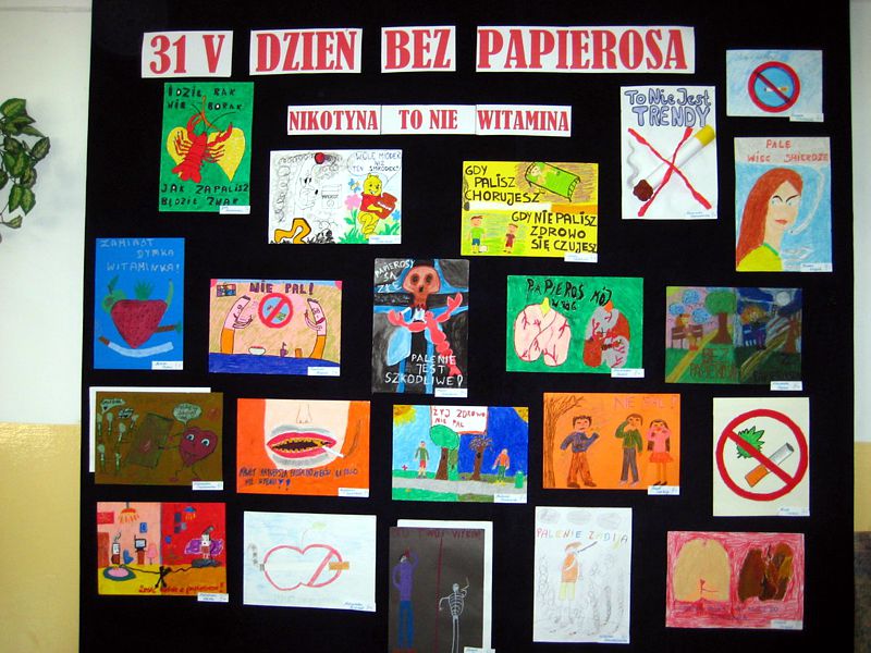 31 maja to „Dzień Bez Papierosa”. Z tej okazji 15.05.2013 r. w naszej szkole odbył się konkurs wiedzy na temat szkodliwości palenia papierosów pod hasłem „Nikotyna to nie witamina”. Konkurs zorganizowano dla uczniów klas IV-VI w ramach programu profilaktyki palenia tytoniu „Znajdź właściwe rozwiązanie”. Wszyscy uczestnicy otrzymali dyplomy a najlepsi nagrody. Oto wyniki konkursu: