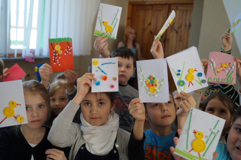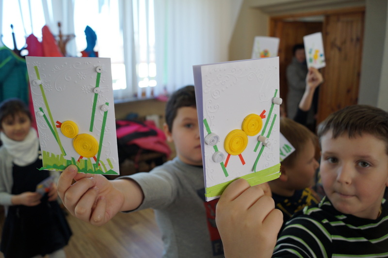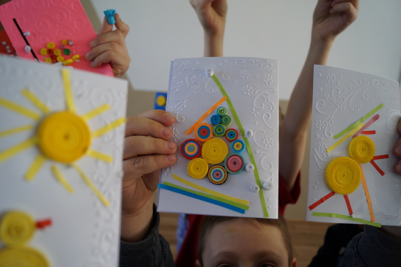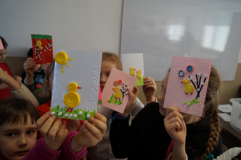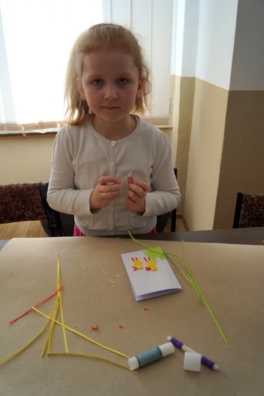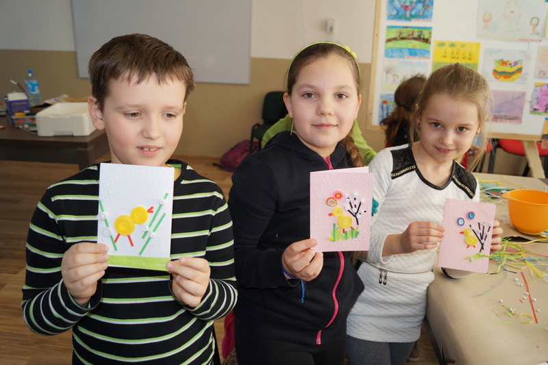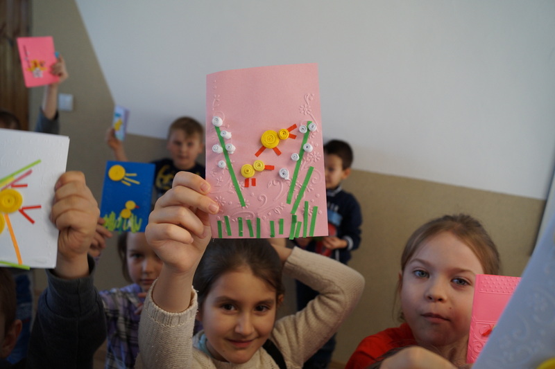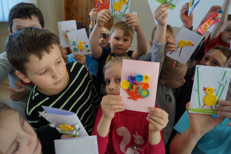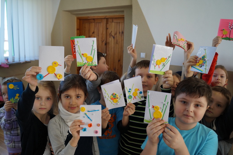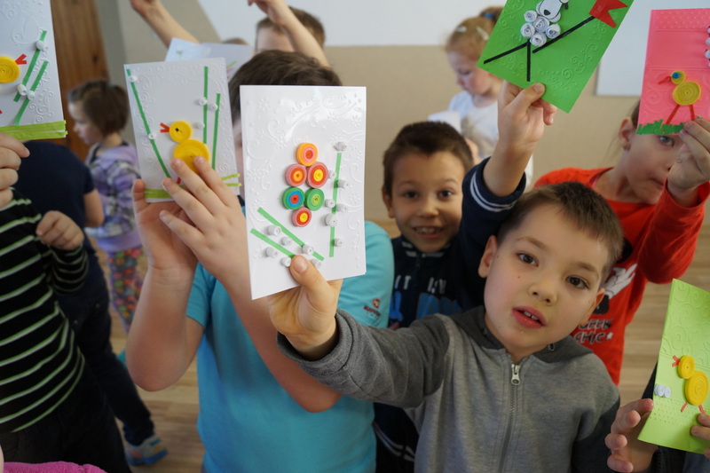 Gospodarze zaprezentowali kartki wielkanocne wykonane techniką quilingu, która jest wprawdzie bardzo pracochłonna, ale zawsze daje czarujące efekty. Pierwszakom udało się wykonać oryginalną kompozycję i każdy z nich miał potrzebę zaprezentowania jej osobom dorosłym, starszym kolegom i rówieśnikom. Ileż padło pięknych słów, dotyczących pracy, wyobraźni, efektu końcowego oraz pomysłu wykorzystania ozdoby przez same dzieci. Najtrafniej, a zarazem najprościej opisać towarzyszące emocje w/w sentencją J. Silberga „Jeśli jesteś (…), wtedy rosnę jak na drozdżach”.
