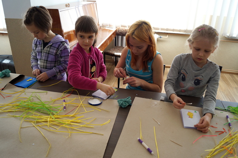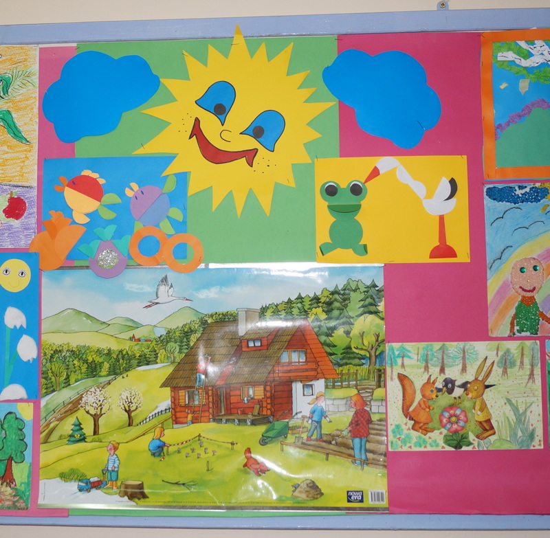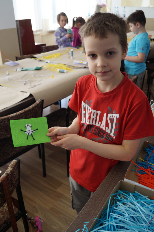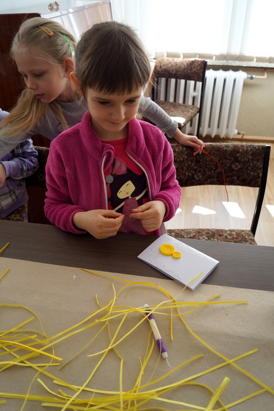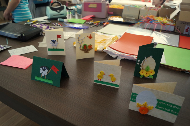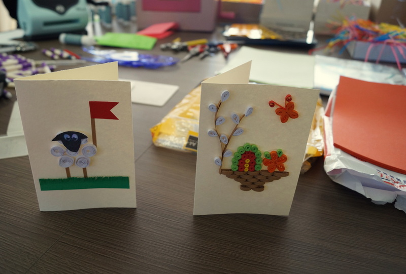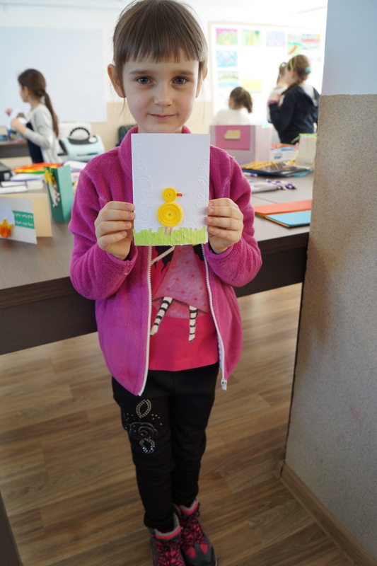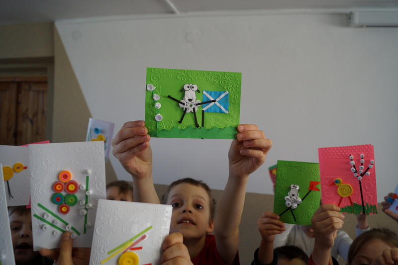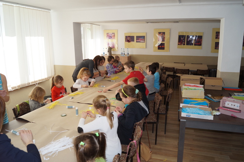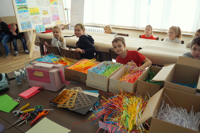 Gospodarze zaprezentowali kartki wielkanocne wykonane techniką quilingu, która jest wprawdzie bardzo pracochłonna, ale zawsze daje czarujące efekty. Pierwszakom udało się wykonać oryginalną kompozycję i każdy z nich miał potrzebę zaprezentowania jej osobom dorosłym, starszym kolegom i rówieśnikom. Ileż padło pięknych słów, dotyczących pracy, wyobraźni, efektu końcowego oraz pomysłu wykorzystania ozdoby przez same dzieci. Najtrafniej, a zarazem najprościej opisać towarzyszące emocje w/w sentencją J. Silberga „Jeśli jesteś (…), wtedy rosnę jak na drozdżach”.